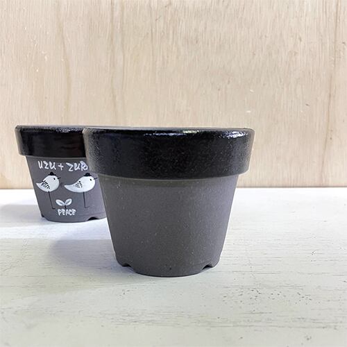 人気の「うずとずら」のイラストを描いたグレーの3号素焼き鉢♪