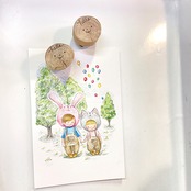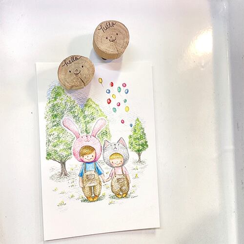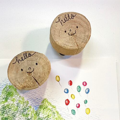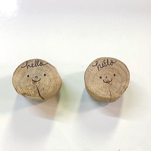 流木を輪切りにしたものにイラストを入れてマグネットにしました♪