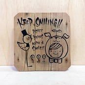 古い木の作陶台にペイントしたイラストパネルです。