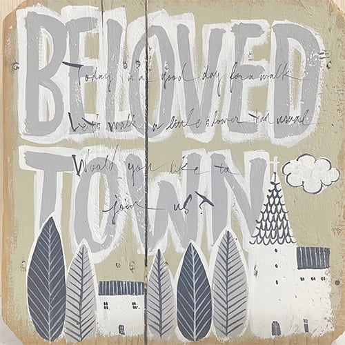 ベージュの背景にかわいい町並みのイラストです!!