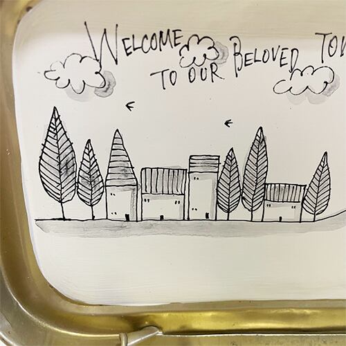 蓋を加工して背景サインに仕立てました。