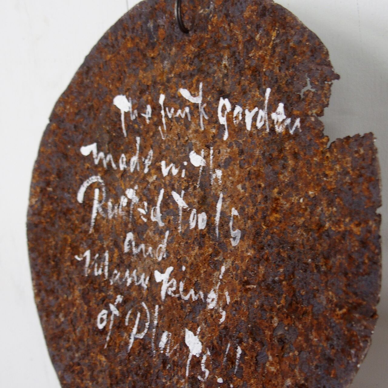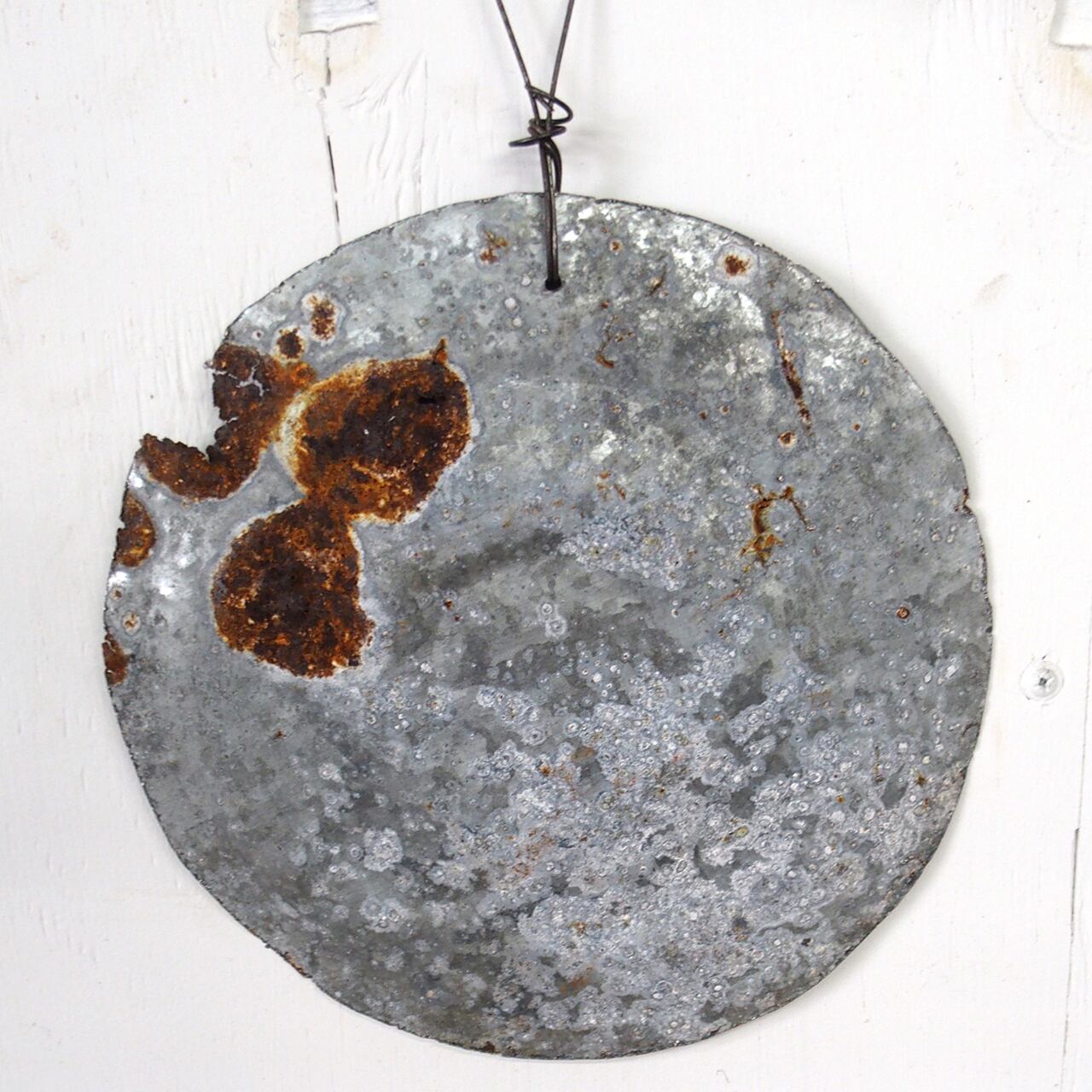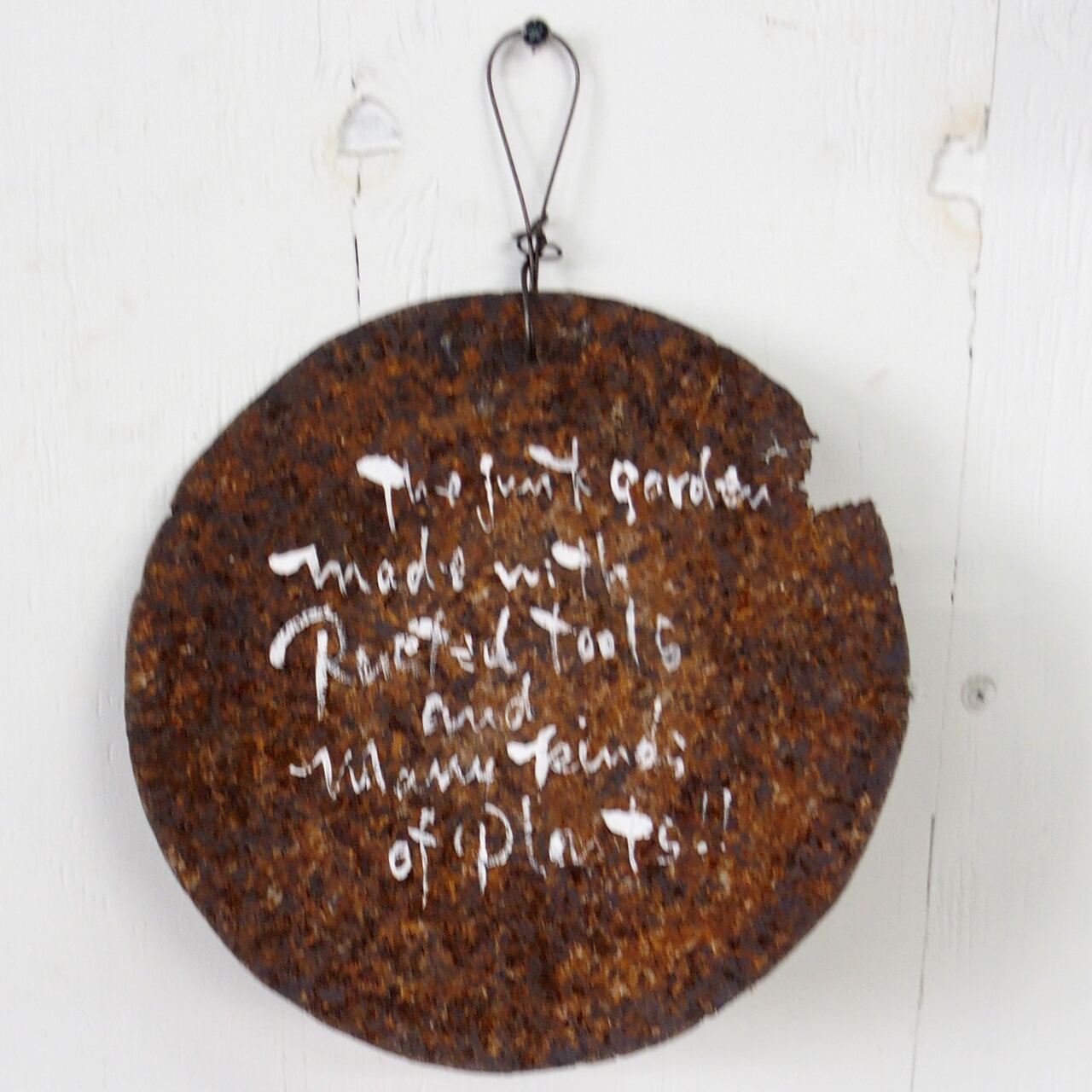 丸いサビサビのブリキに文字を入れたサインです。