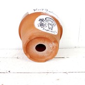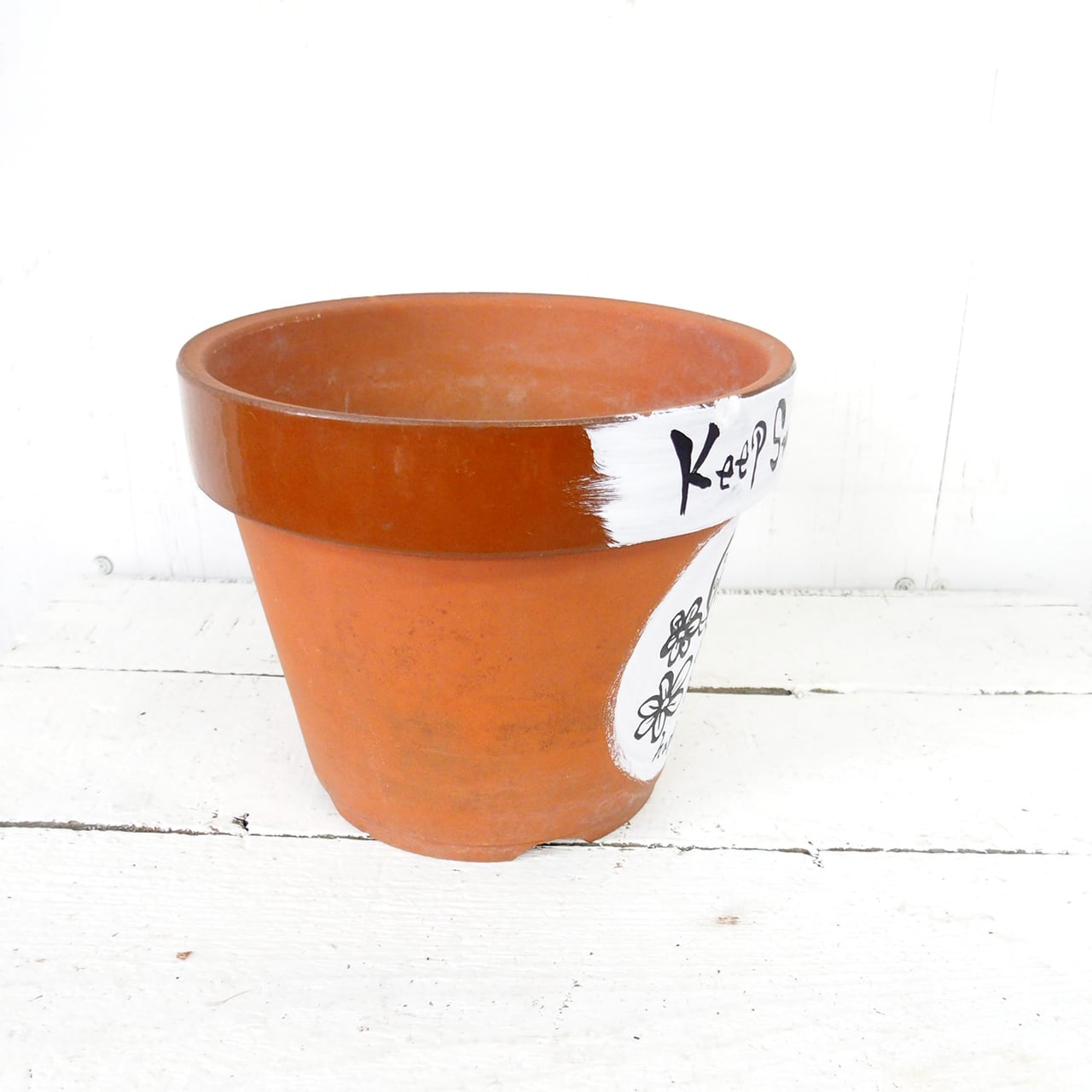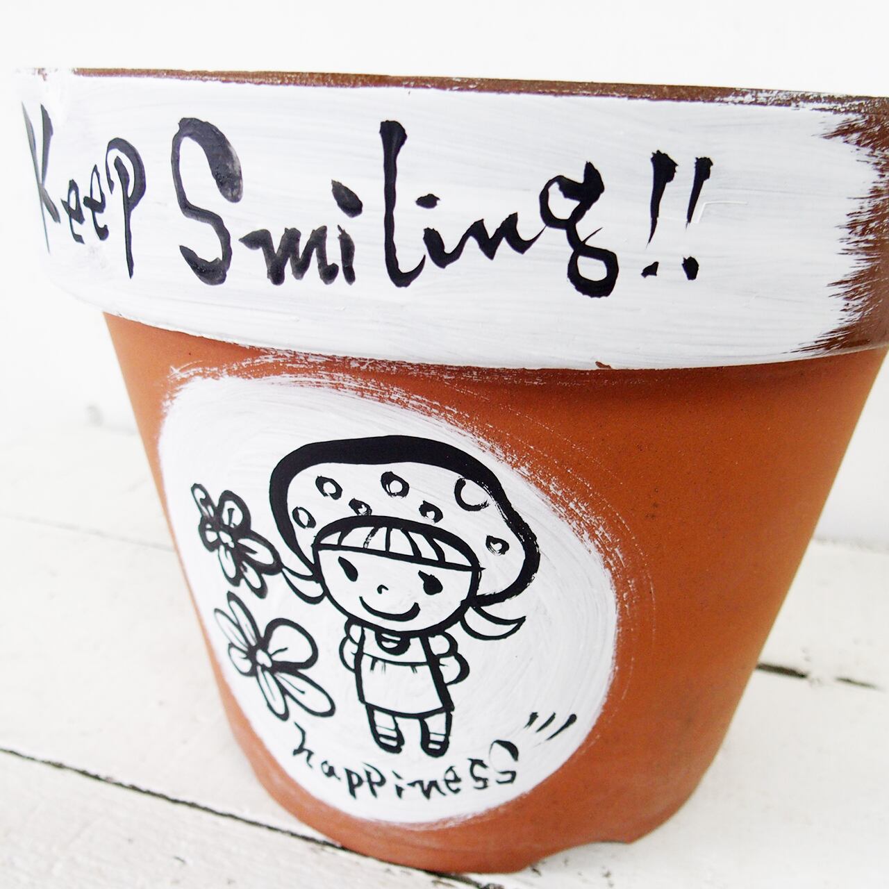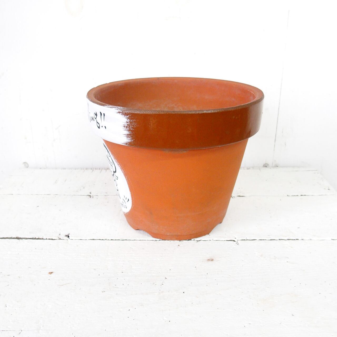 デッドストックの素焼き鉢にイラストと文字をペイントしました。