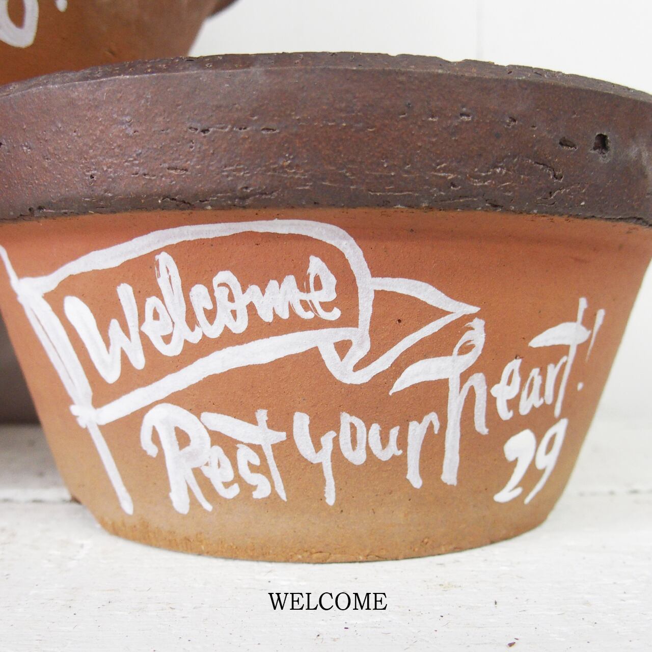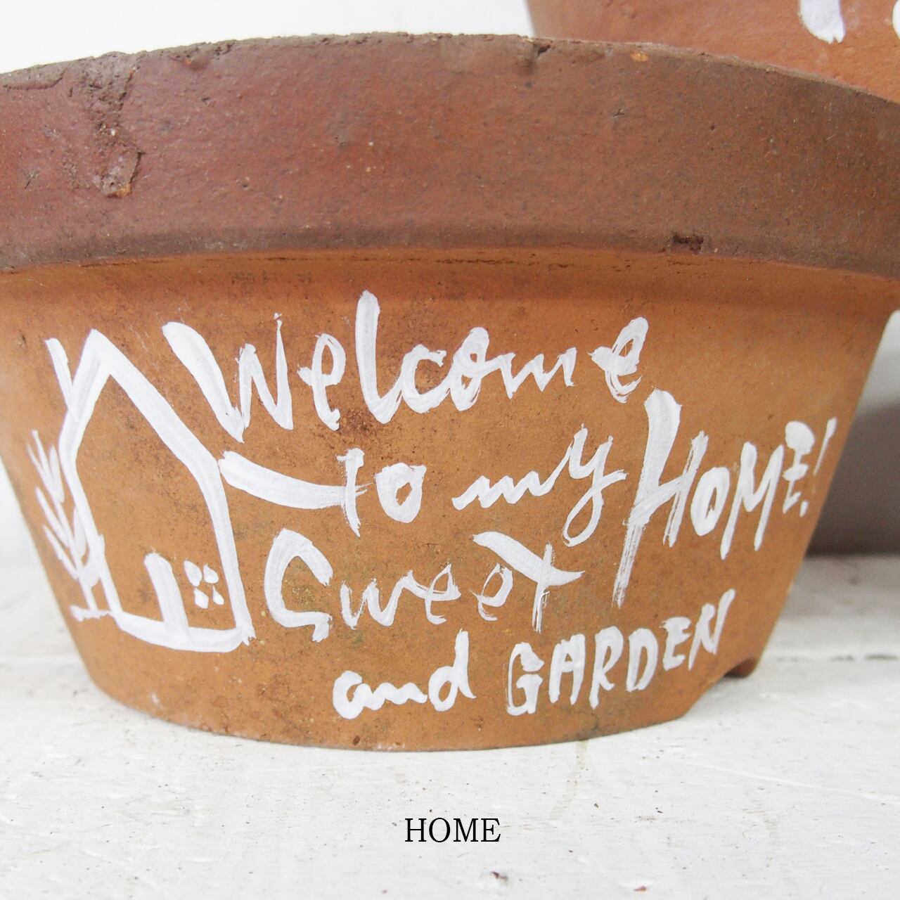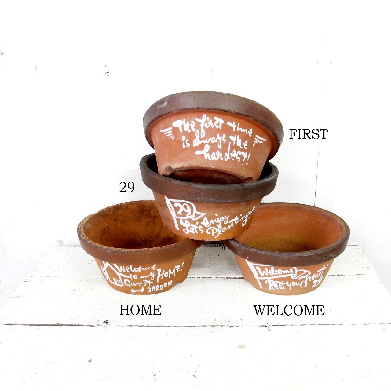 デッドストックの素焼き鉢にイラストと文字をペイントしました。