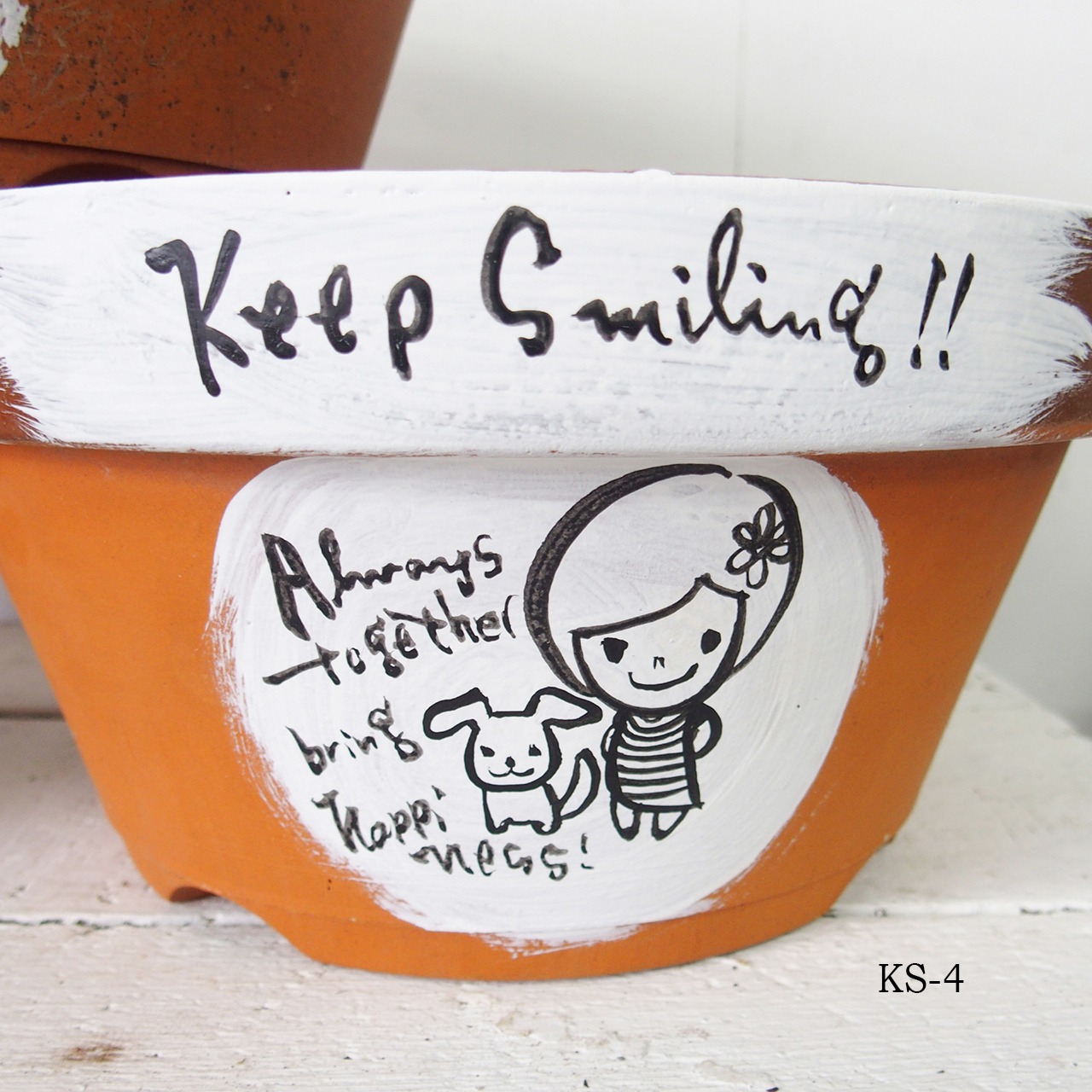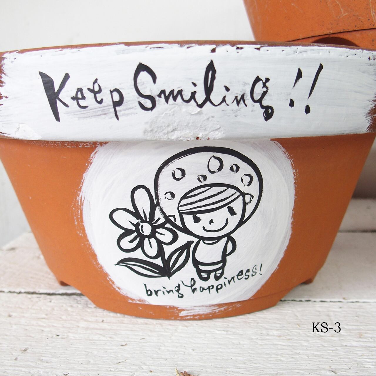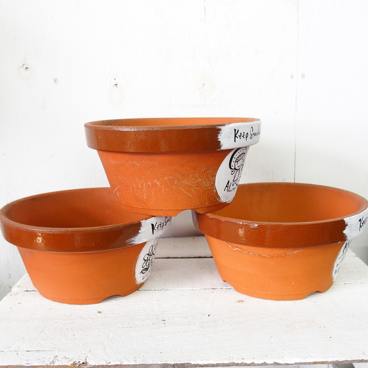 デッドストックの素焼き鉢にイラストと文字をペイントしました。