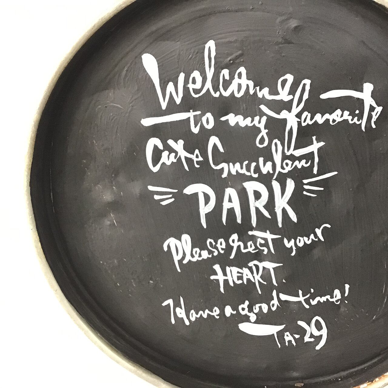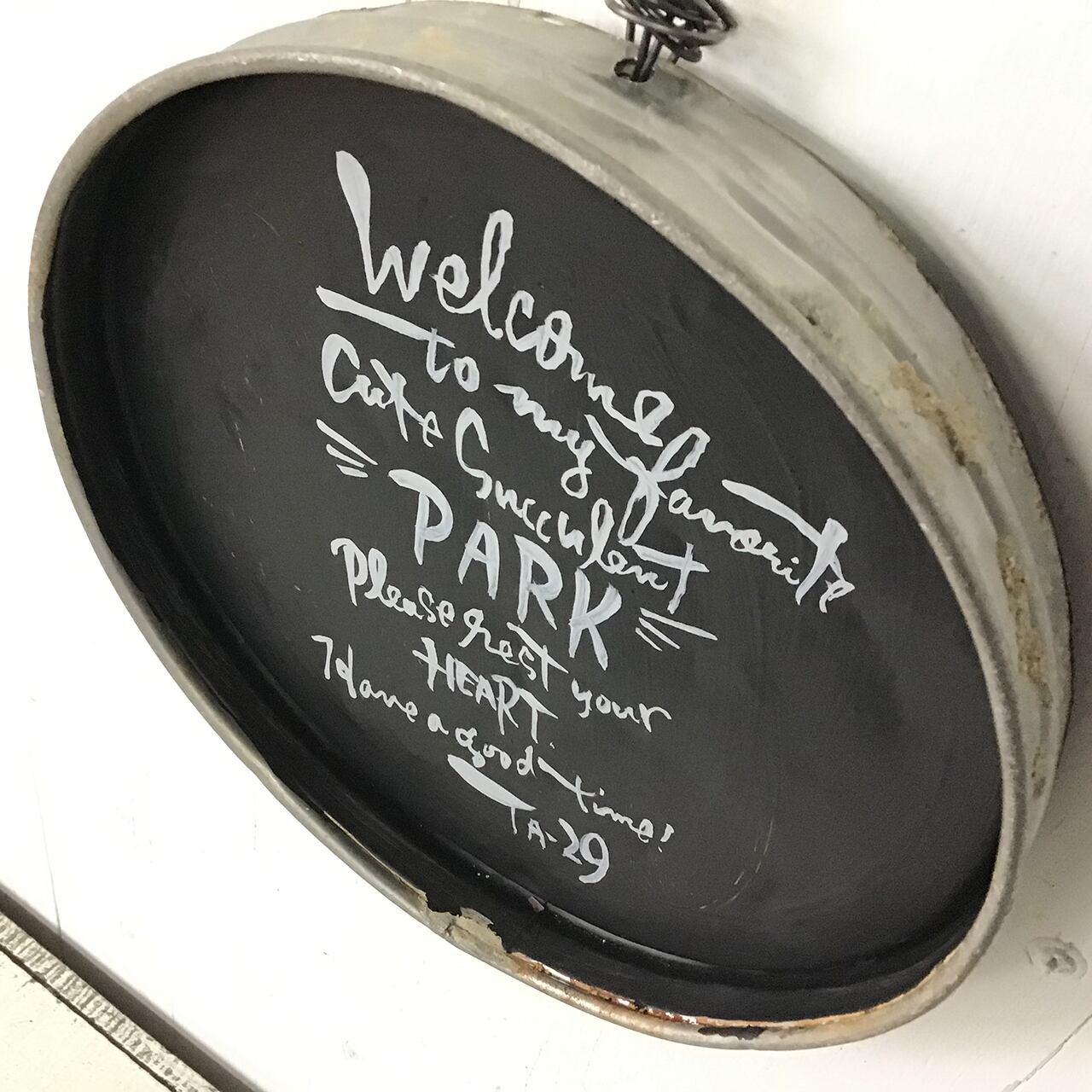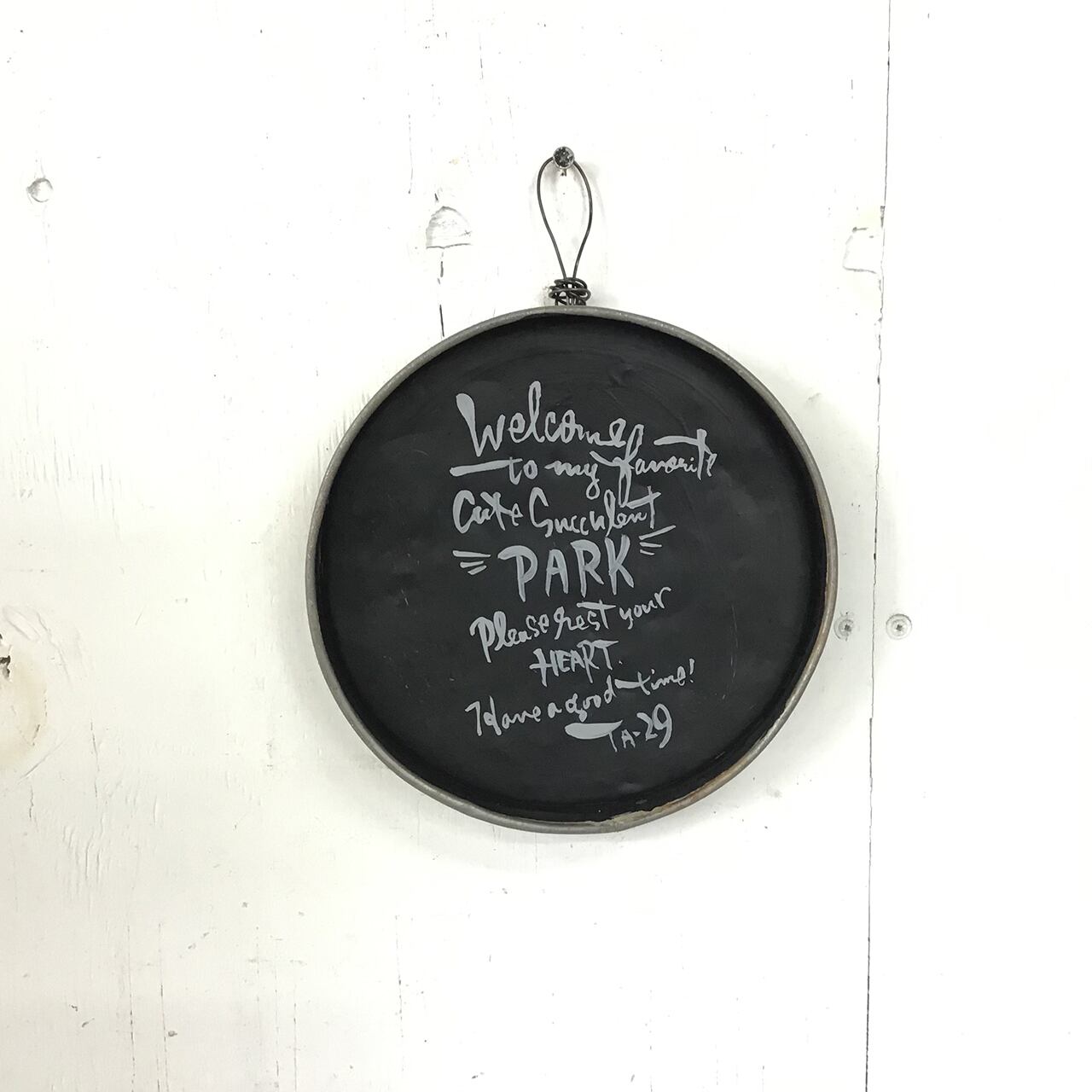 丸いブリキに文字を入れたサインです。