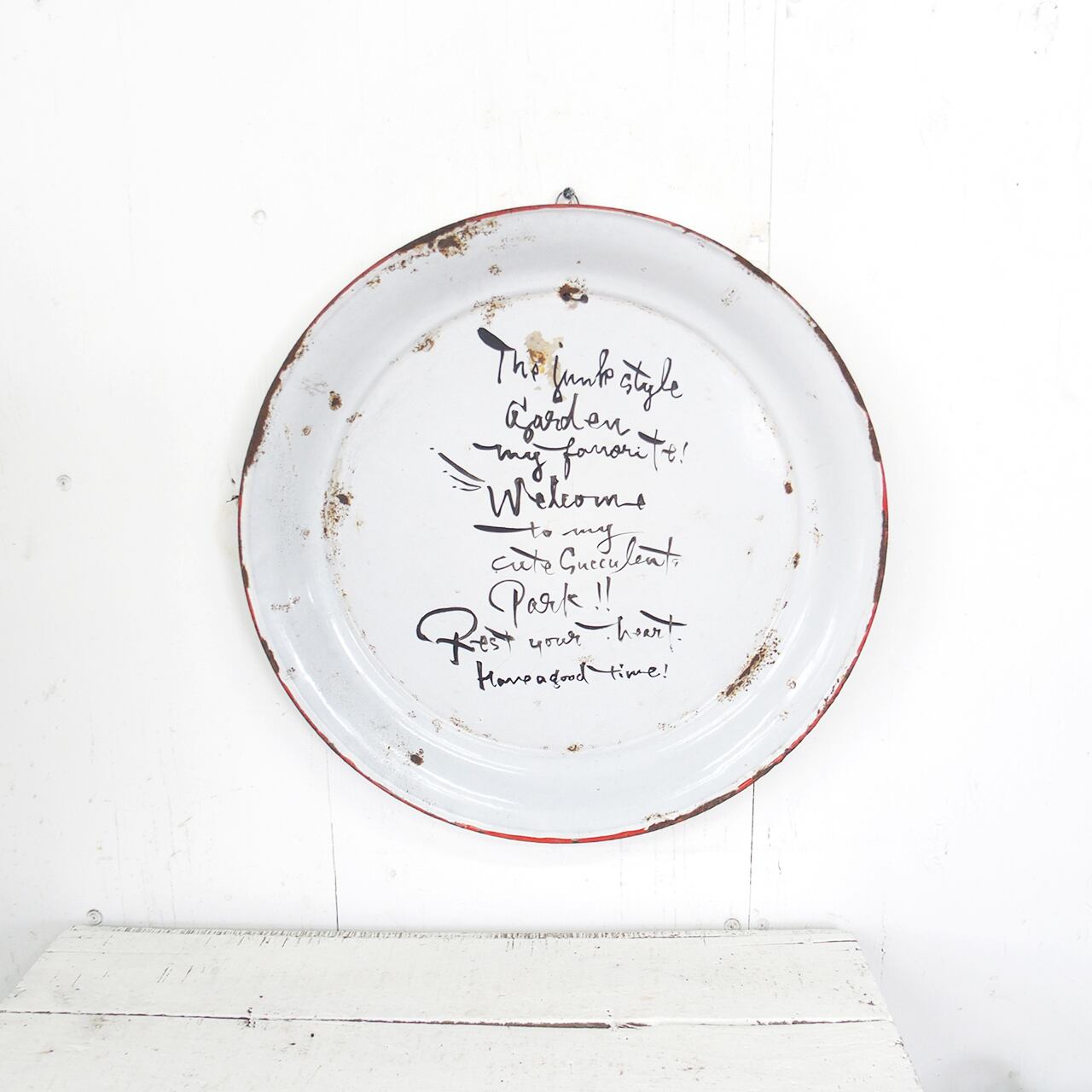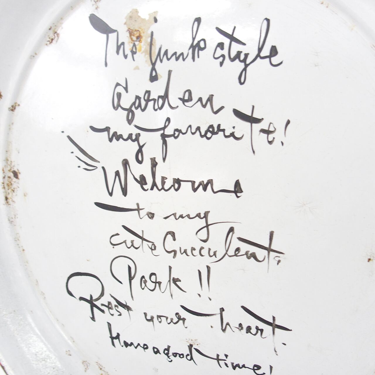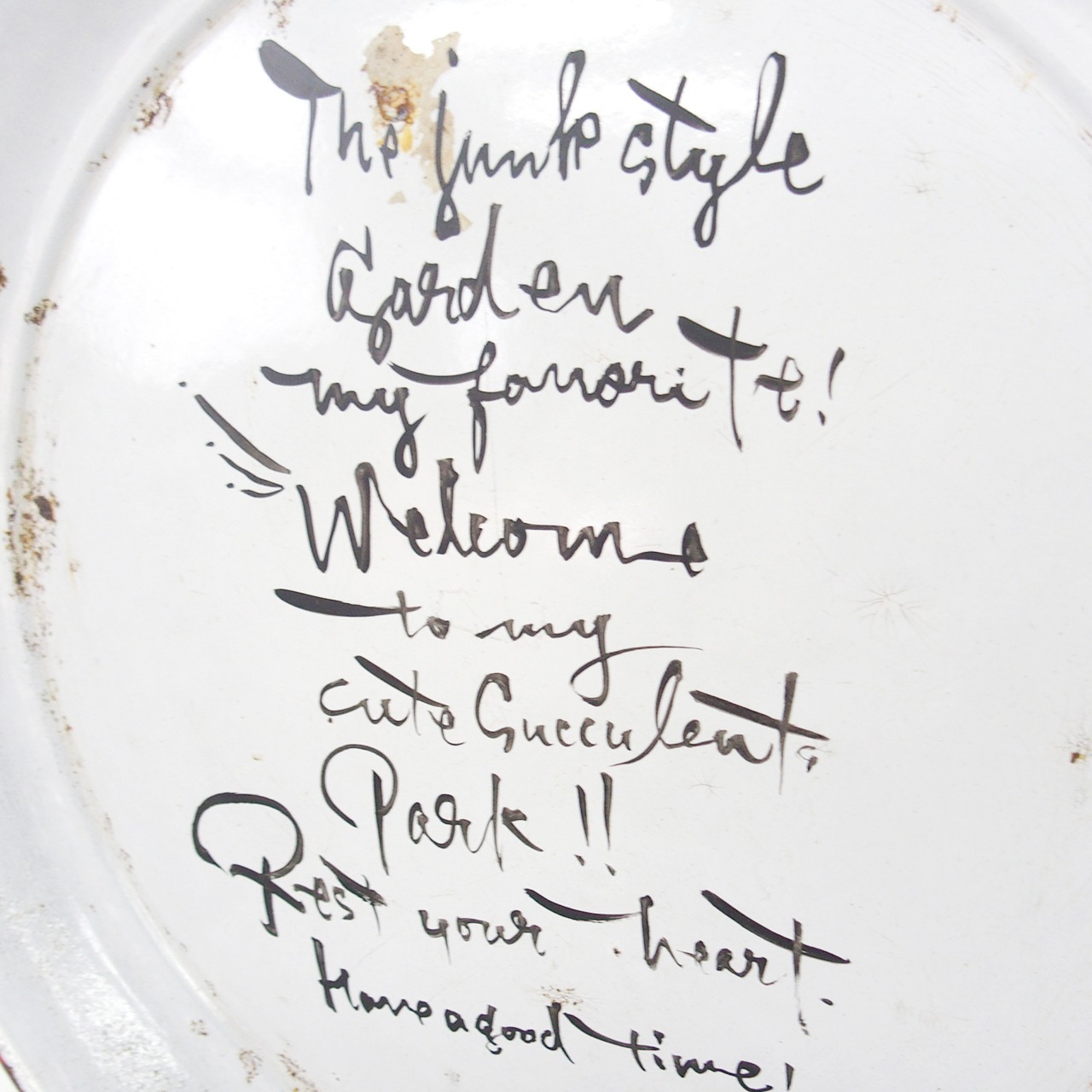 古いホーローの丸皿に文字を書き込んだガーデンサインです!