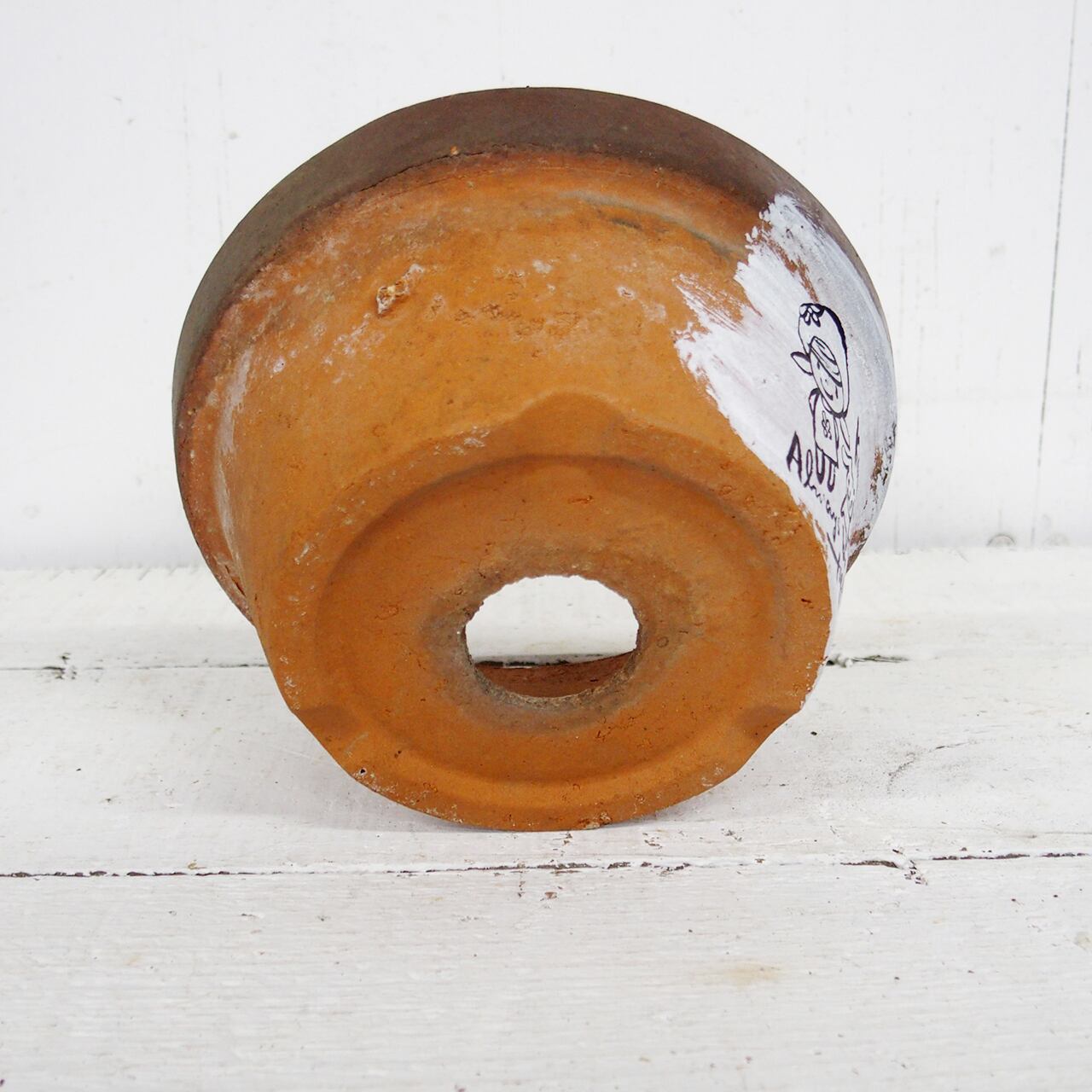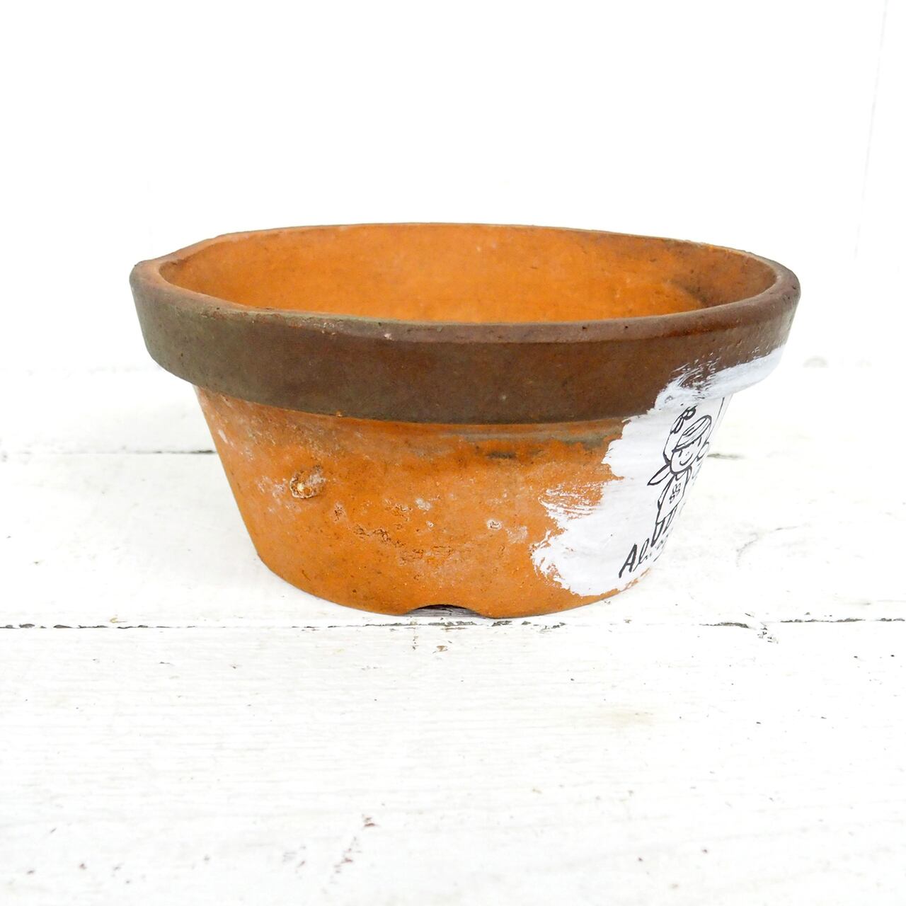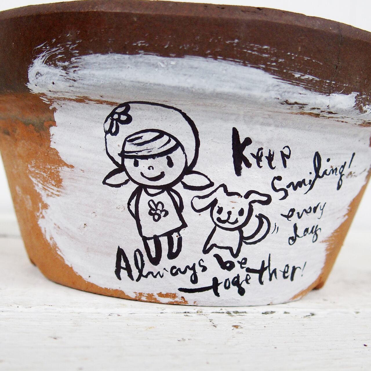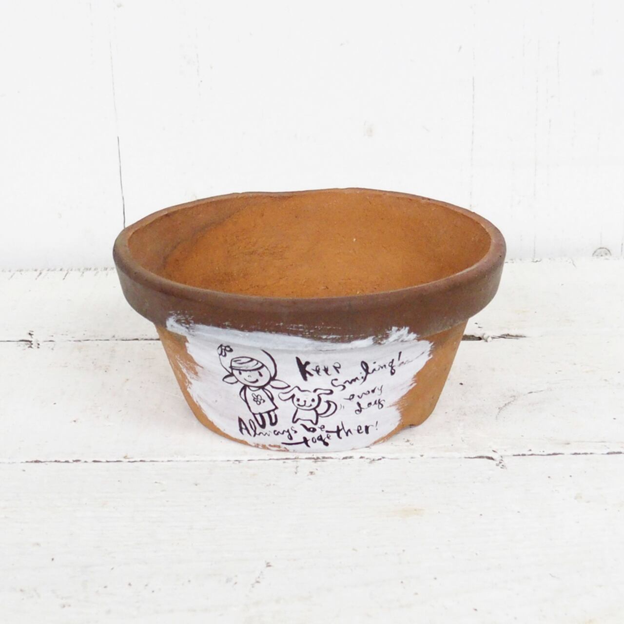 デッドストックの素焼き鉢にイラストと文字をペイントしました。