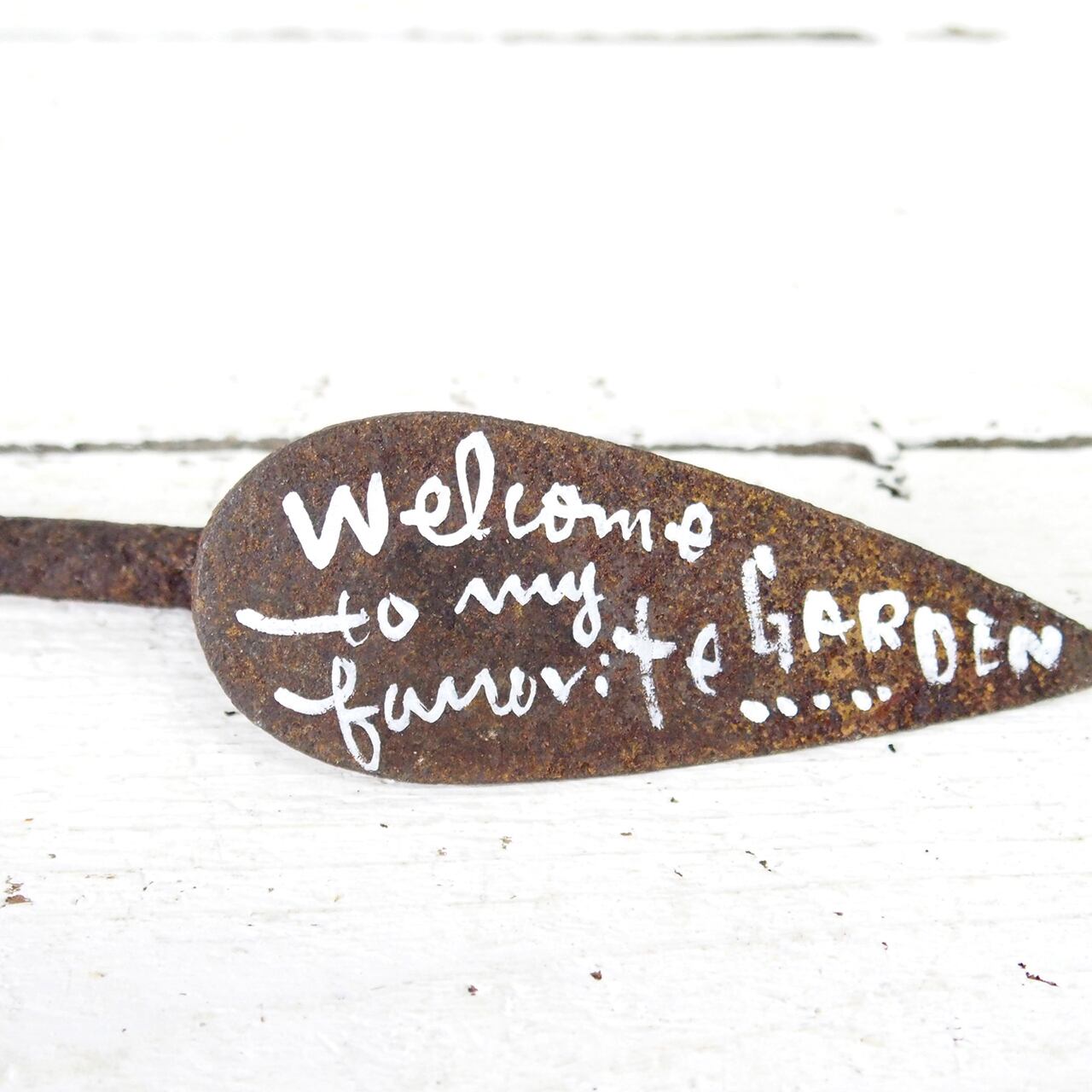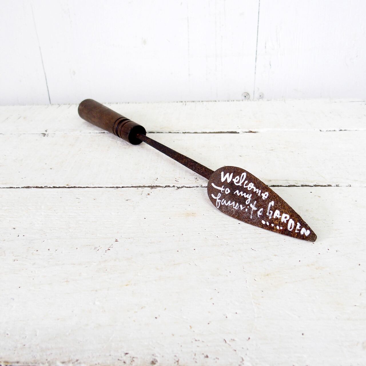 古いコテに文字を書き込んだガーデンサインです!