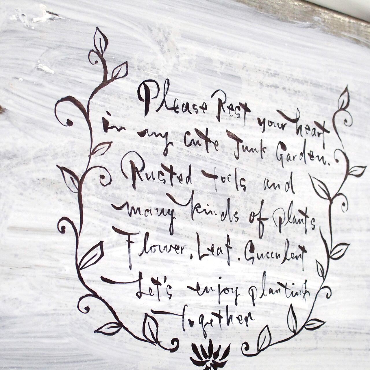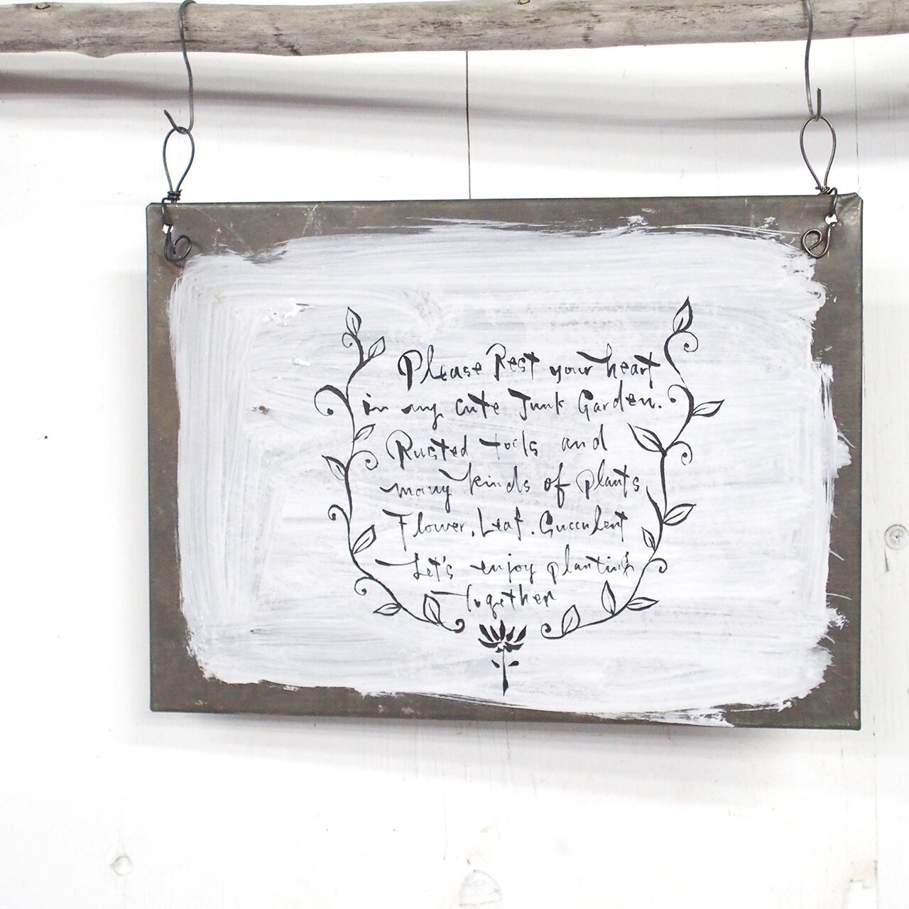 四角い缶の蓋に文字とイラストを入れたサインです。