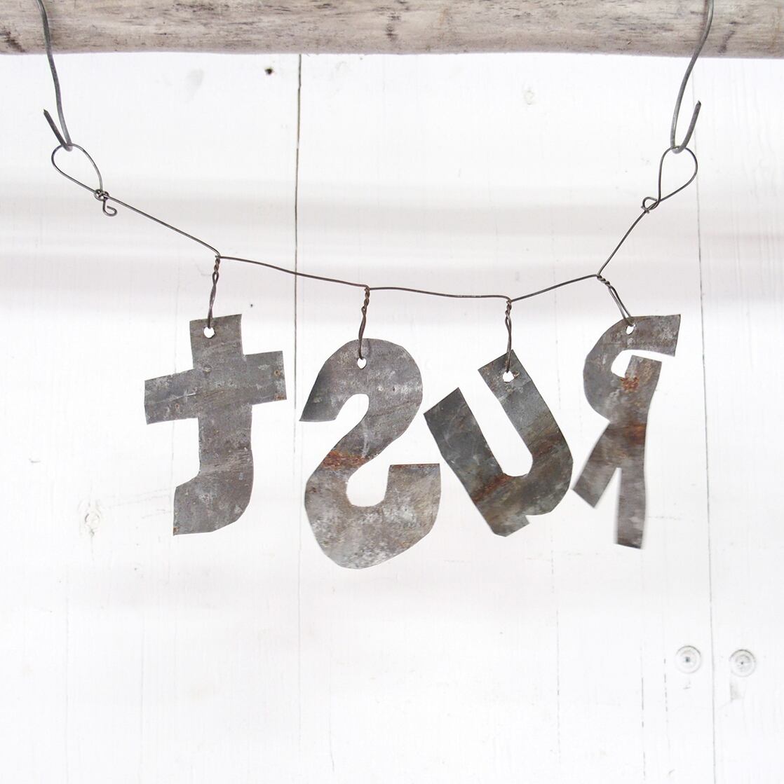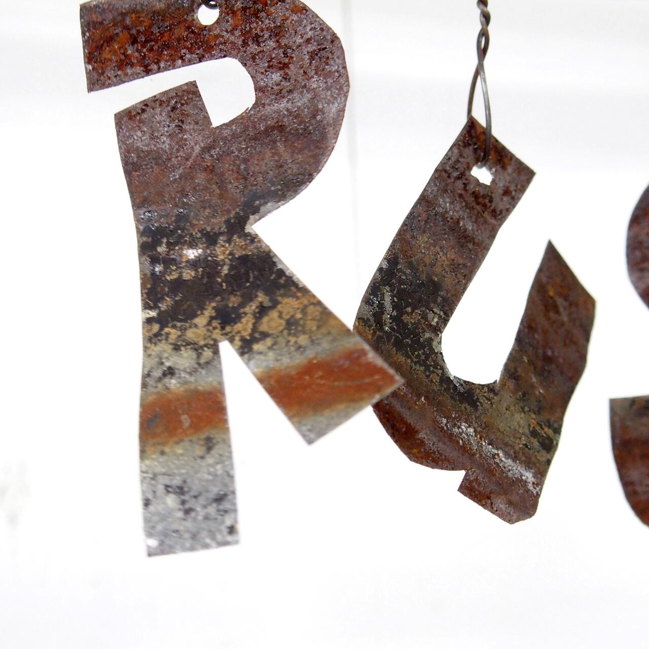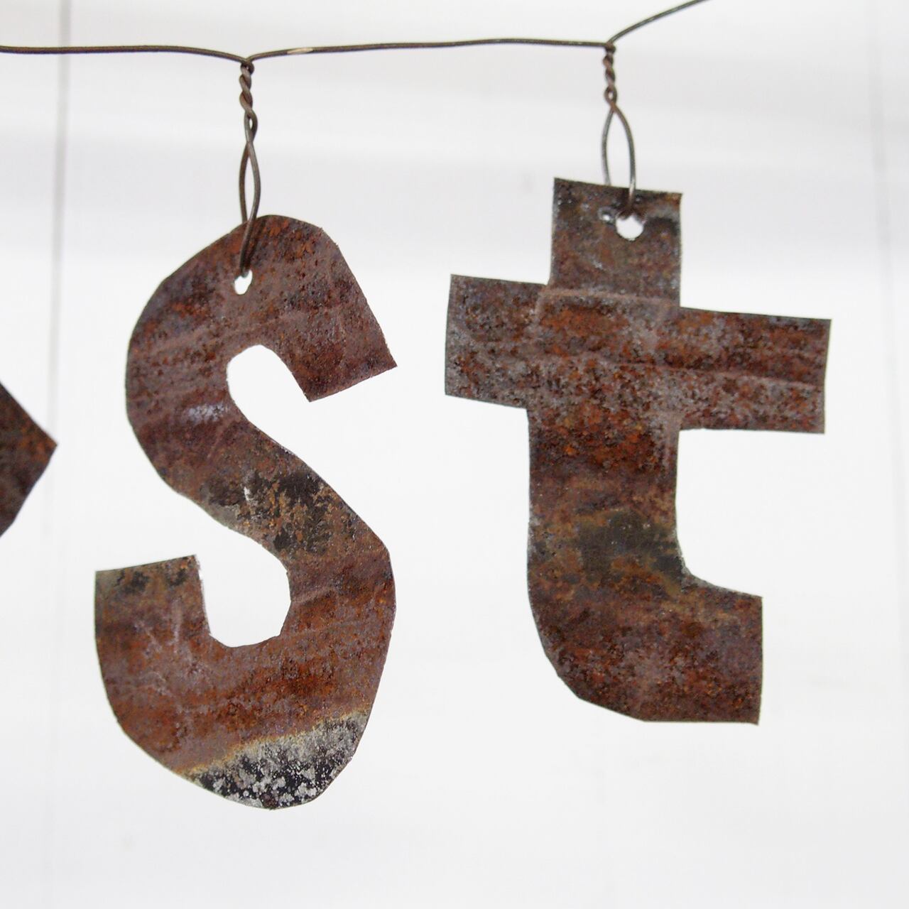 使い古されたサビサビのトタンを切った文字を繋げたガーランドです♪