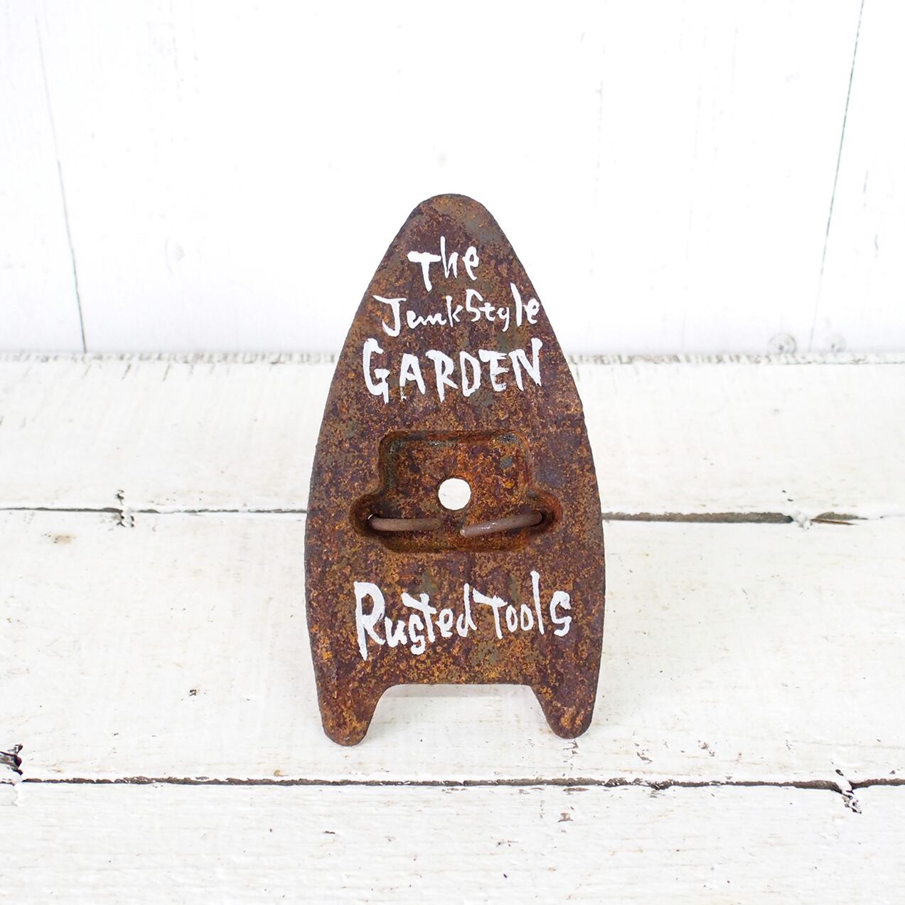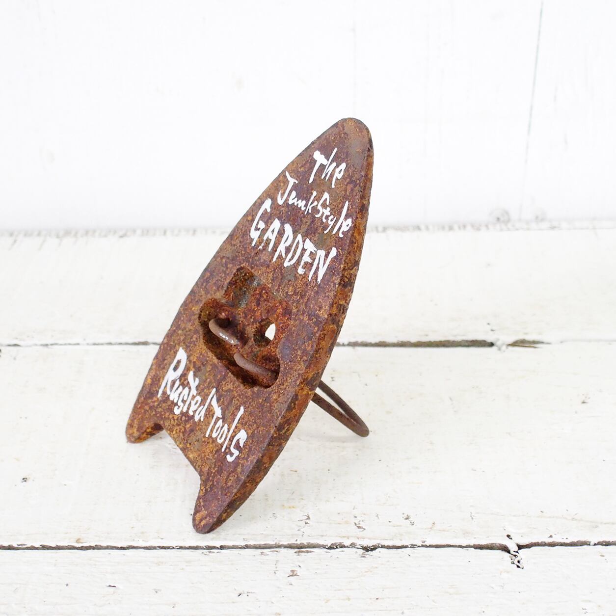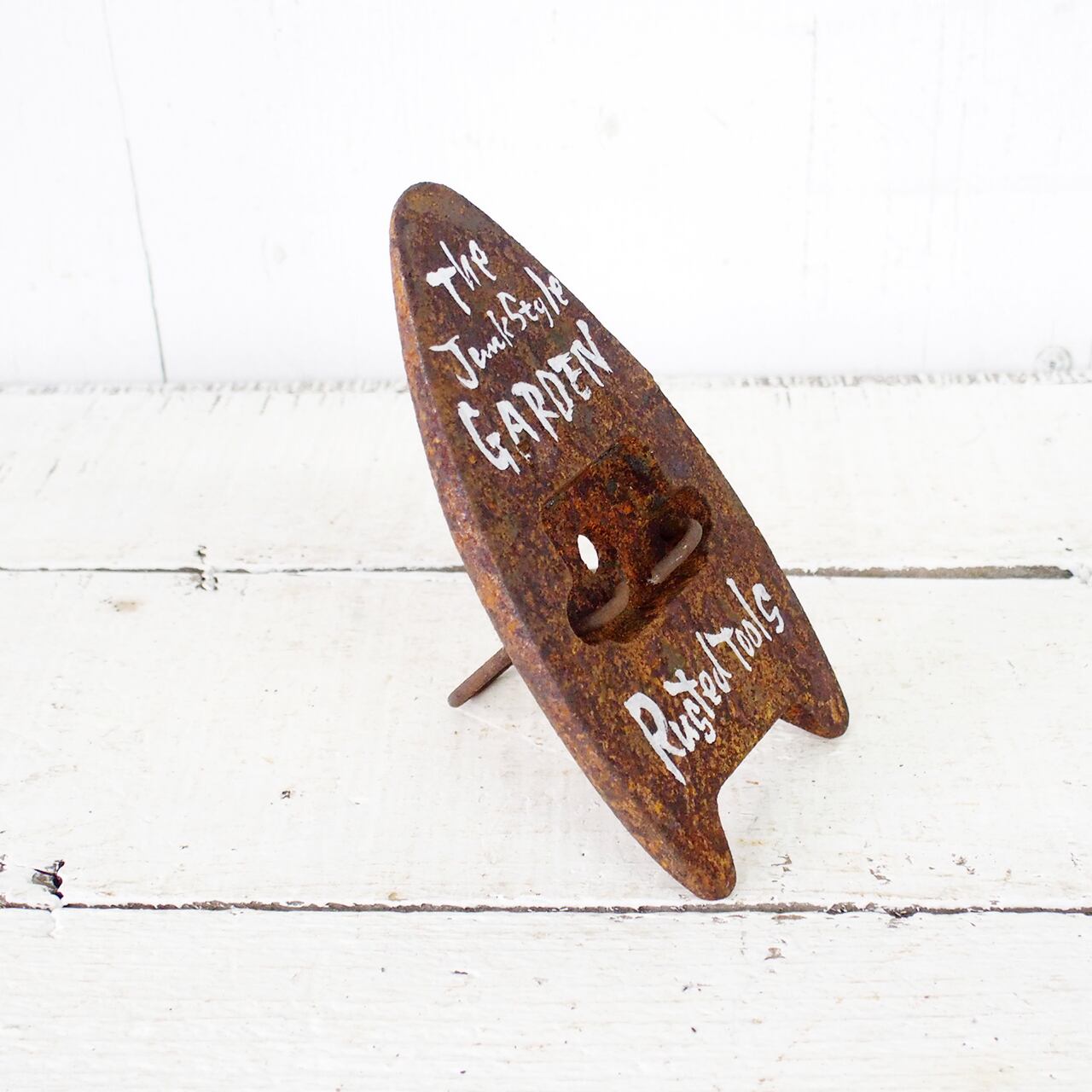 サビサビの古いアイロンに文字を入れたガーデンサインです。