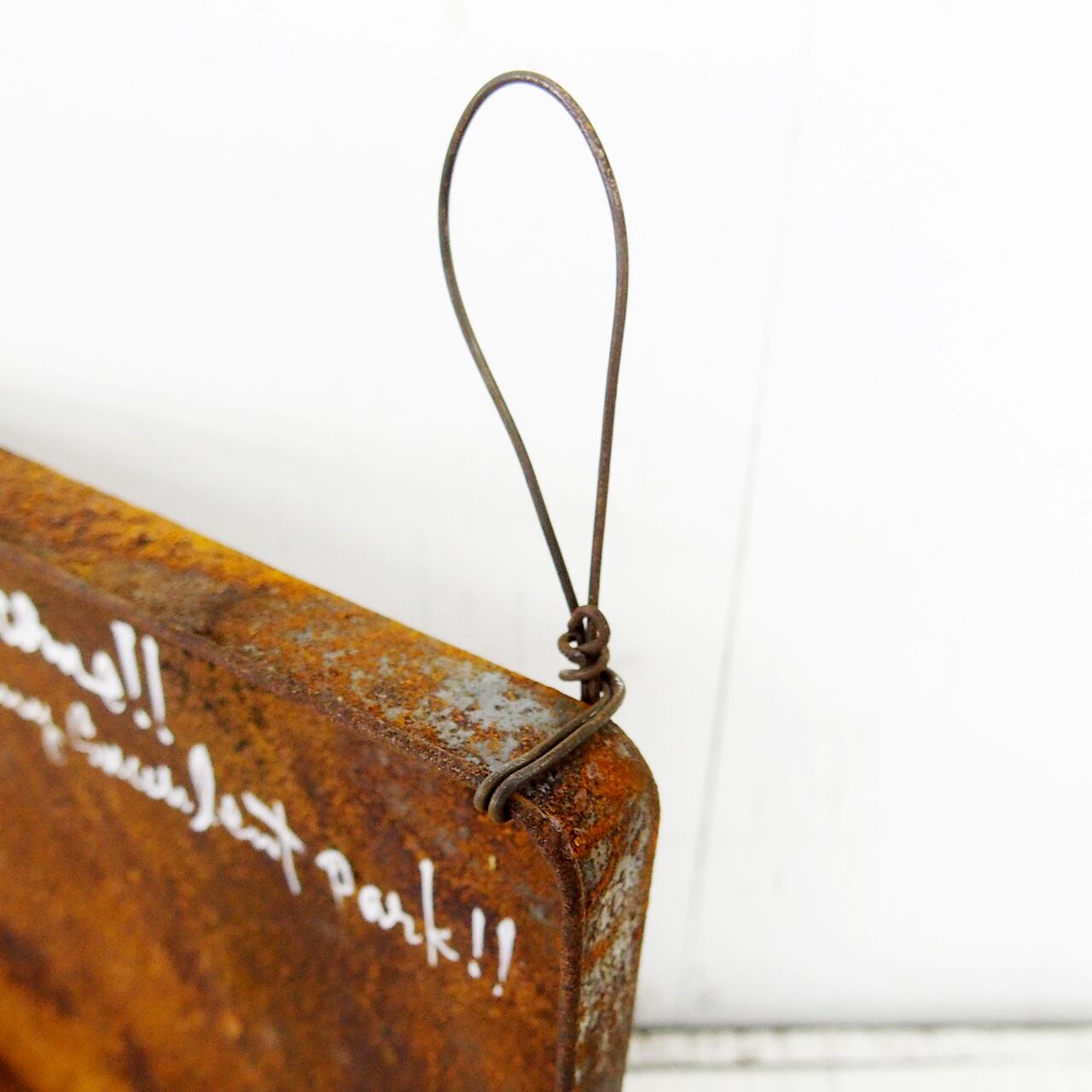 四角い缶の蓋に文字を入れたサインの下に