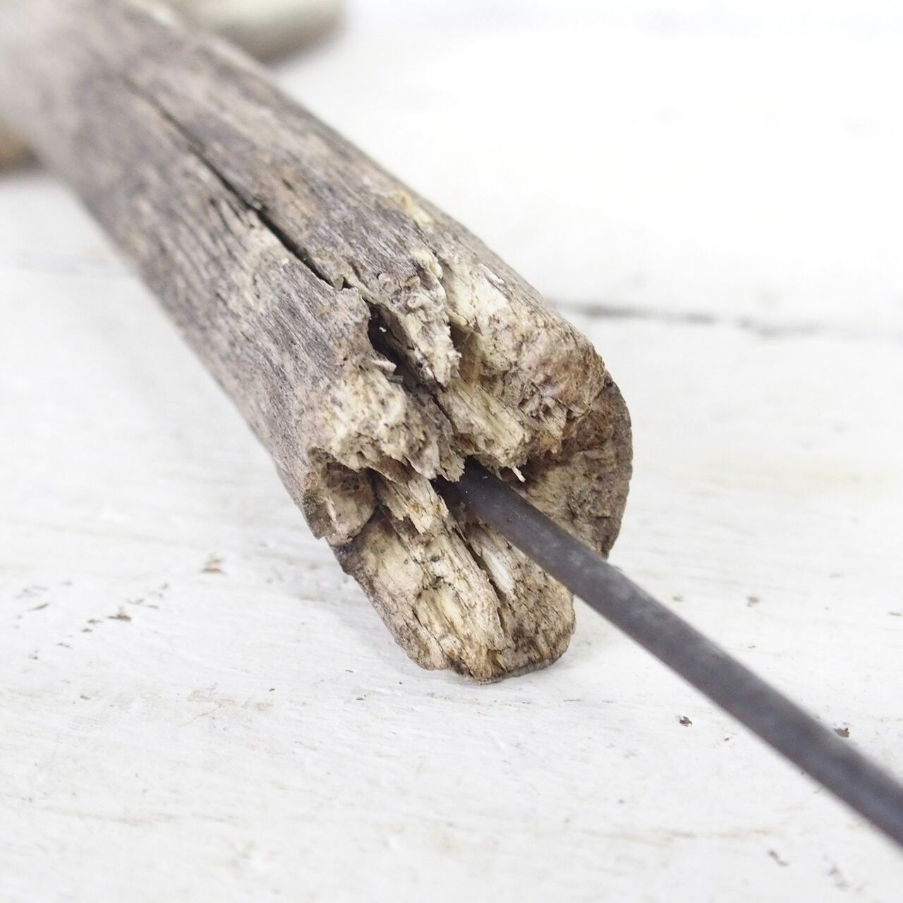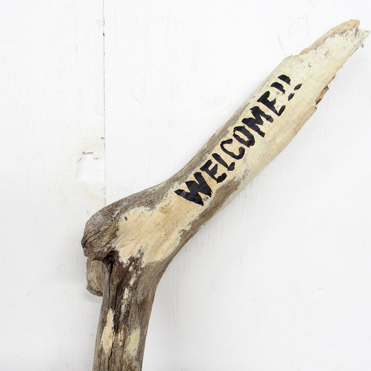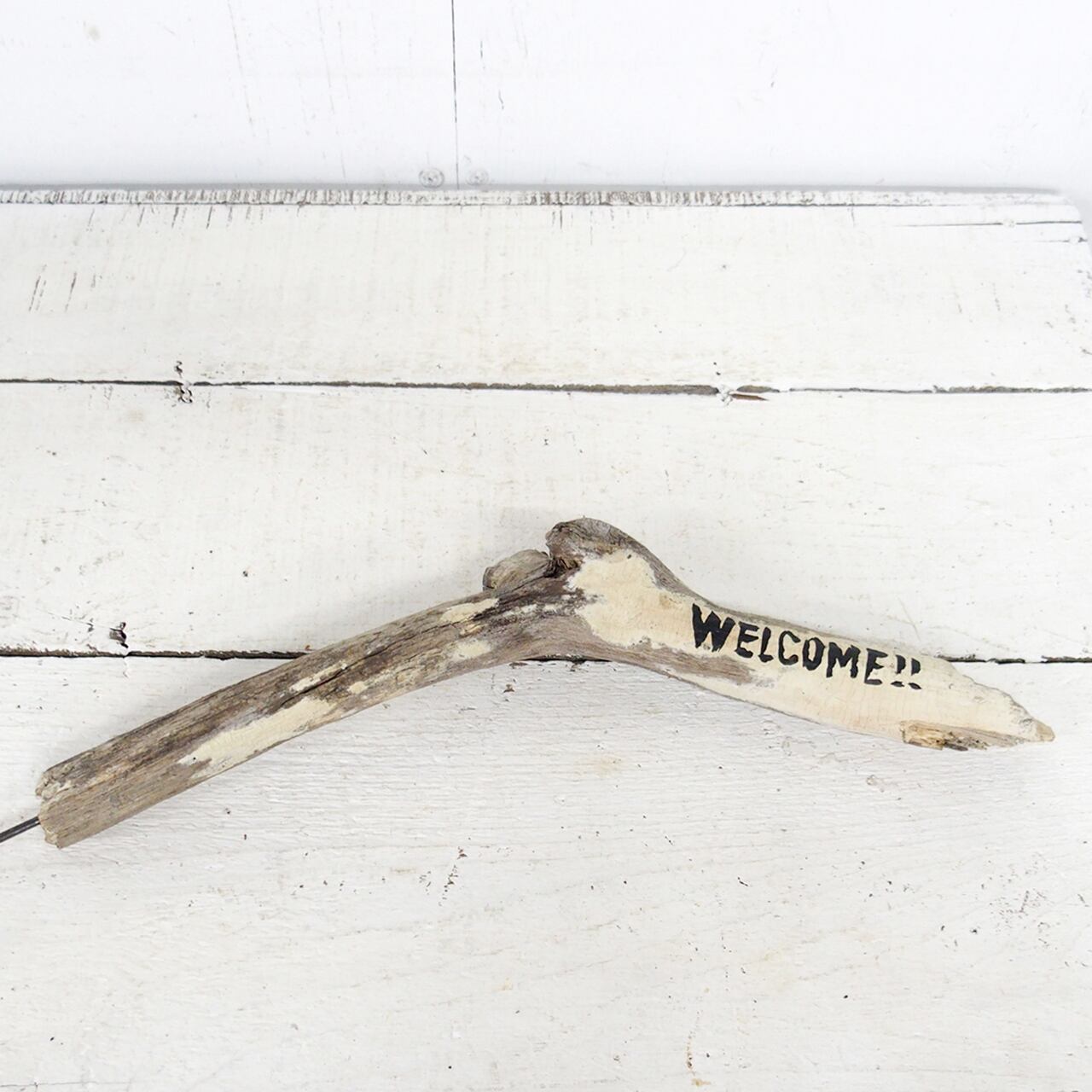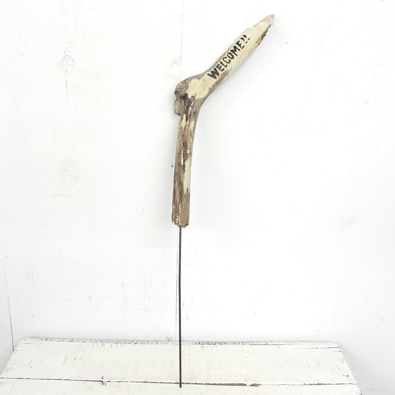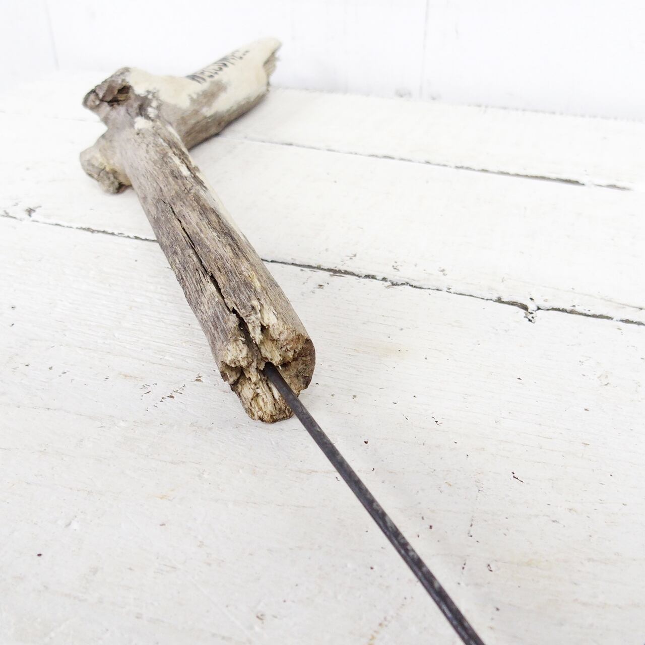 流木に文字を入れ太目の針金を差し込んだ
