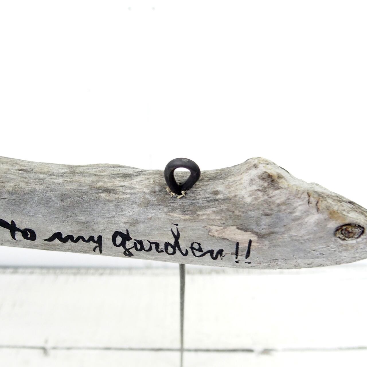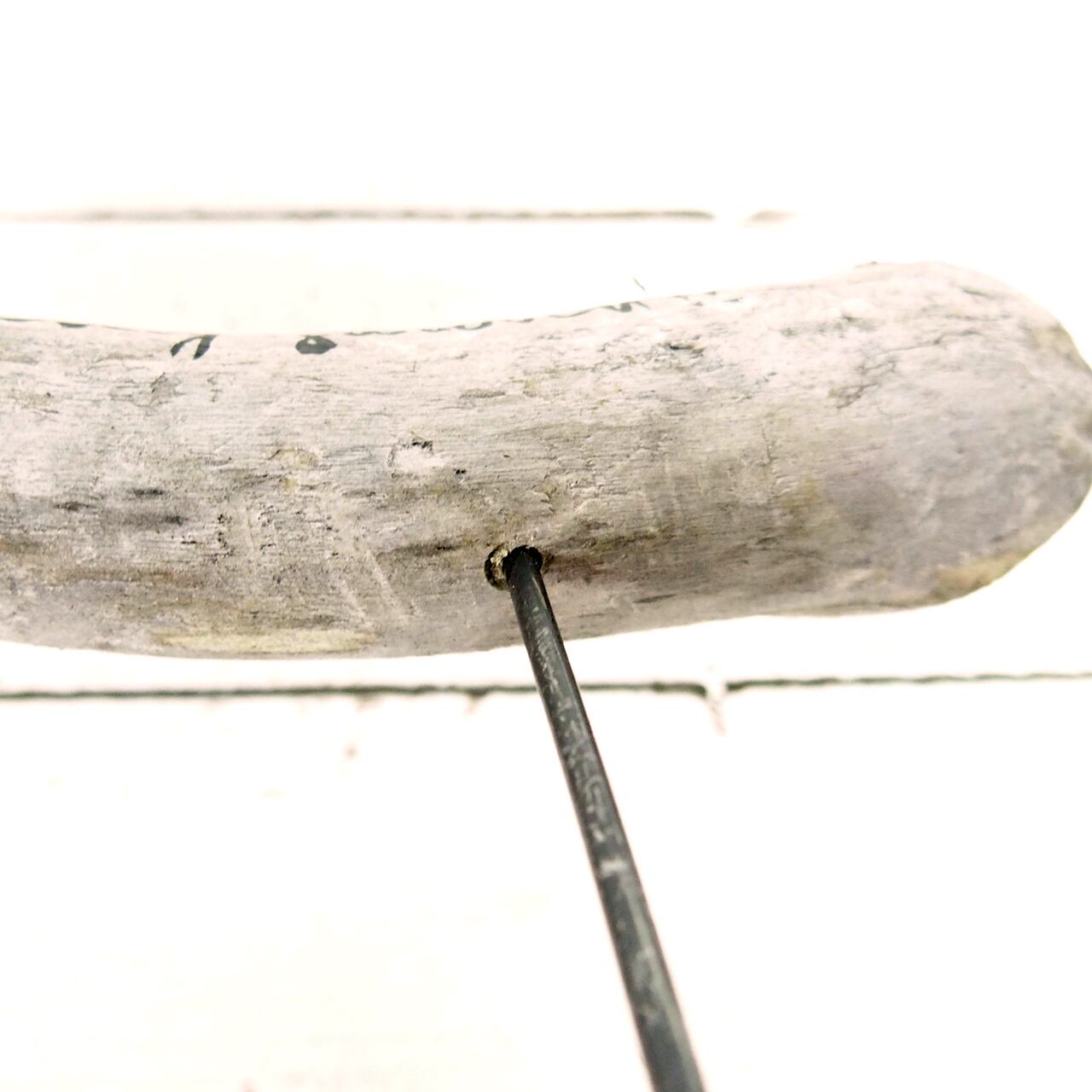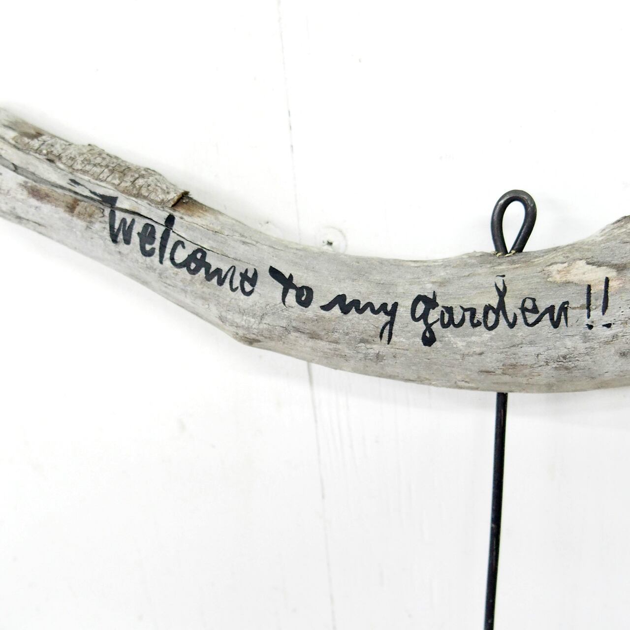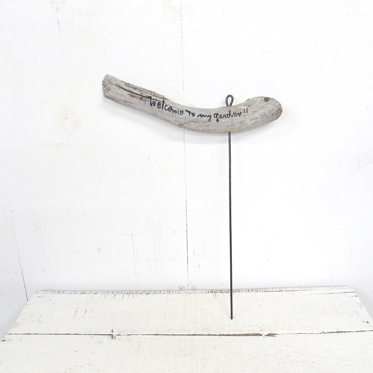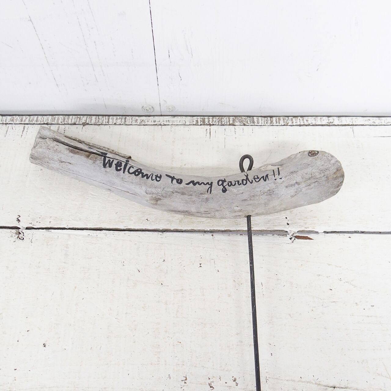 流木に文字を入れ太目の針金を差し込んだ