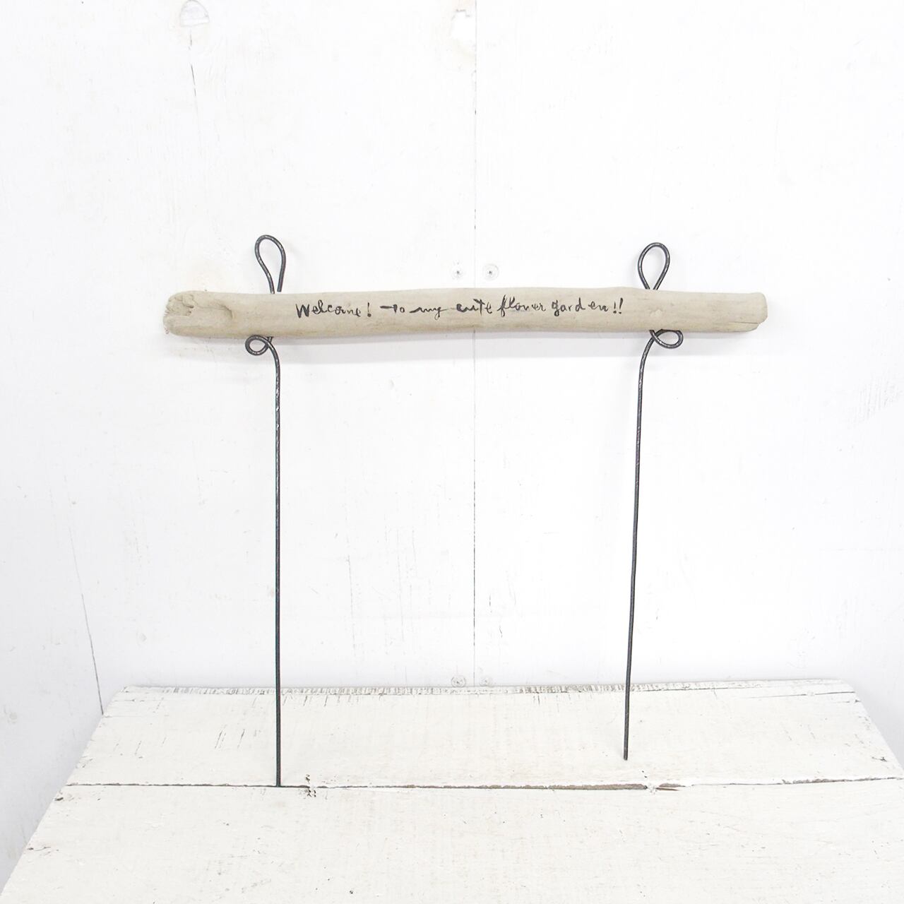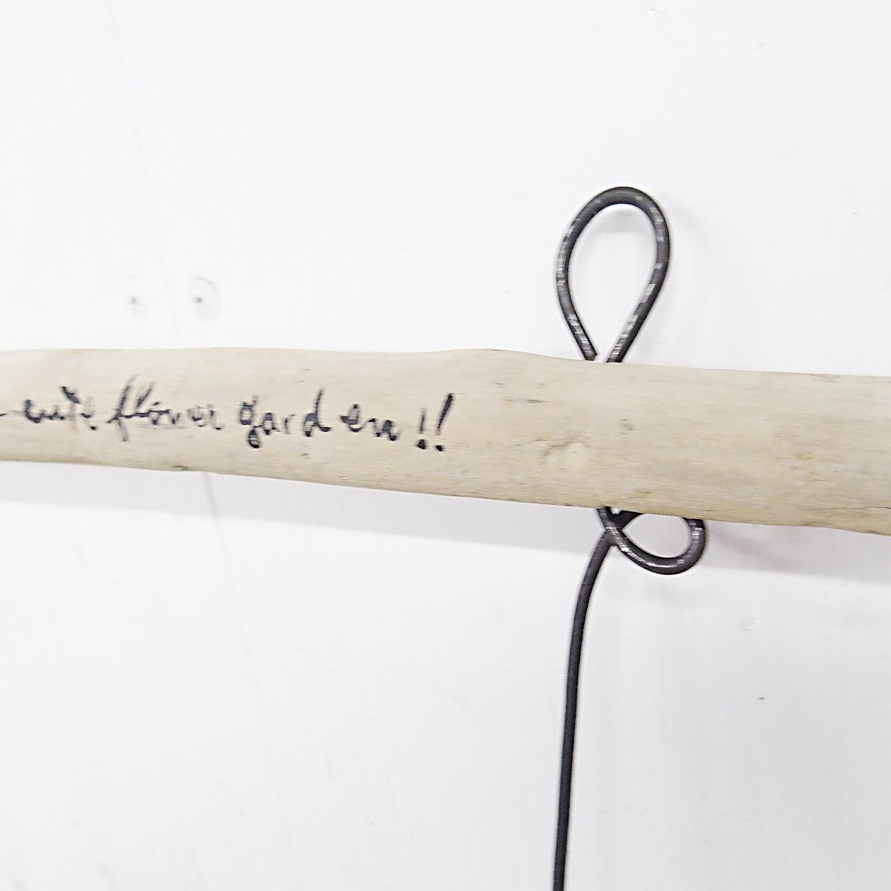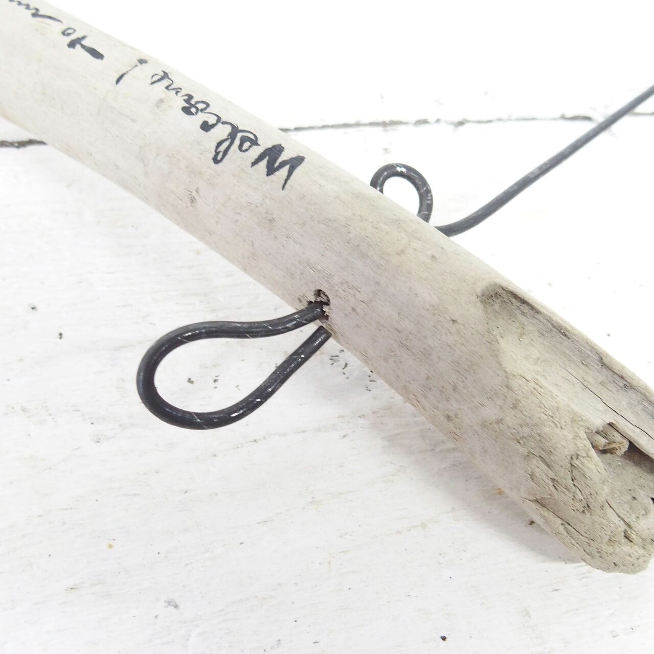 流木に文字を入れ太目の針金を差し込んだ