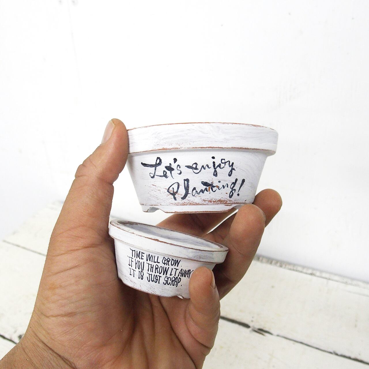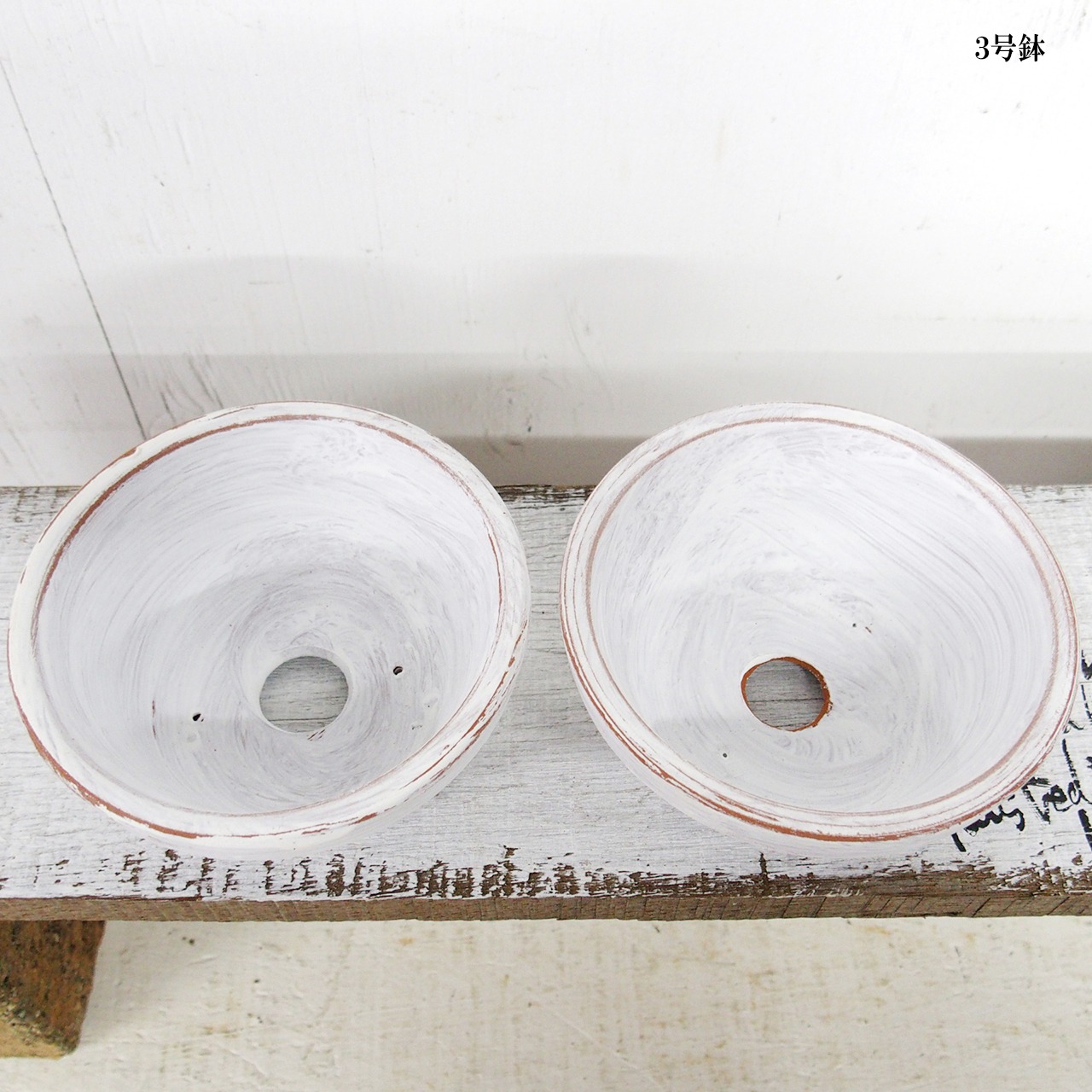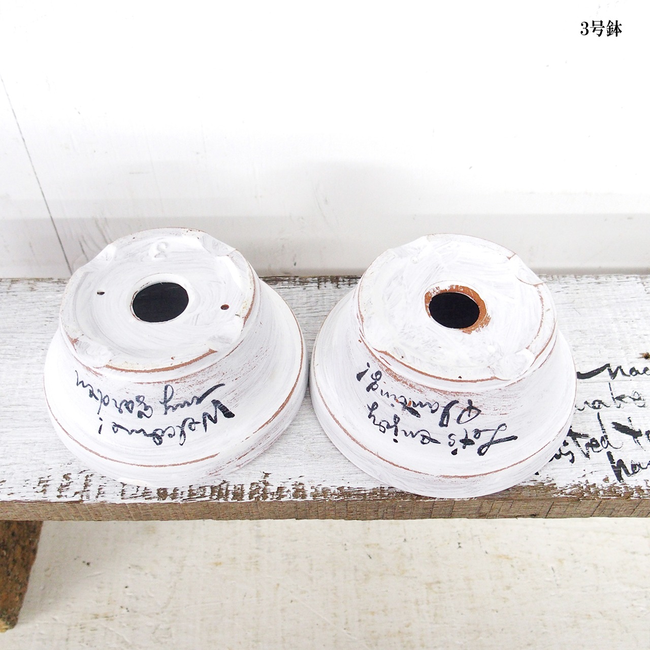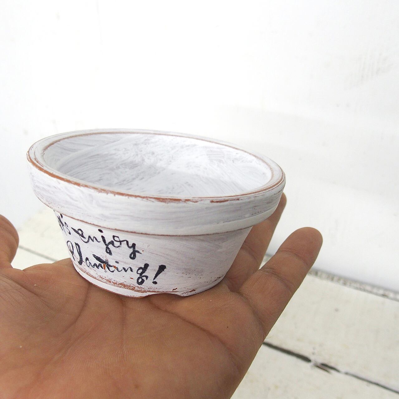 可愛い小さな鉢をホワイトのシャビー塗装で
