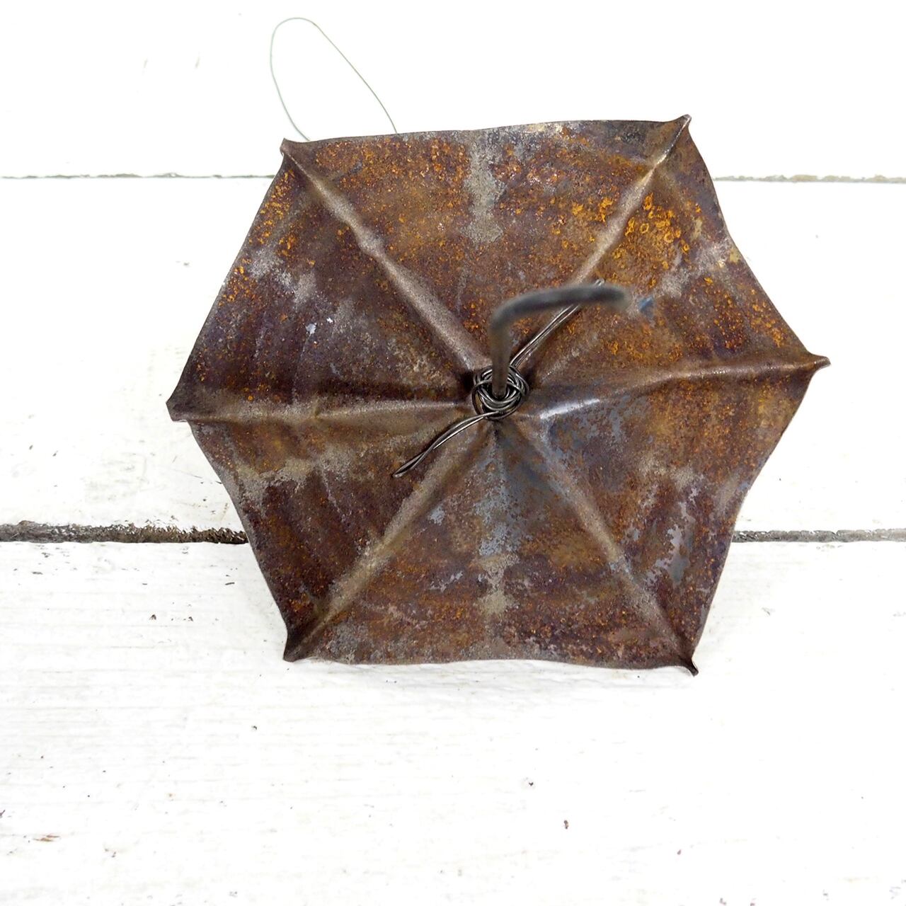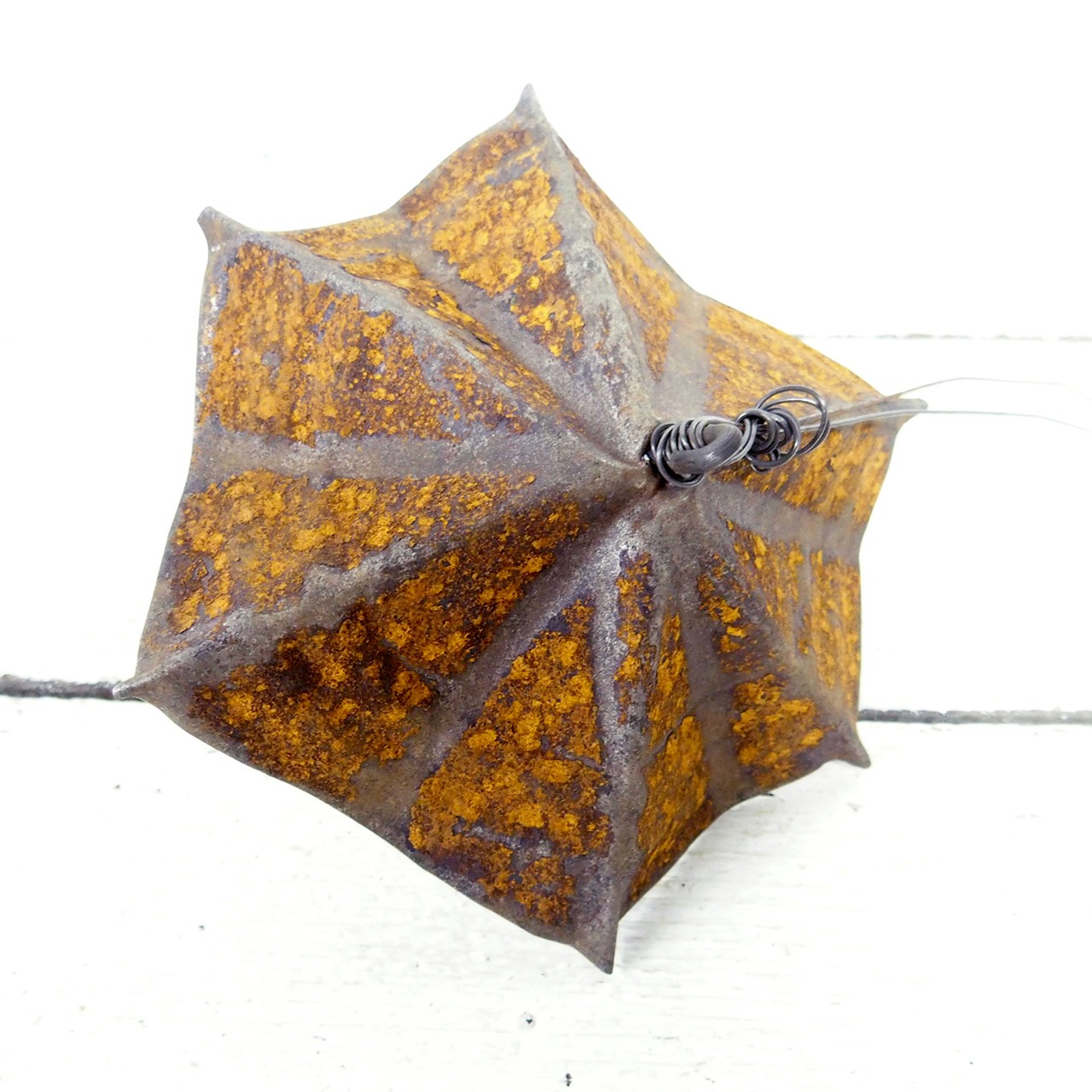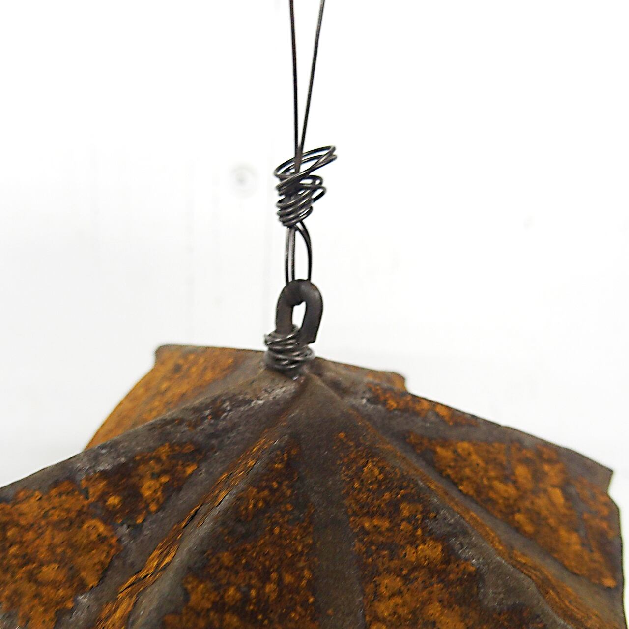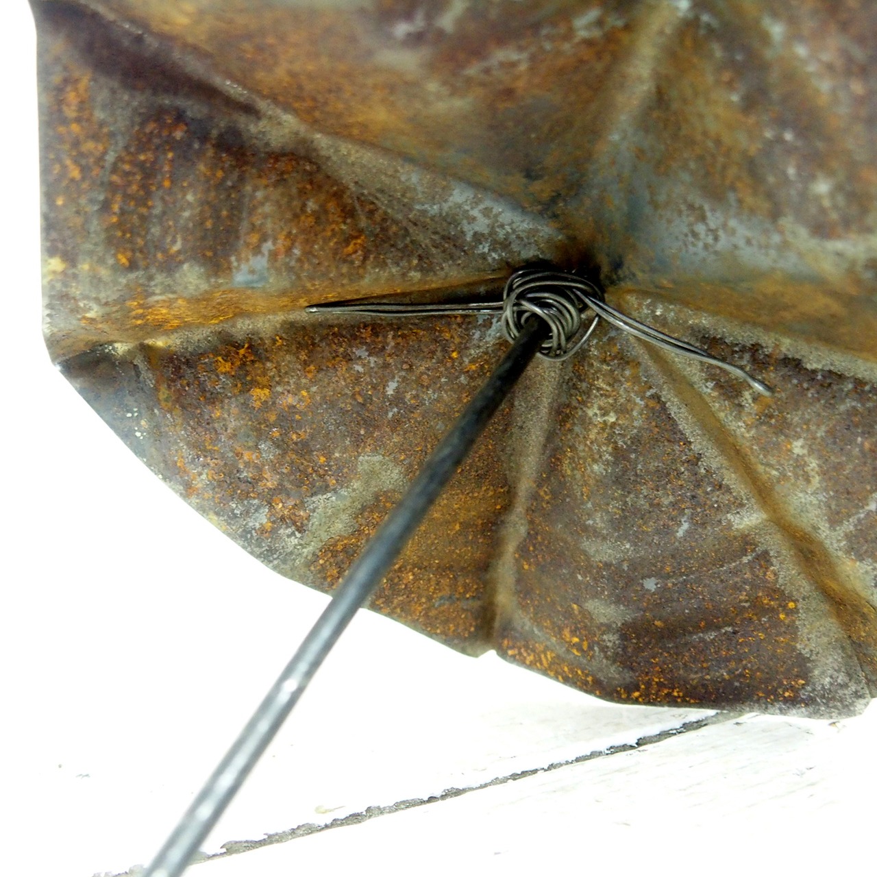 丸い缶底を切ったり折り曲げたりして作った傘のガーデンアクセサリーです。