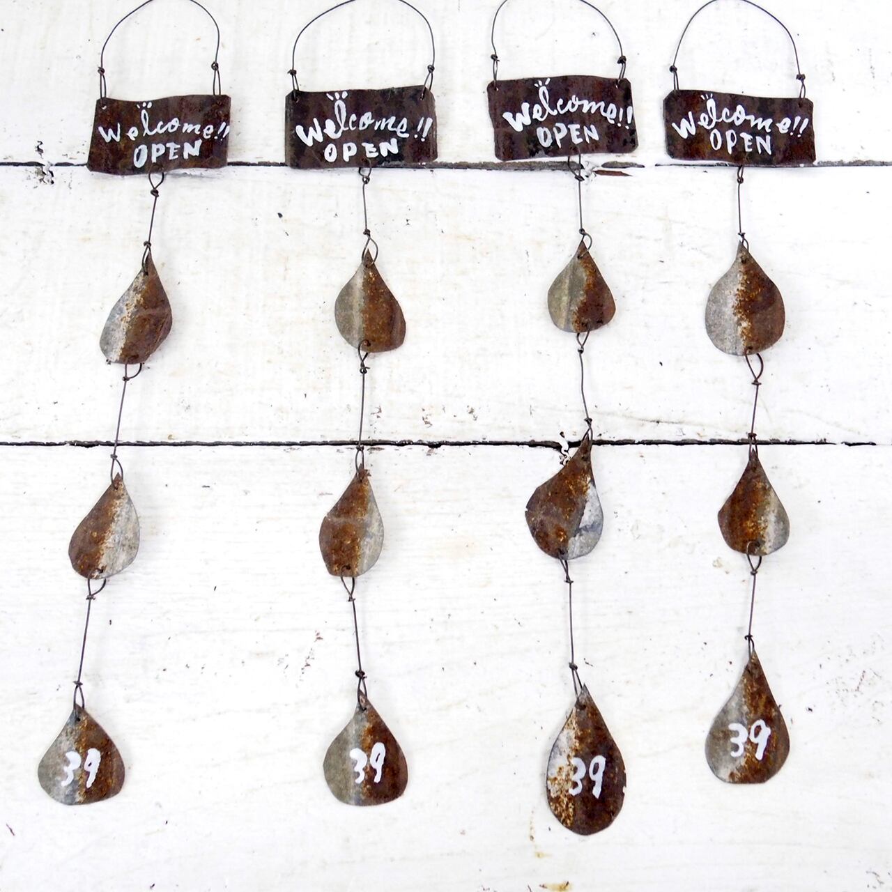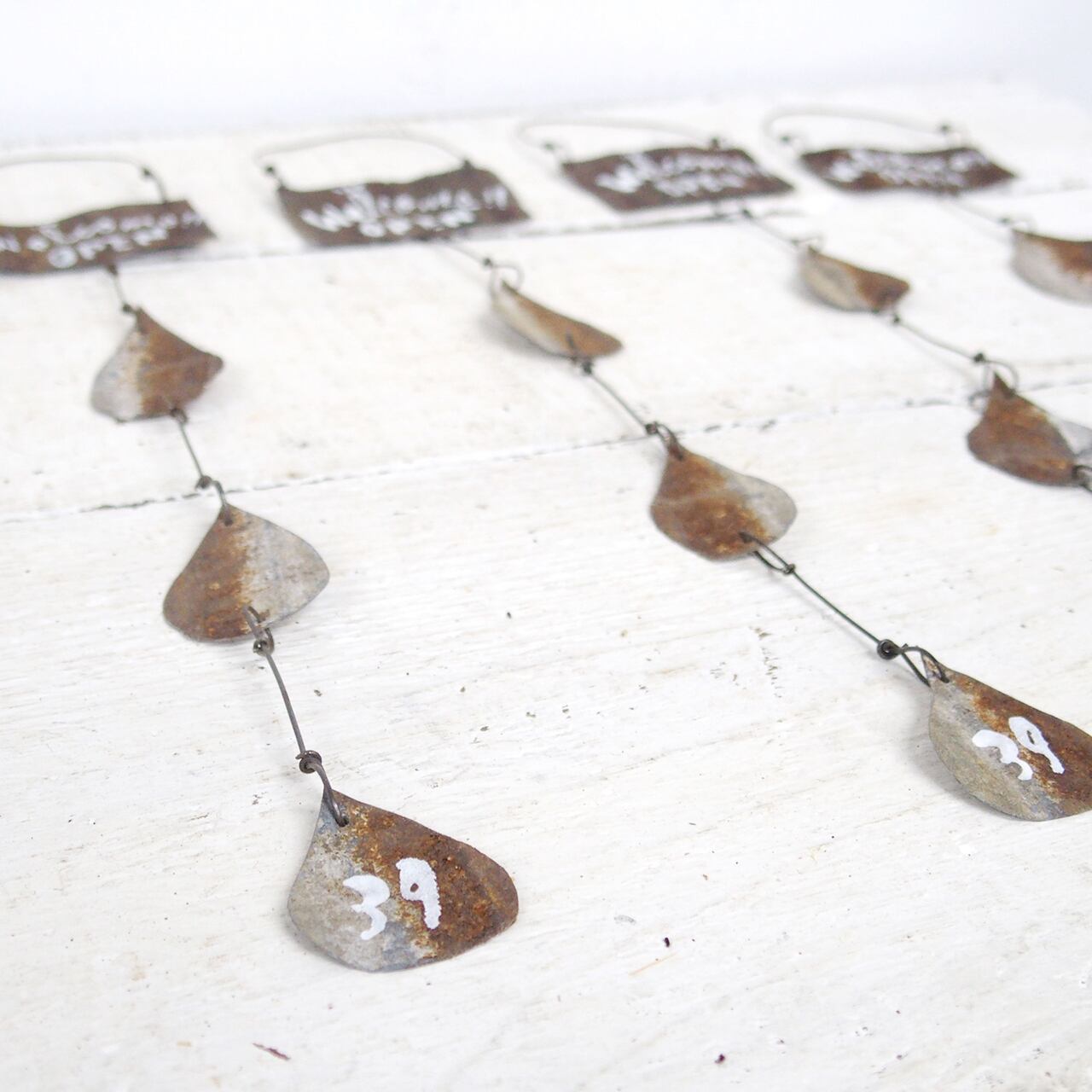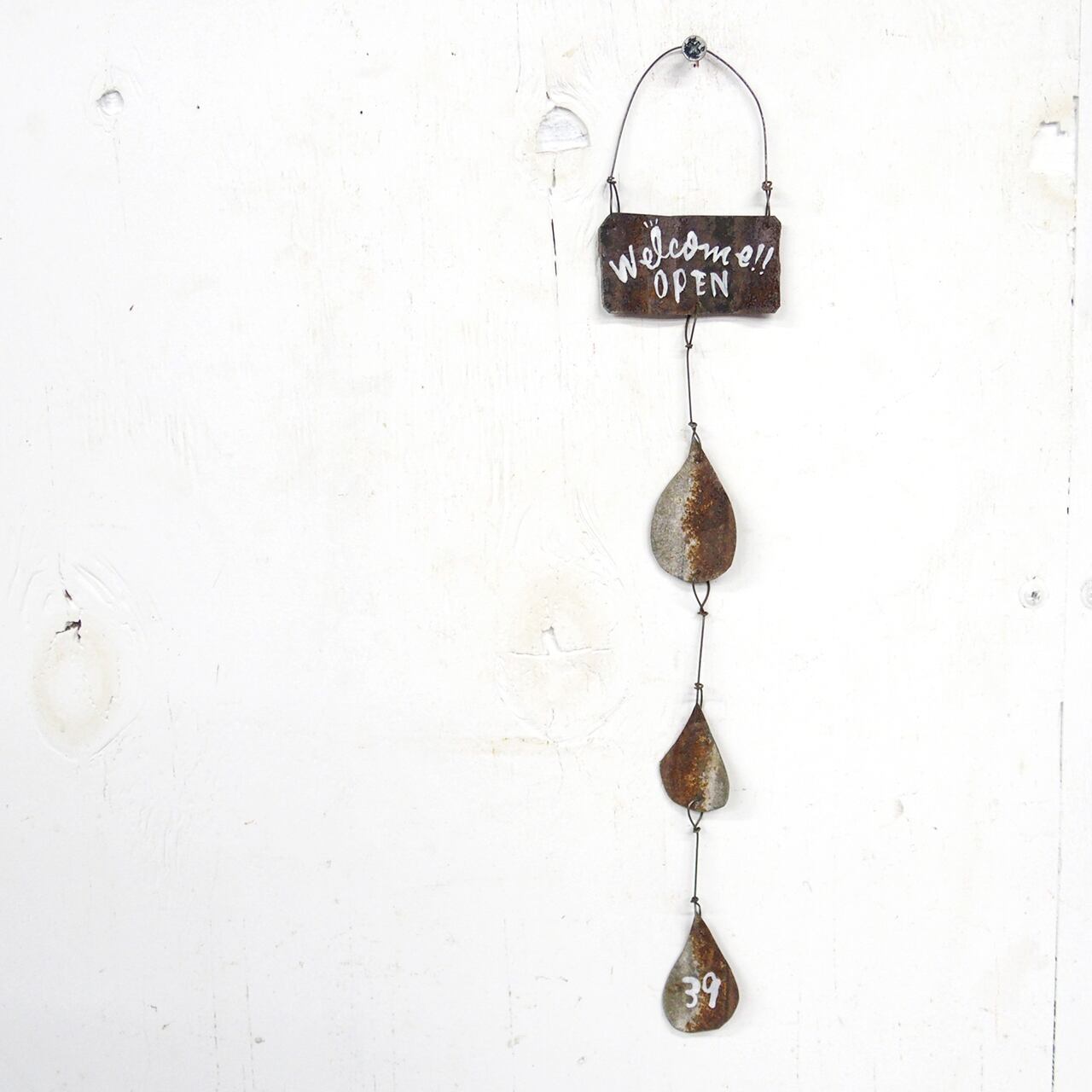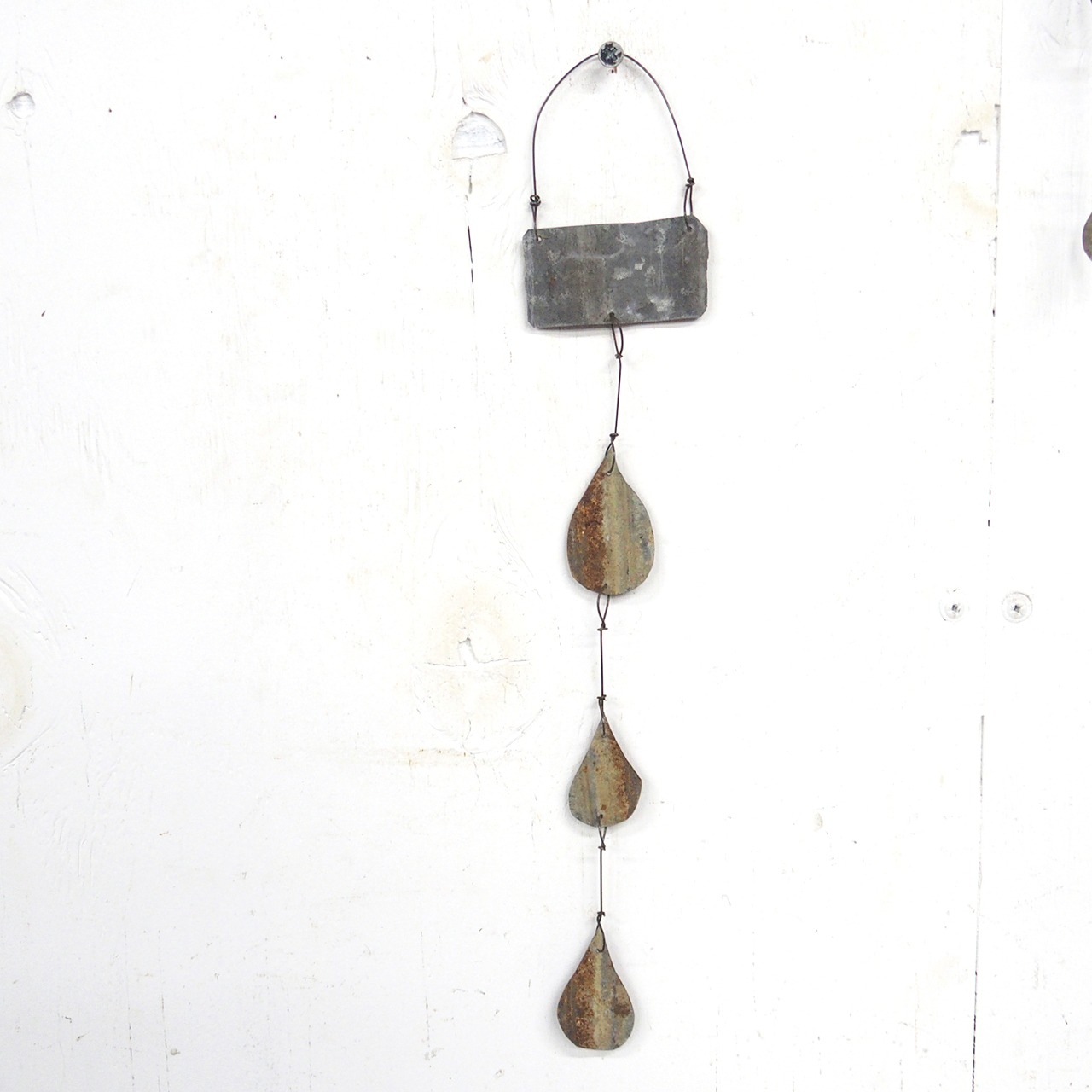 サビサビのブリキを雫型に切り取って繋げた