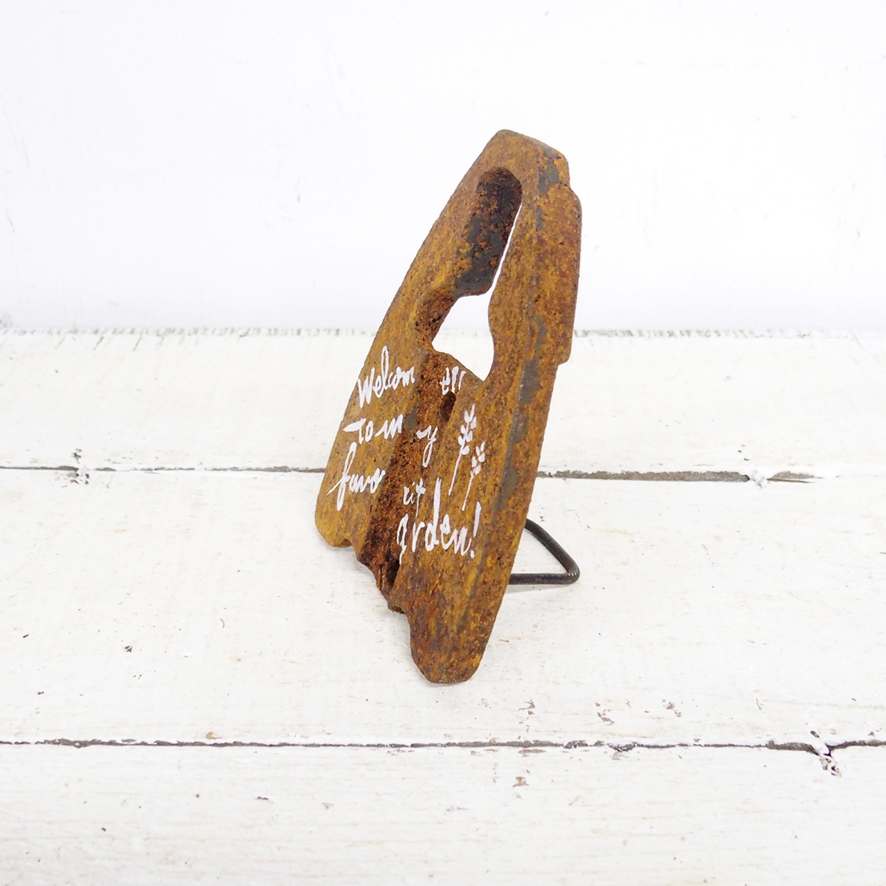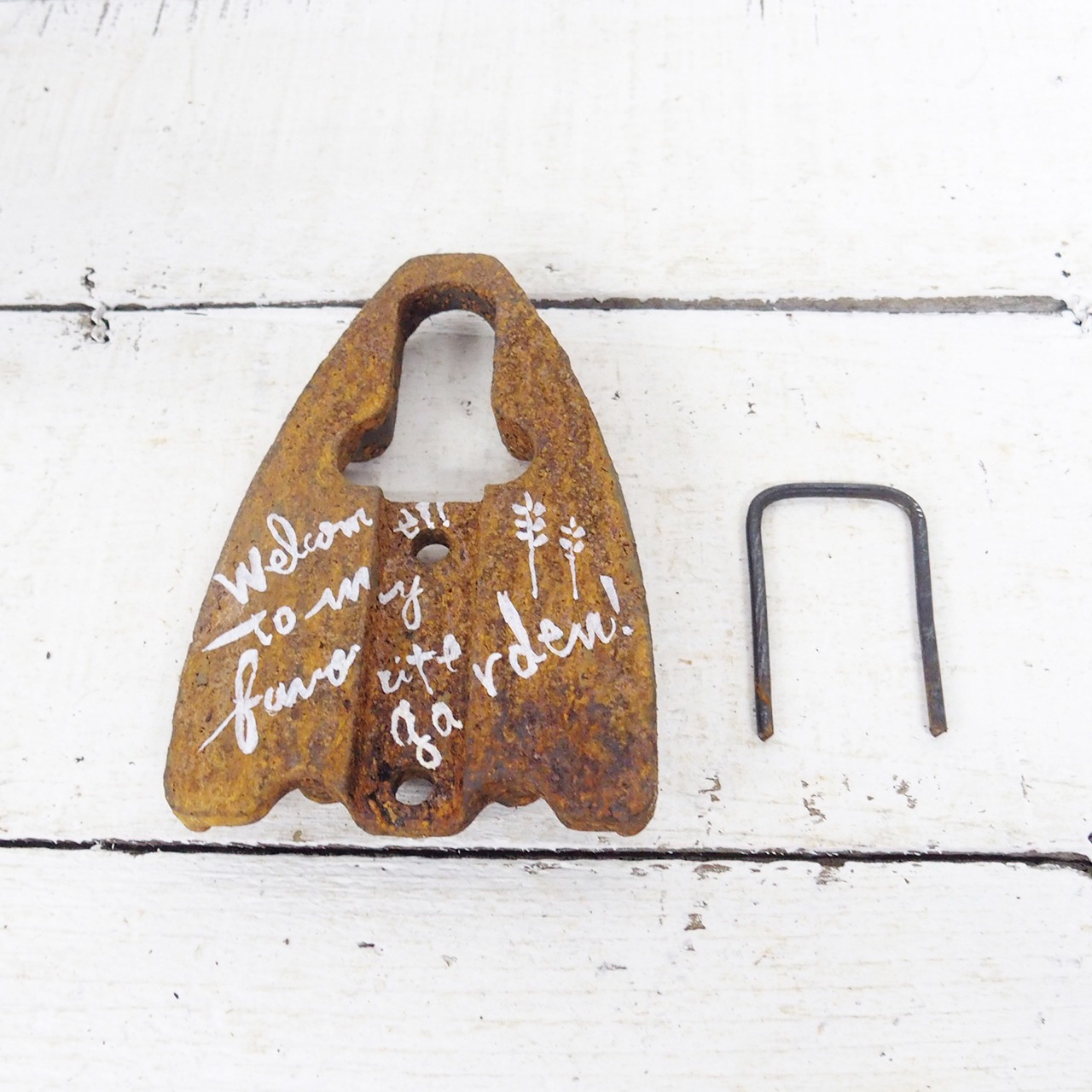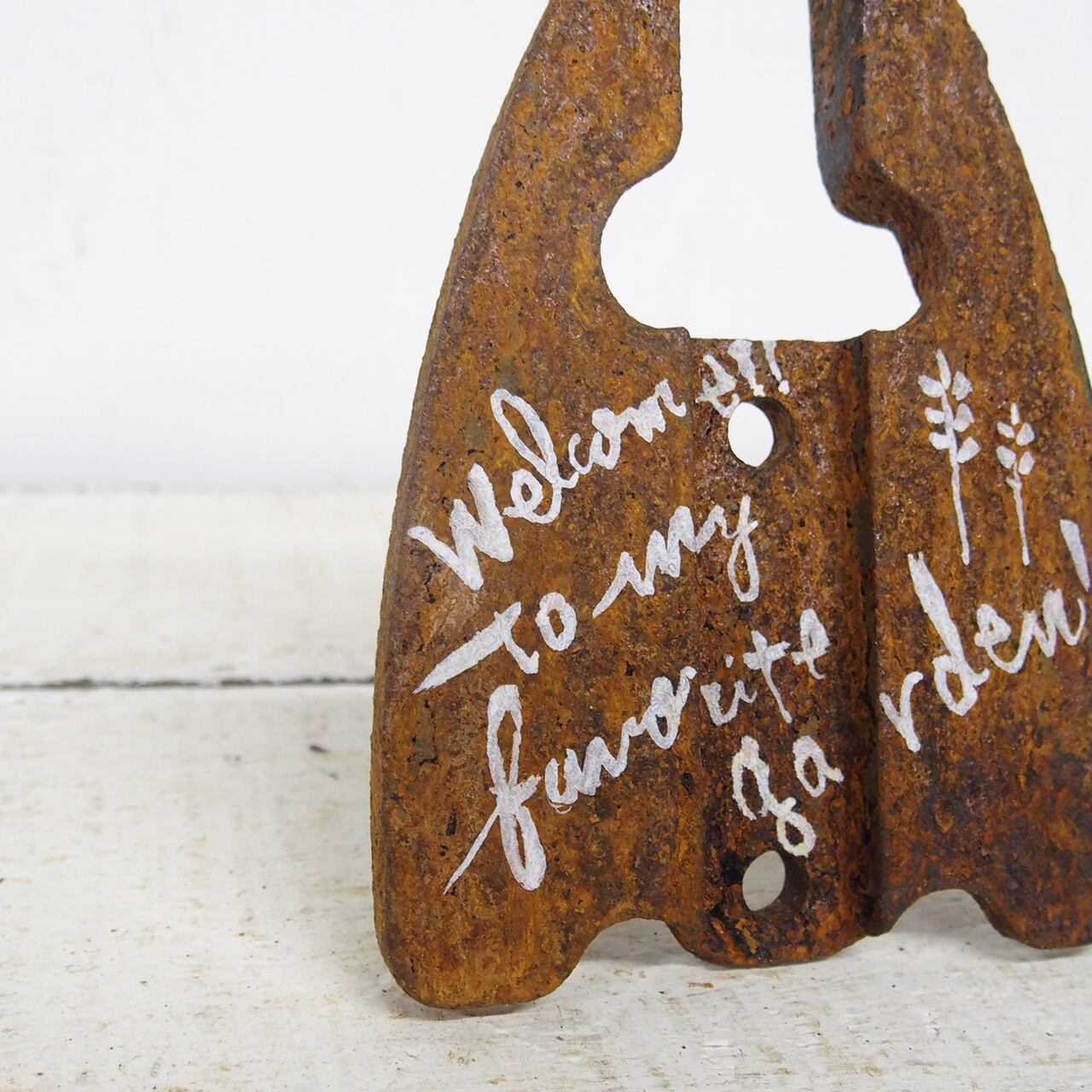 サビサビの古いアイロンに文字を入れたガーデンサインです。