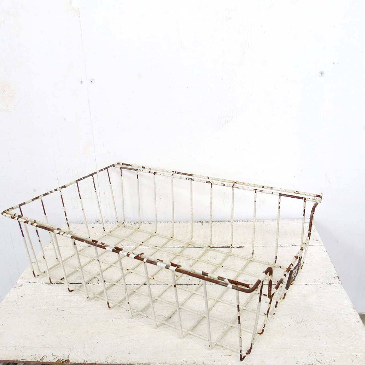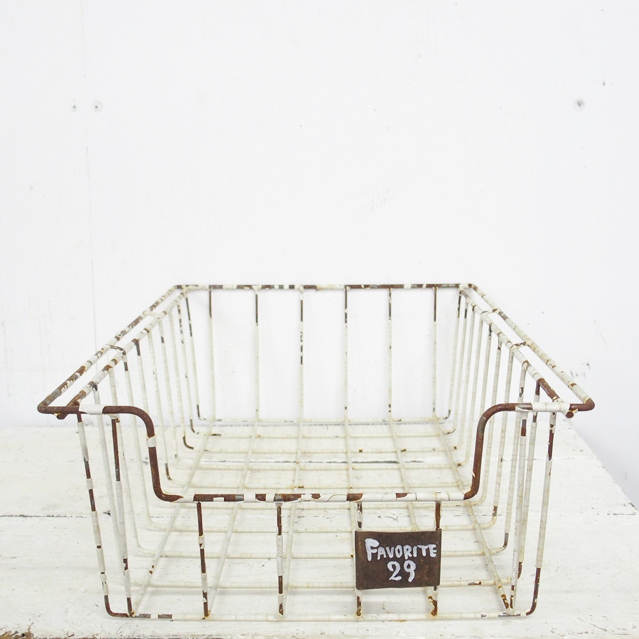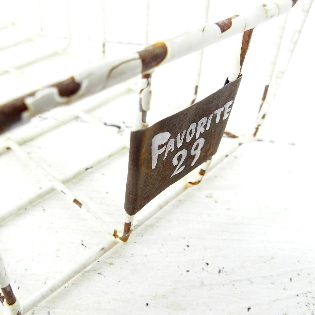 古いメッシュのかごにサビサビのネームプレートを