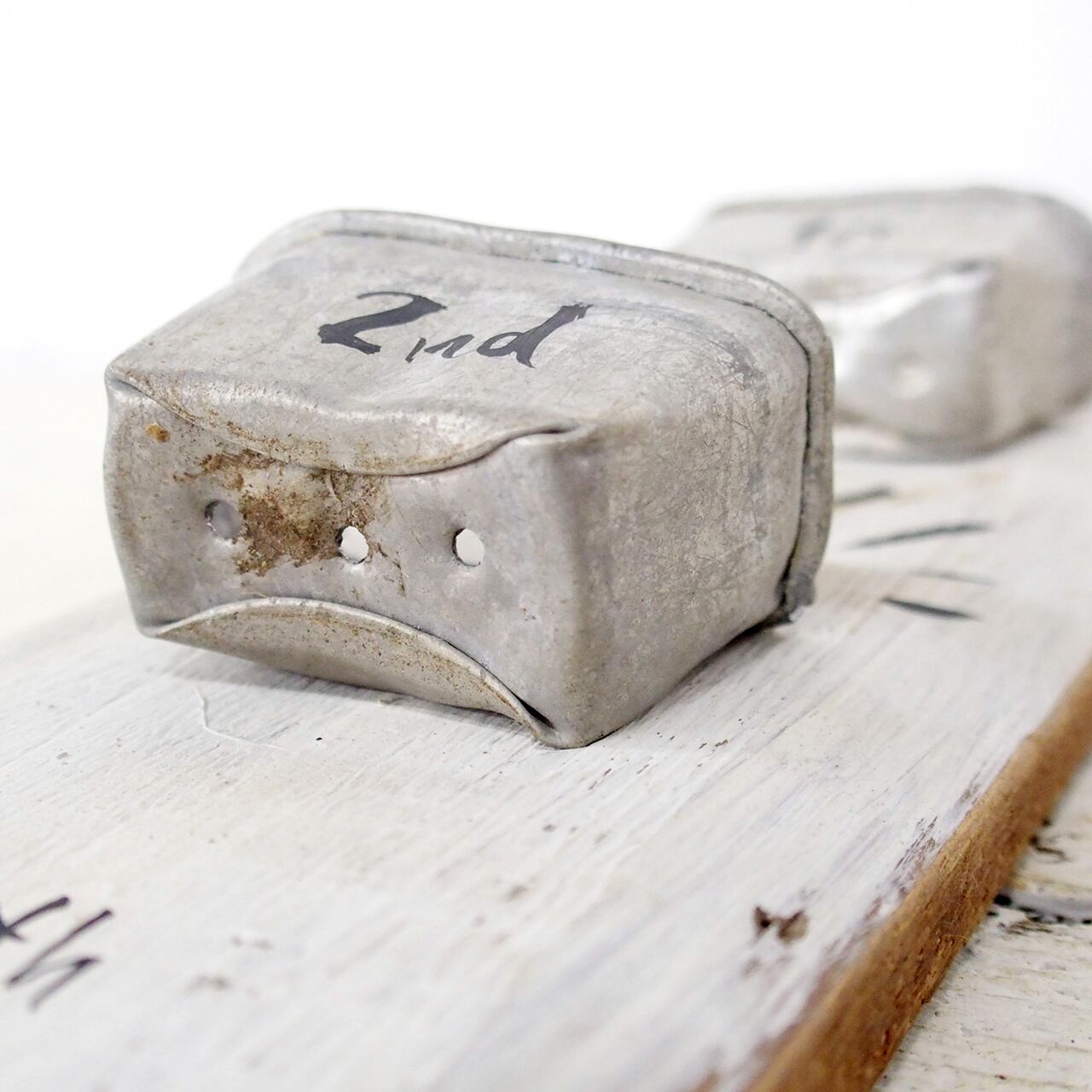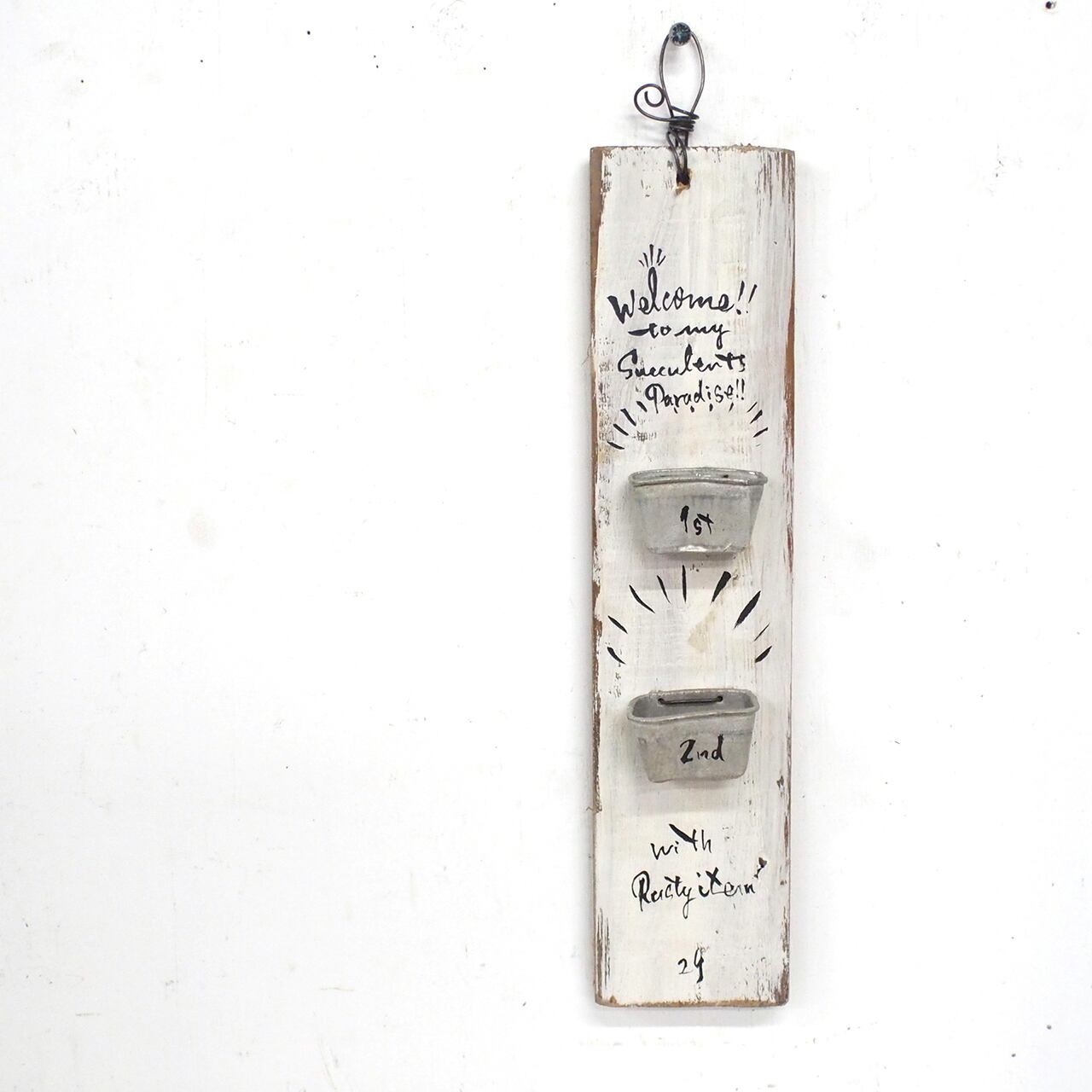 多肉用ミニ缶2個を古材に固定したプレートです。