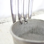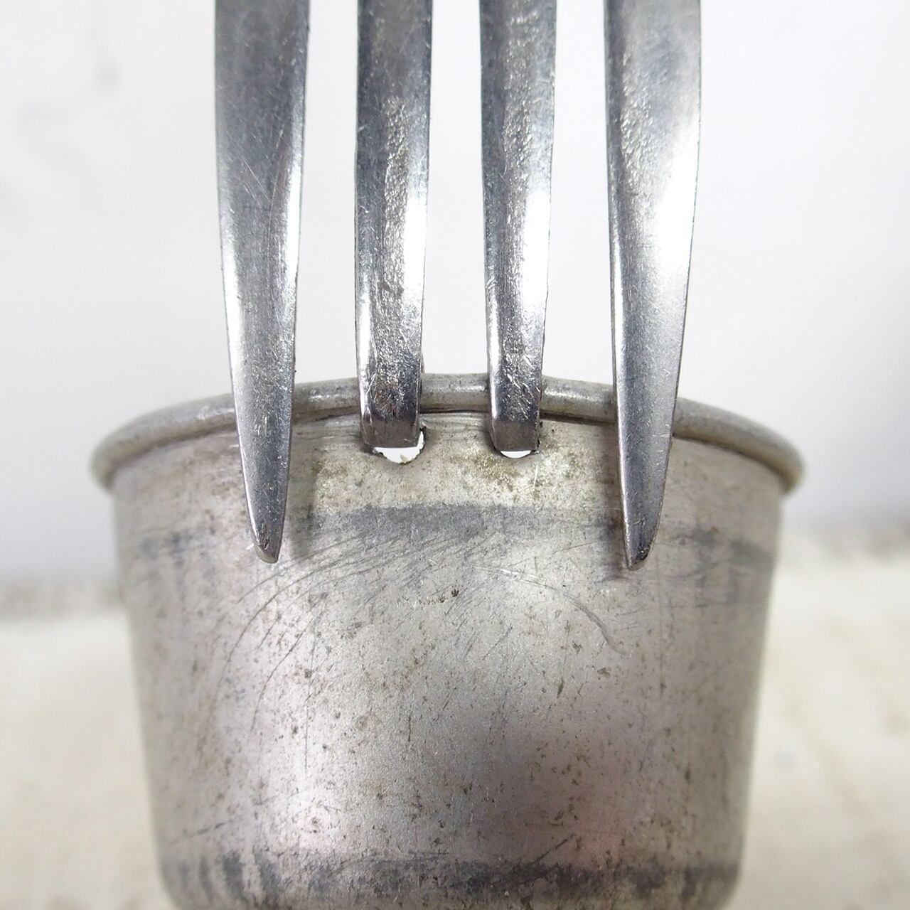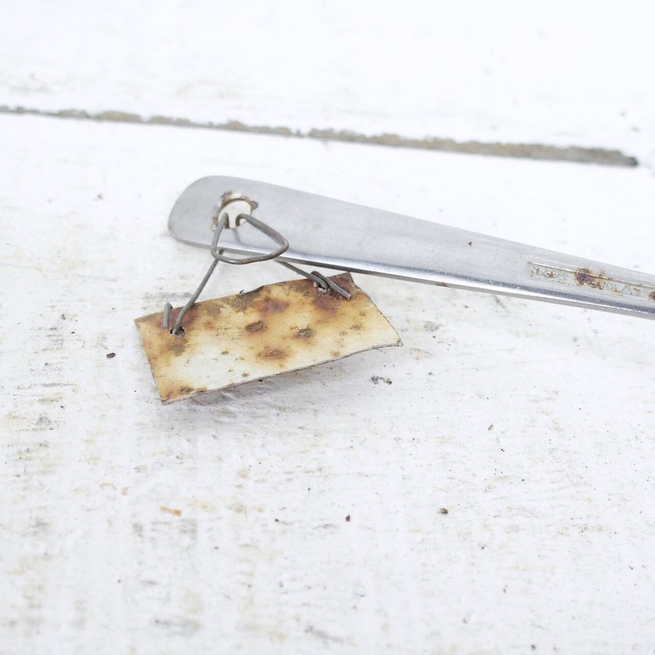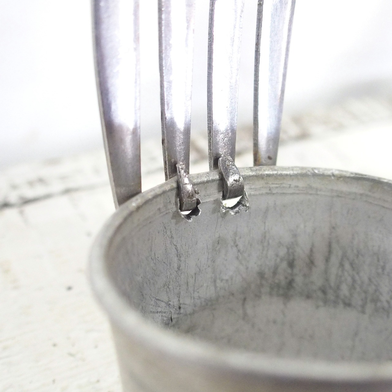 古い給食用フォークに小さなアルミ缶をくっつけた