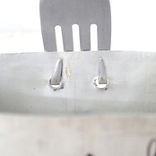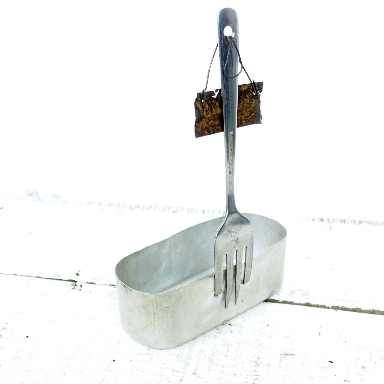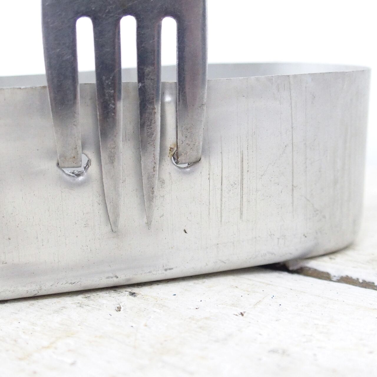 古い給食用フォークに小さなアルミ缶をくっつけた