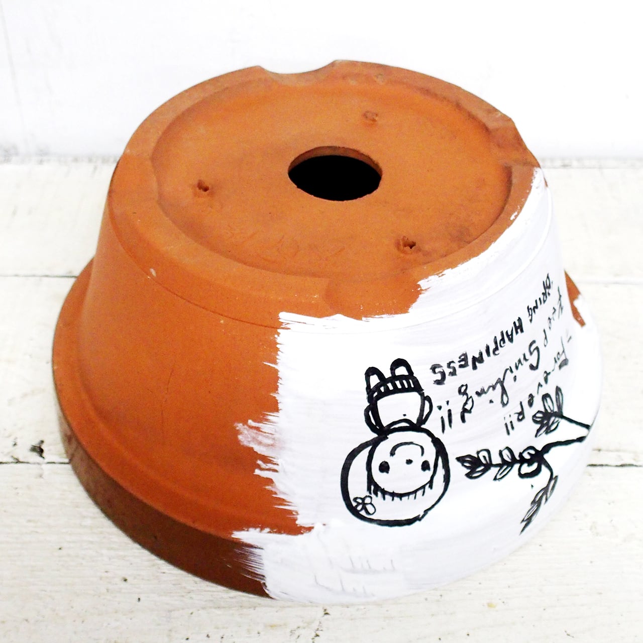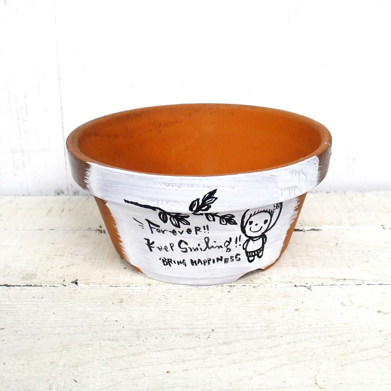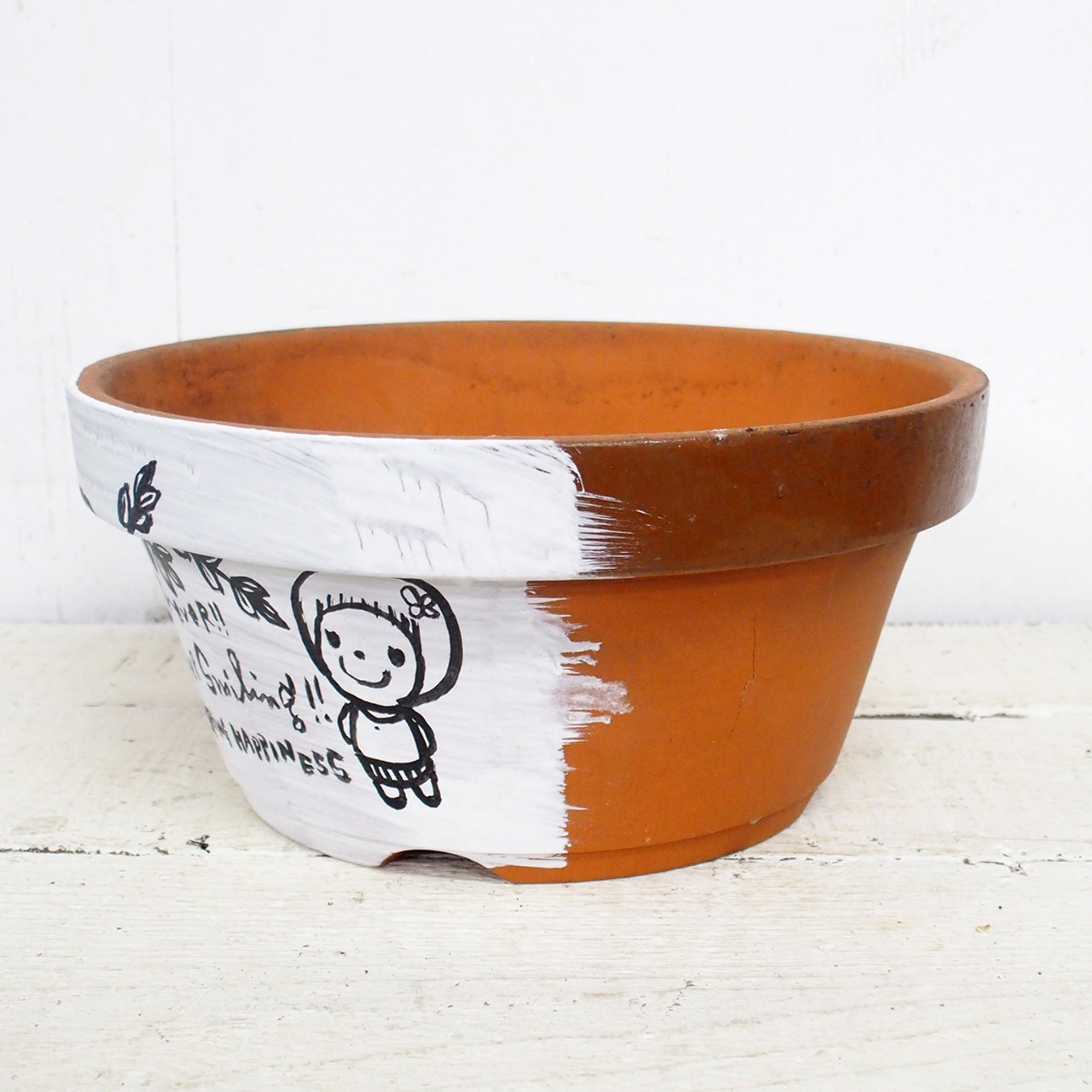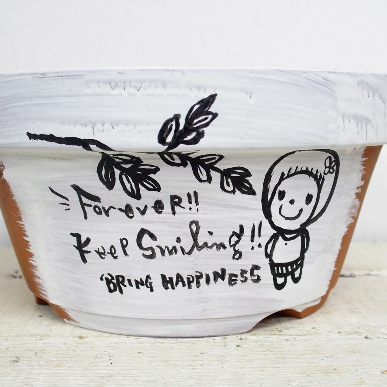 素焼き鉢にイラストと文字をペイントしました。