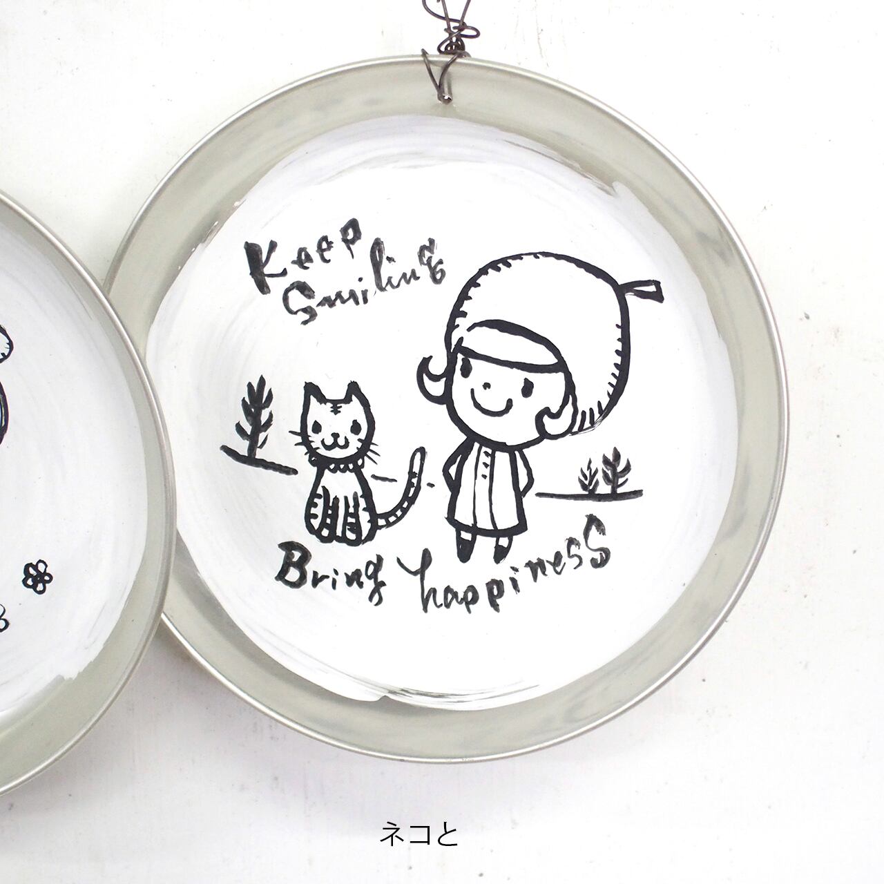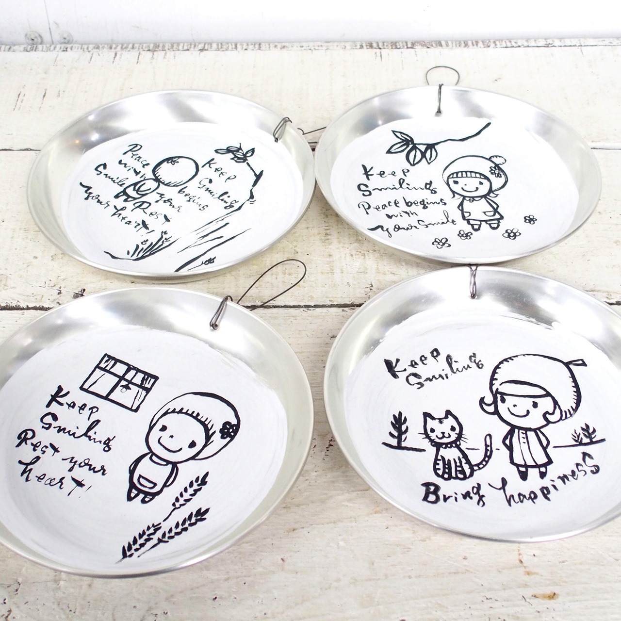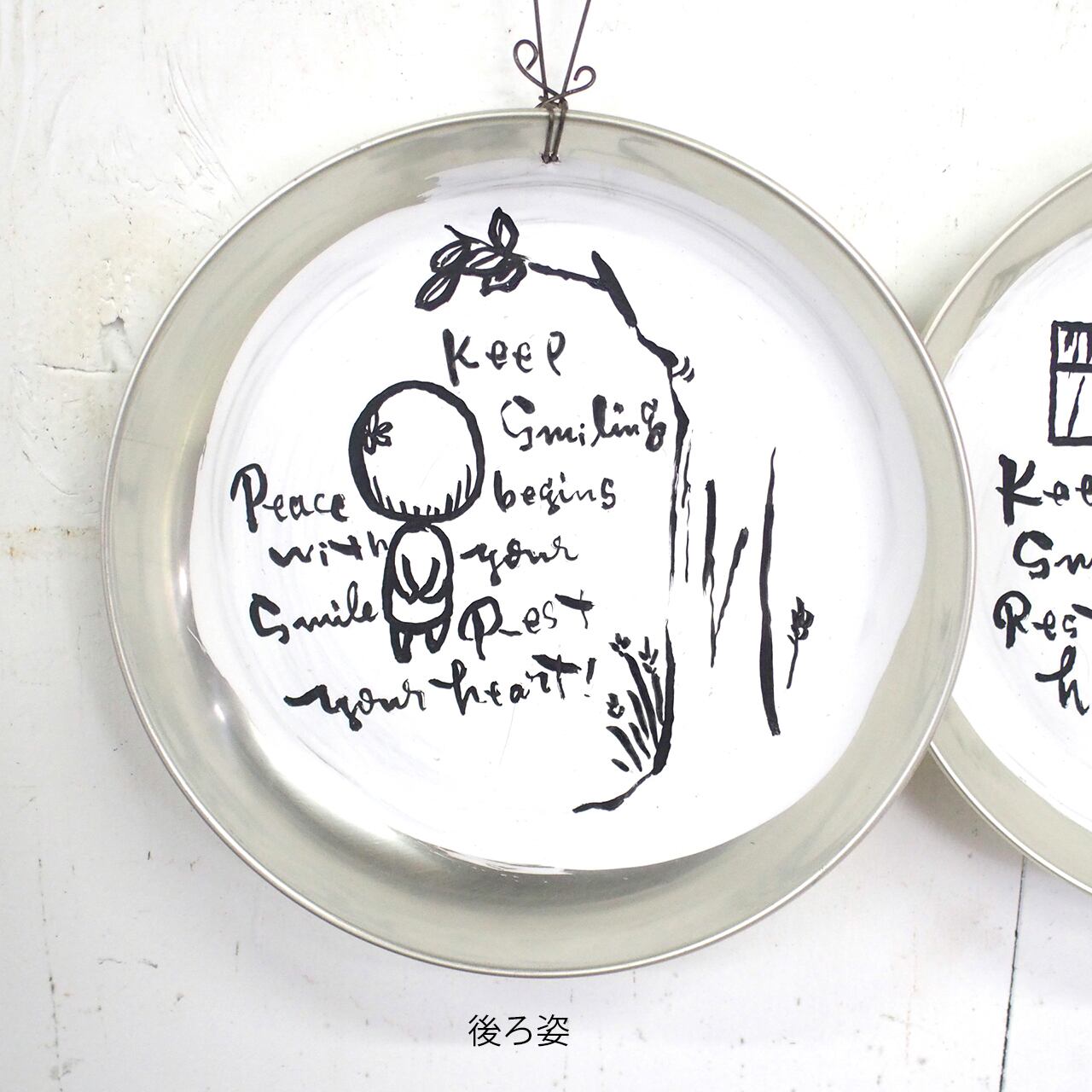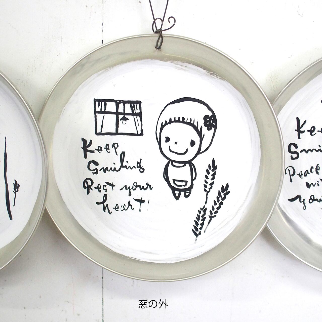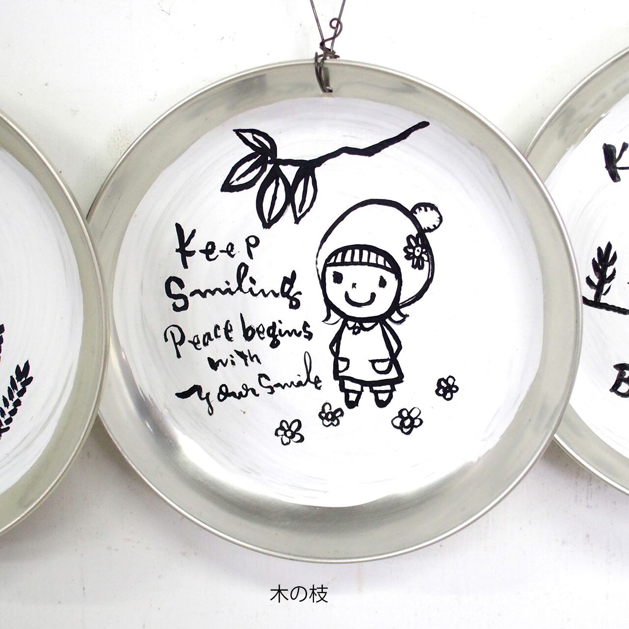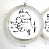 アルミの丸皿に文字とイラストを入れたサインです。