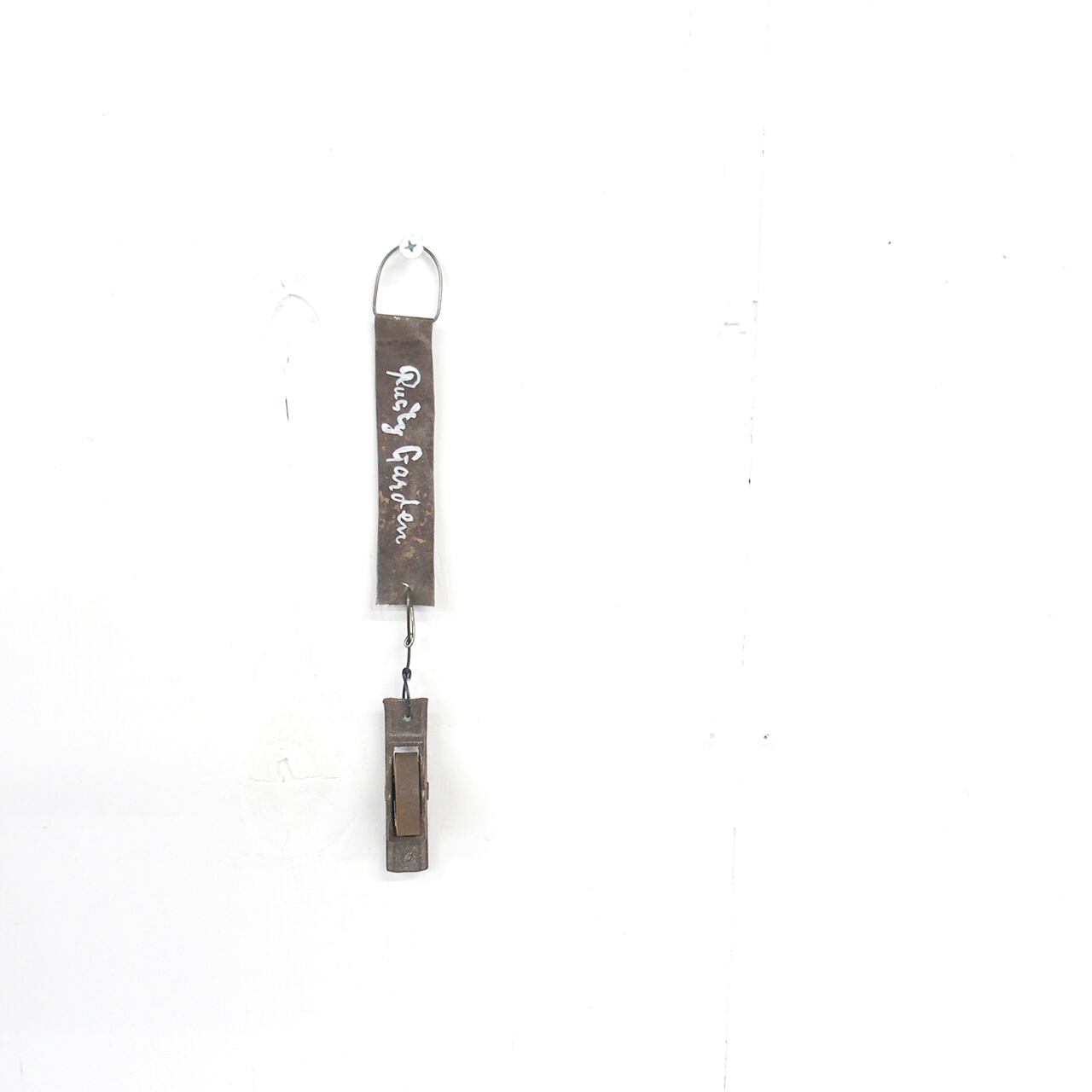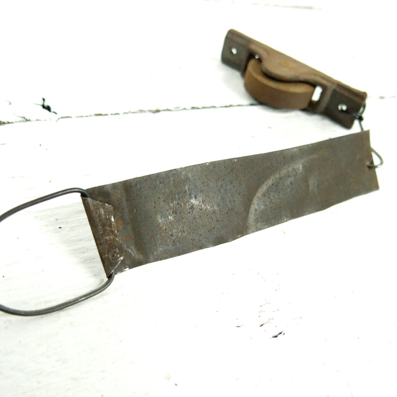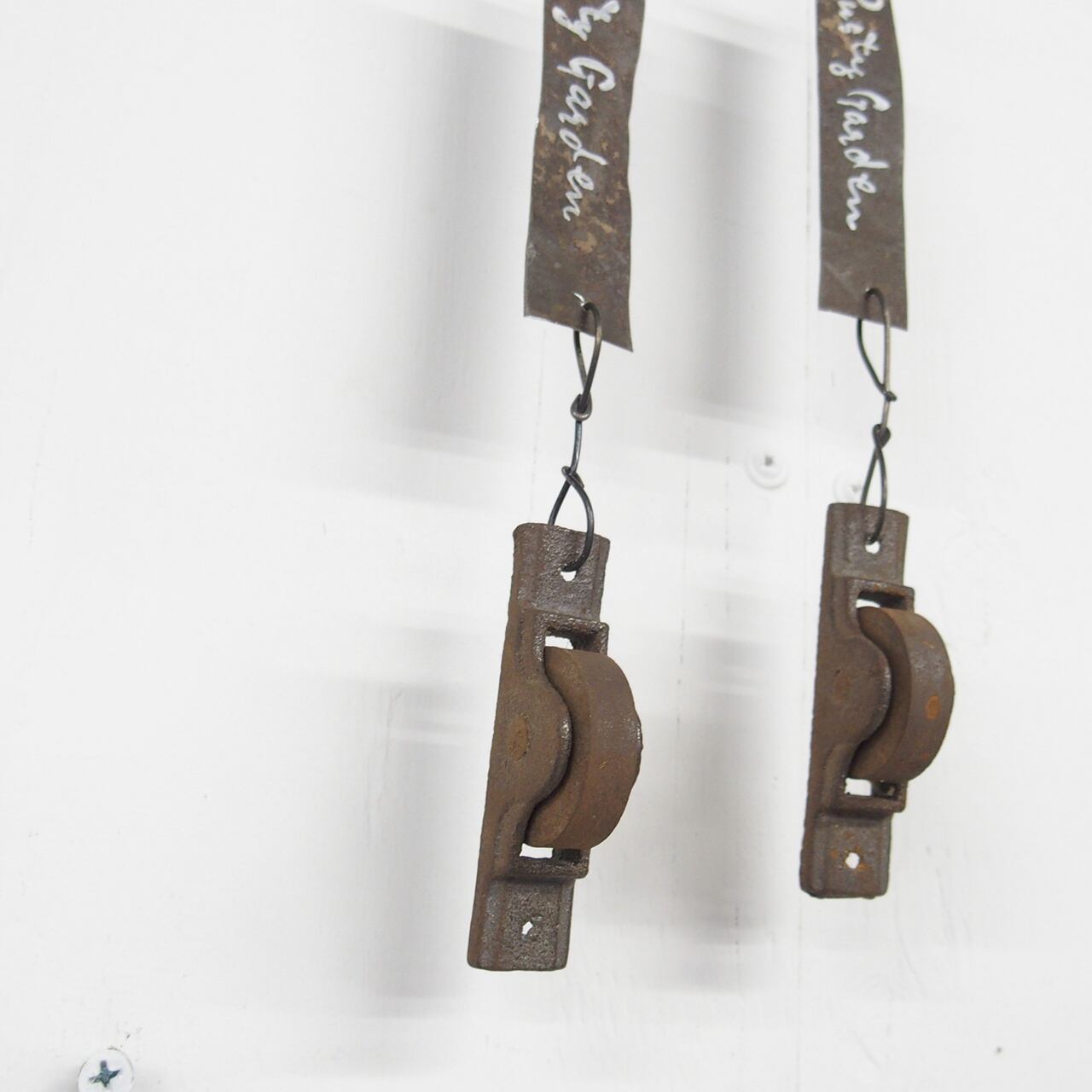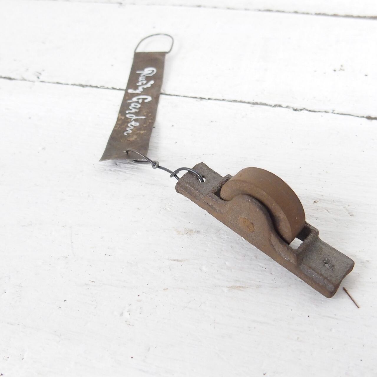 古い滑車にブリキのミニサインを組み合わせた