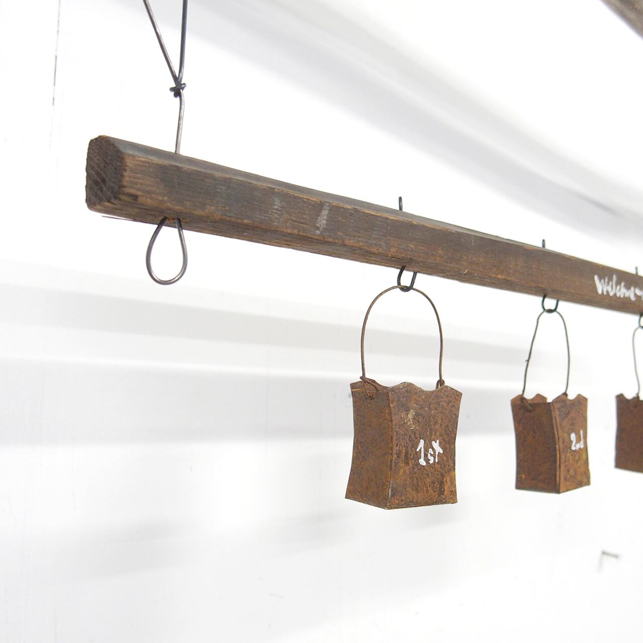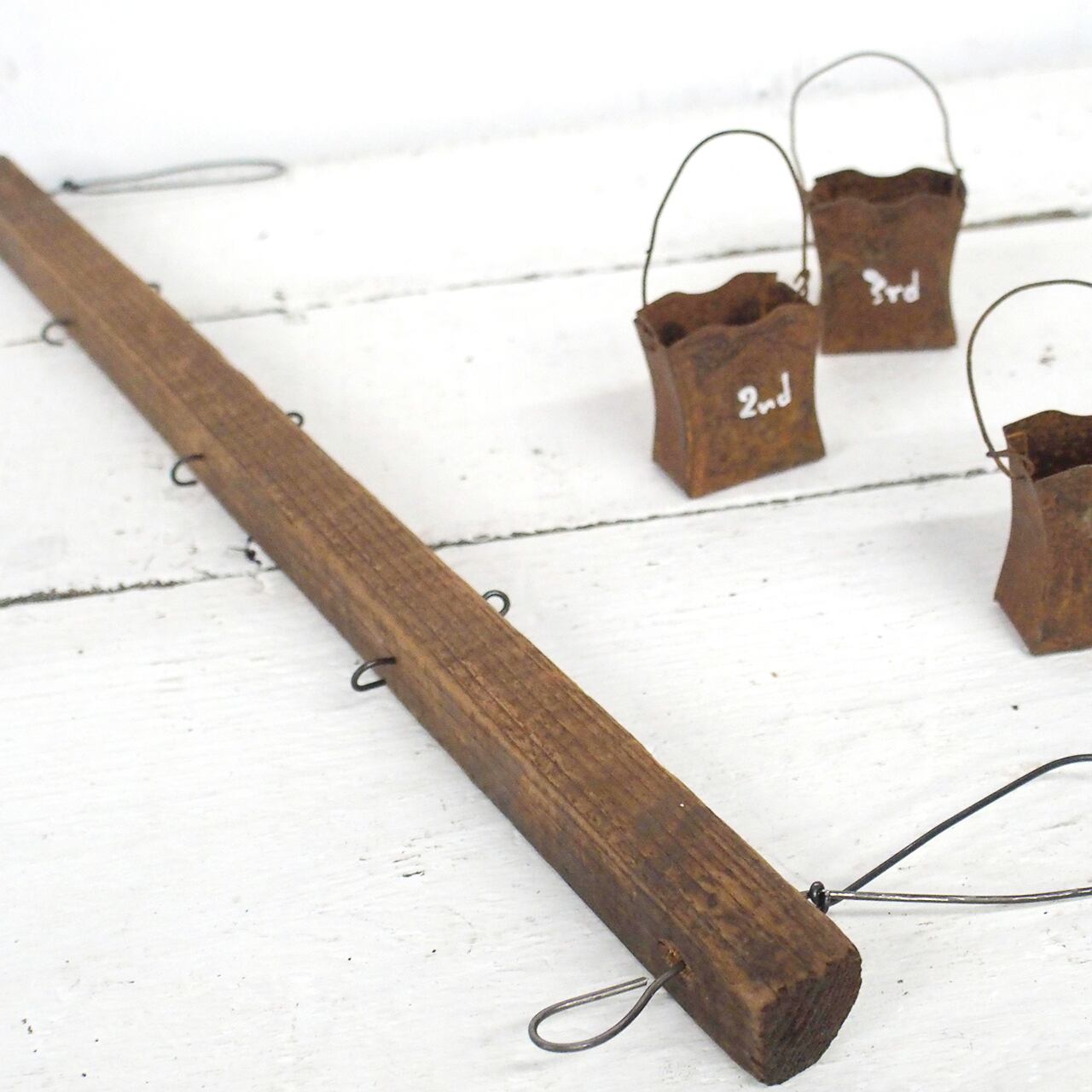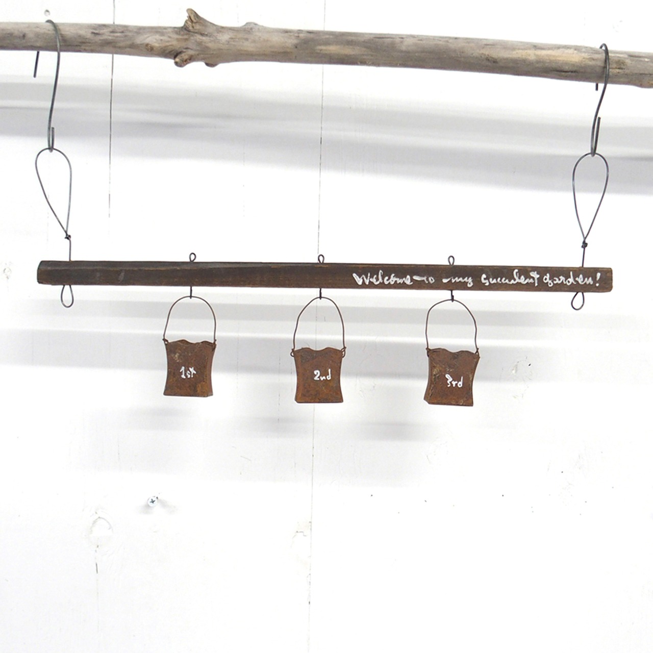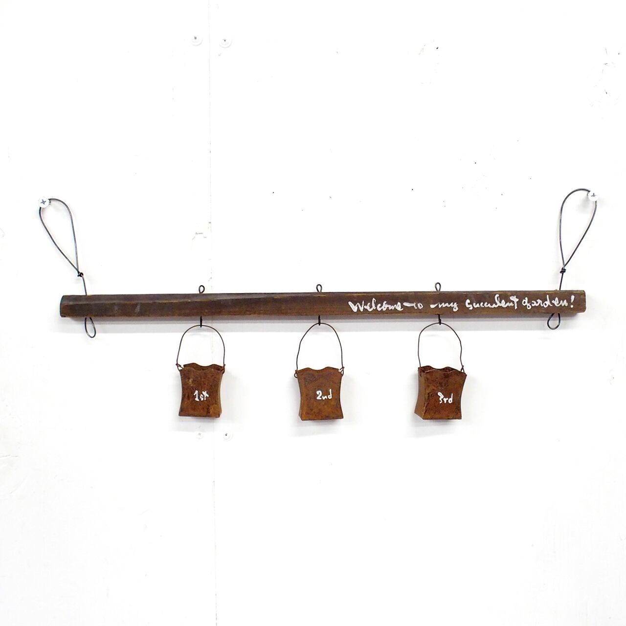 古材の棒に3個吊るしたハンギングミニプランターです♪