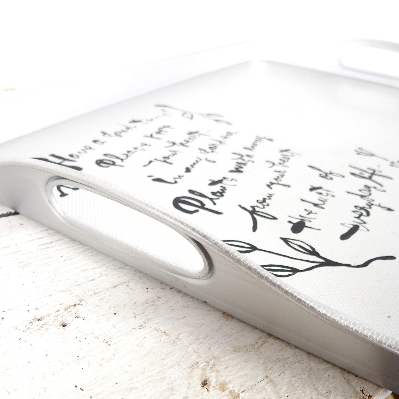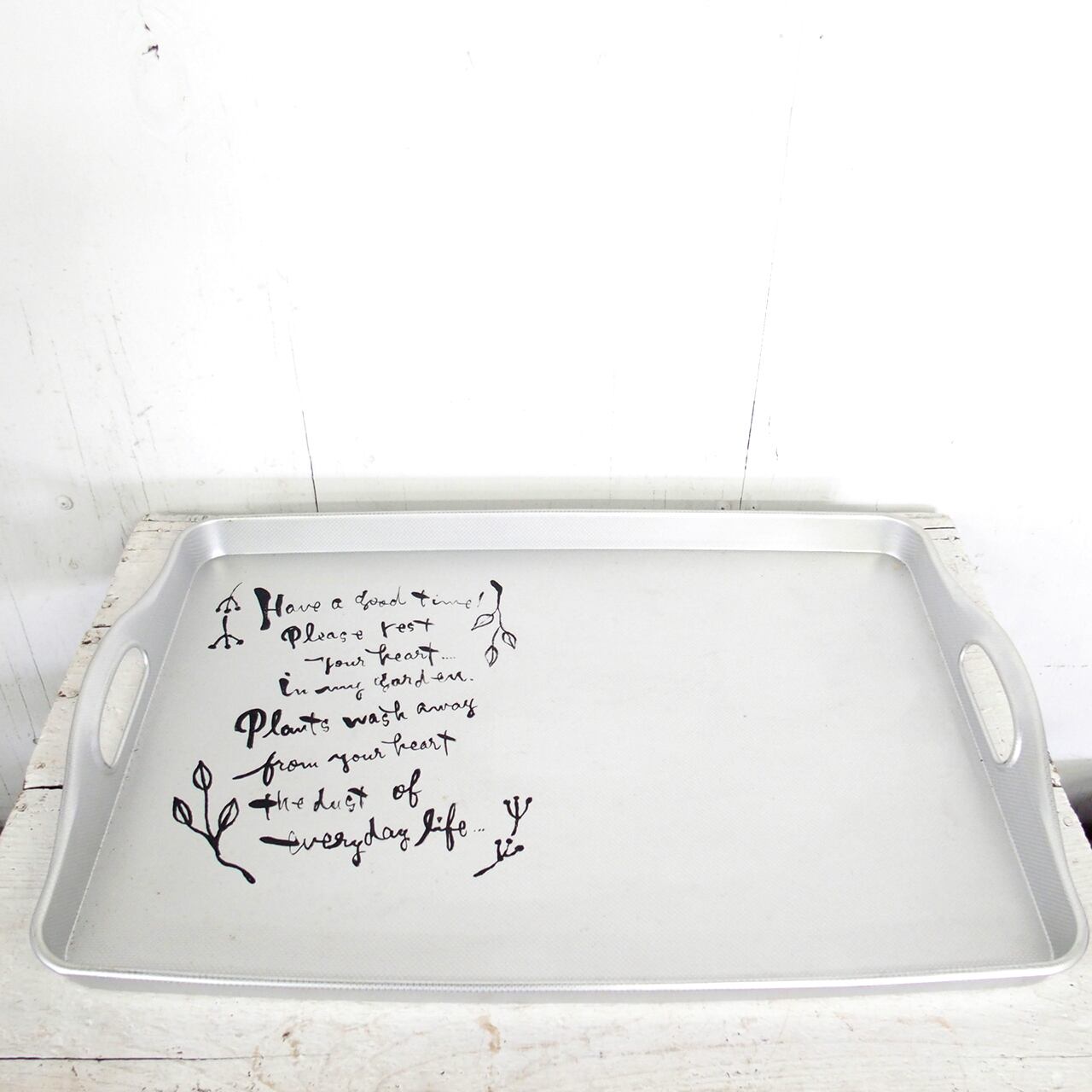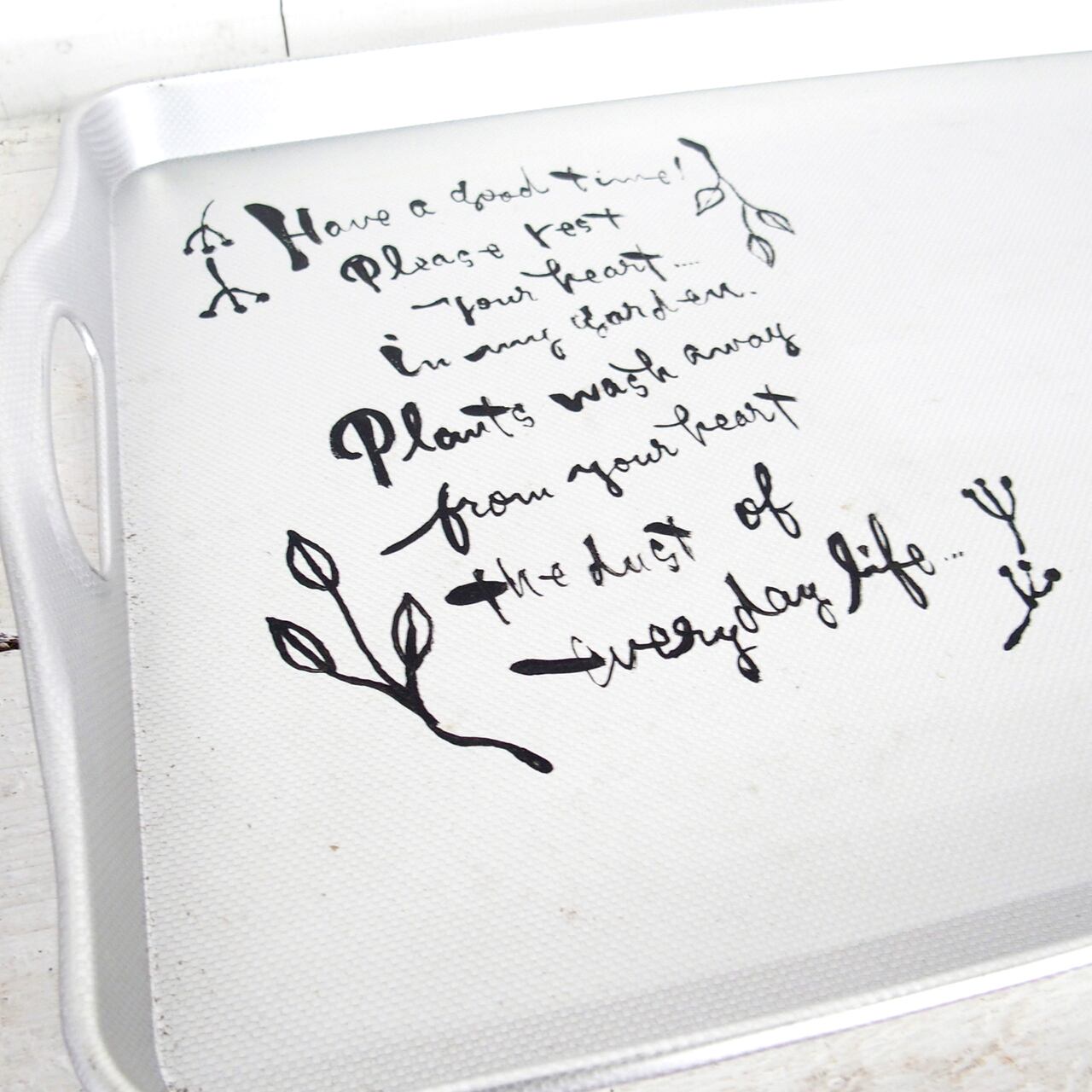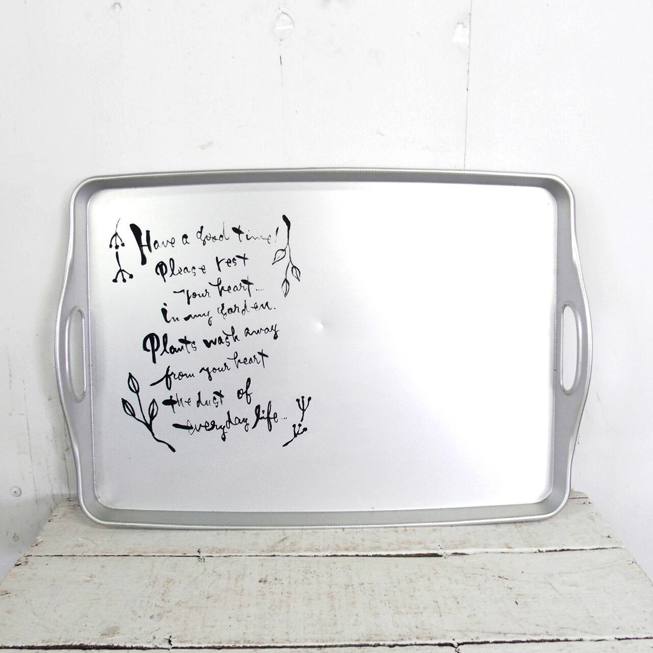 新古品のアルミトレーにイラストと文字を入れたアレンジ作品です♪