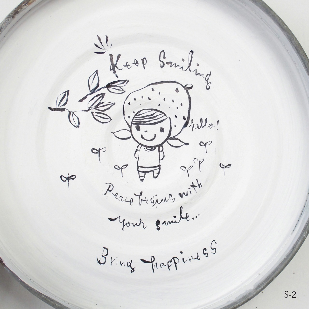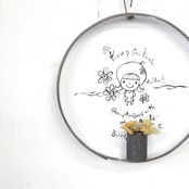 丸い缶底に文字とイラストを入れたサインです。