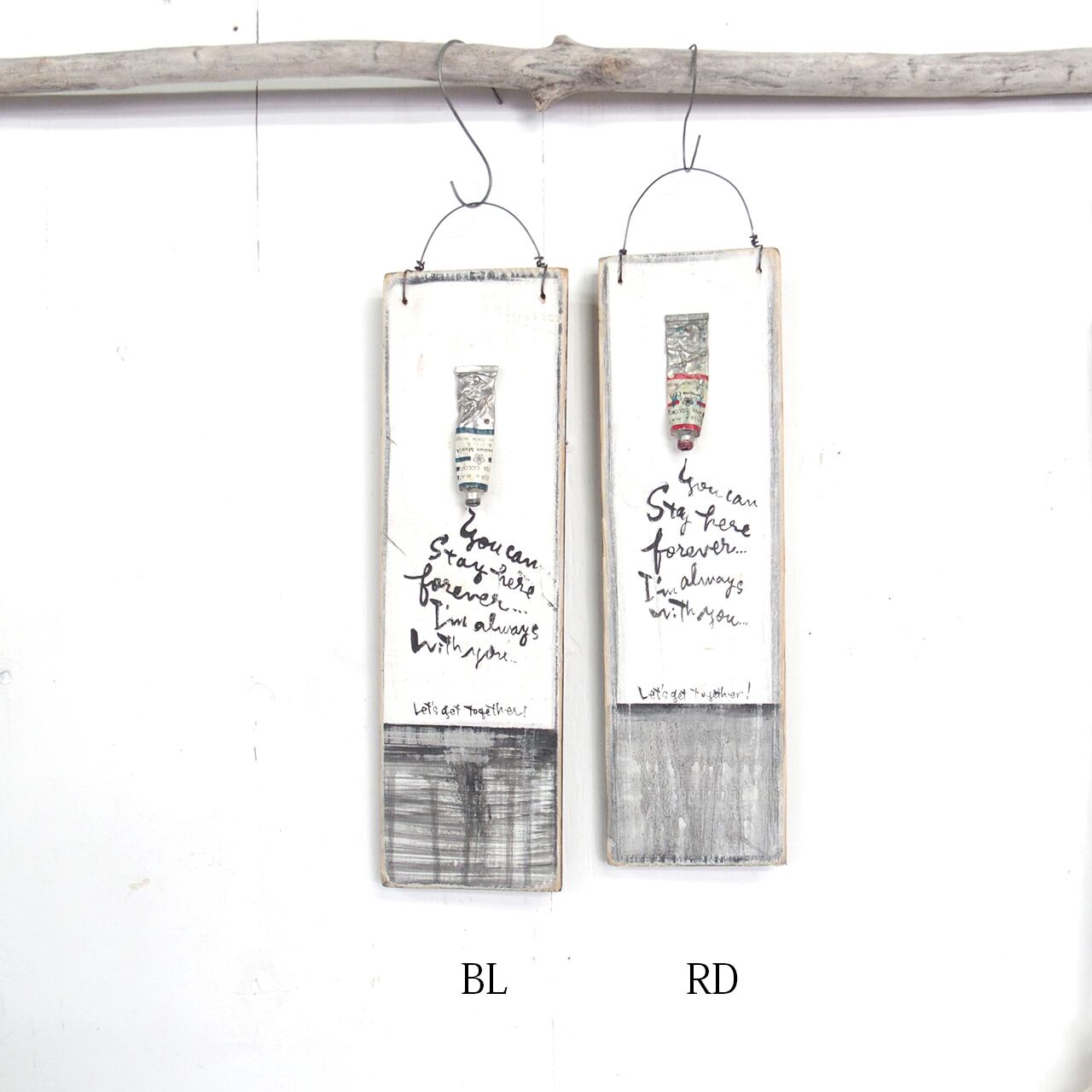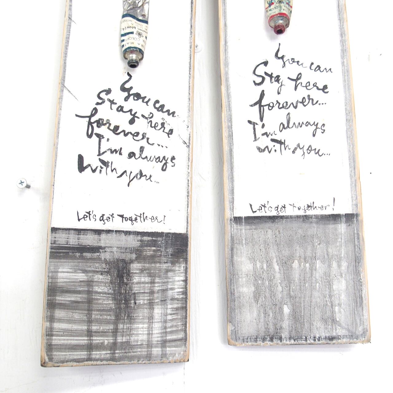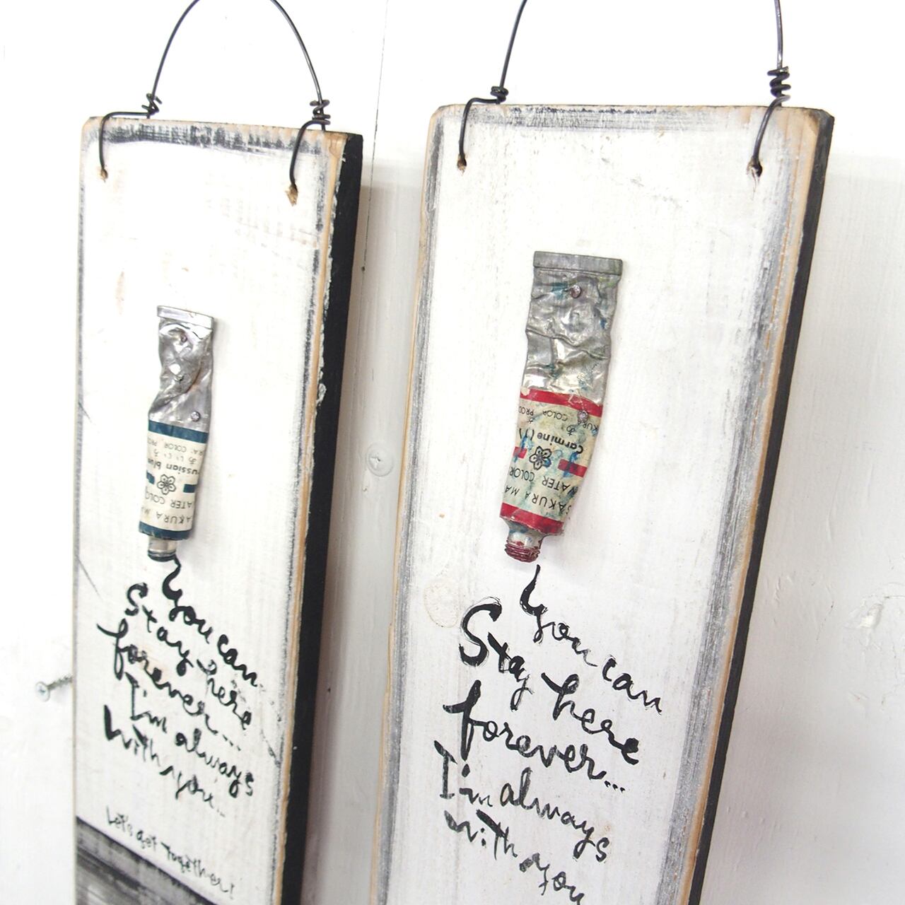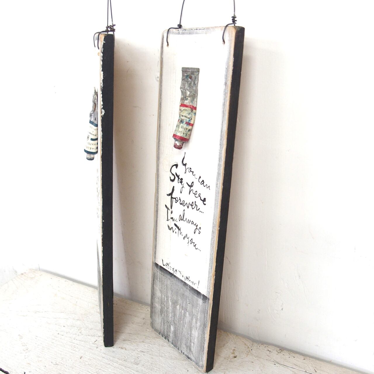 古く固まってしまった絵の具を板に固定して作ったディスプレイ用のボードです♪
