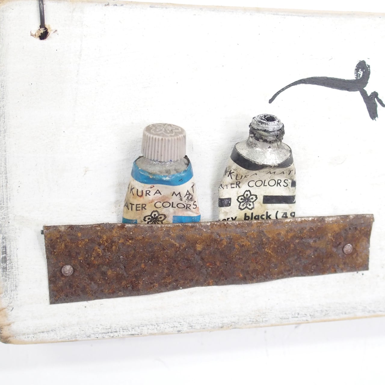 古く固まってしまった絵の具を板に固定して作ったディスプレイ用のボードです♪