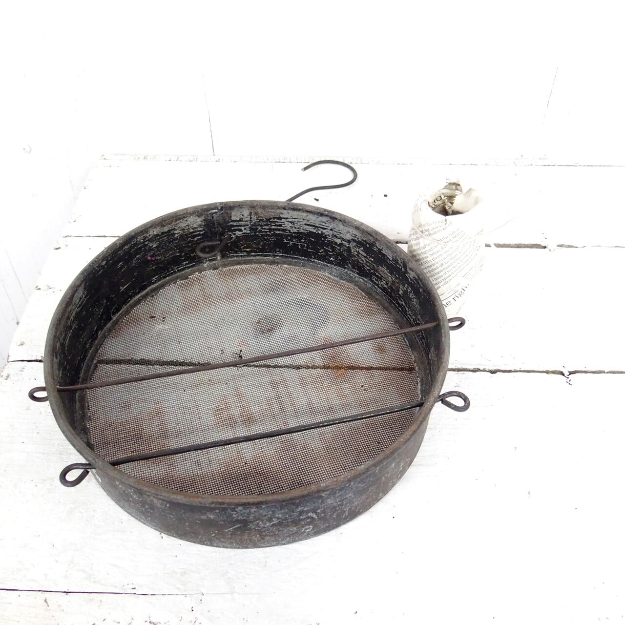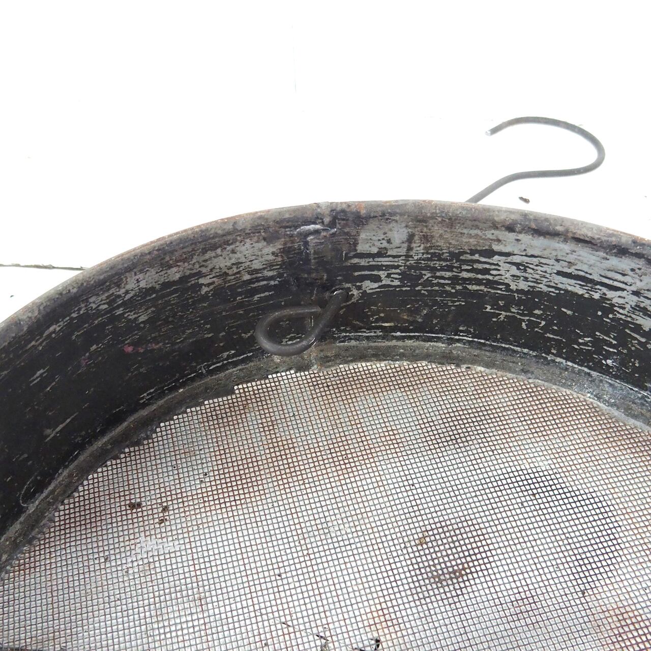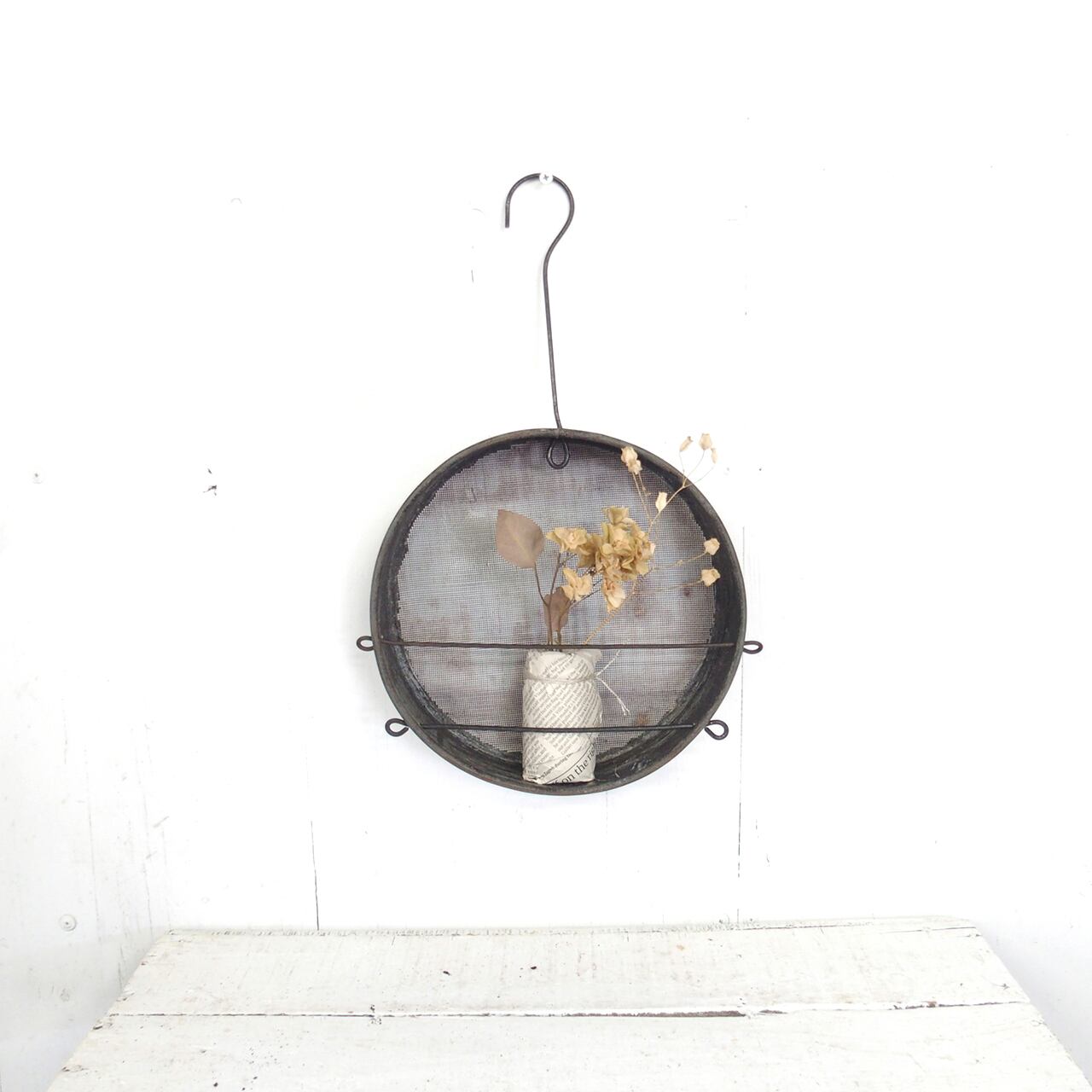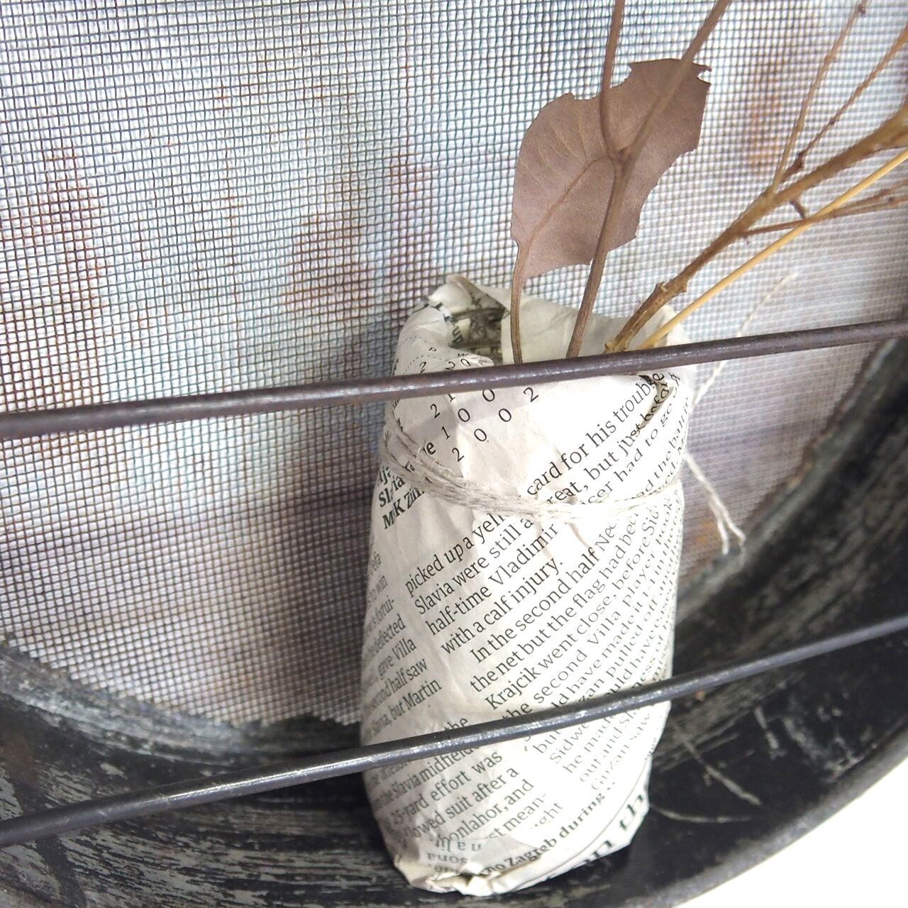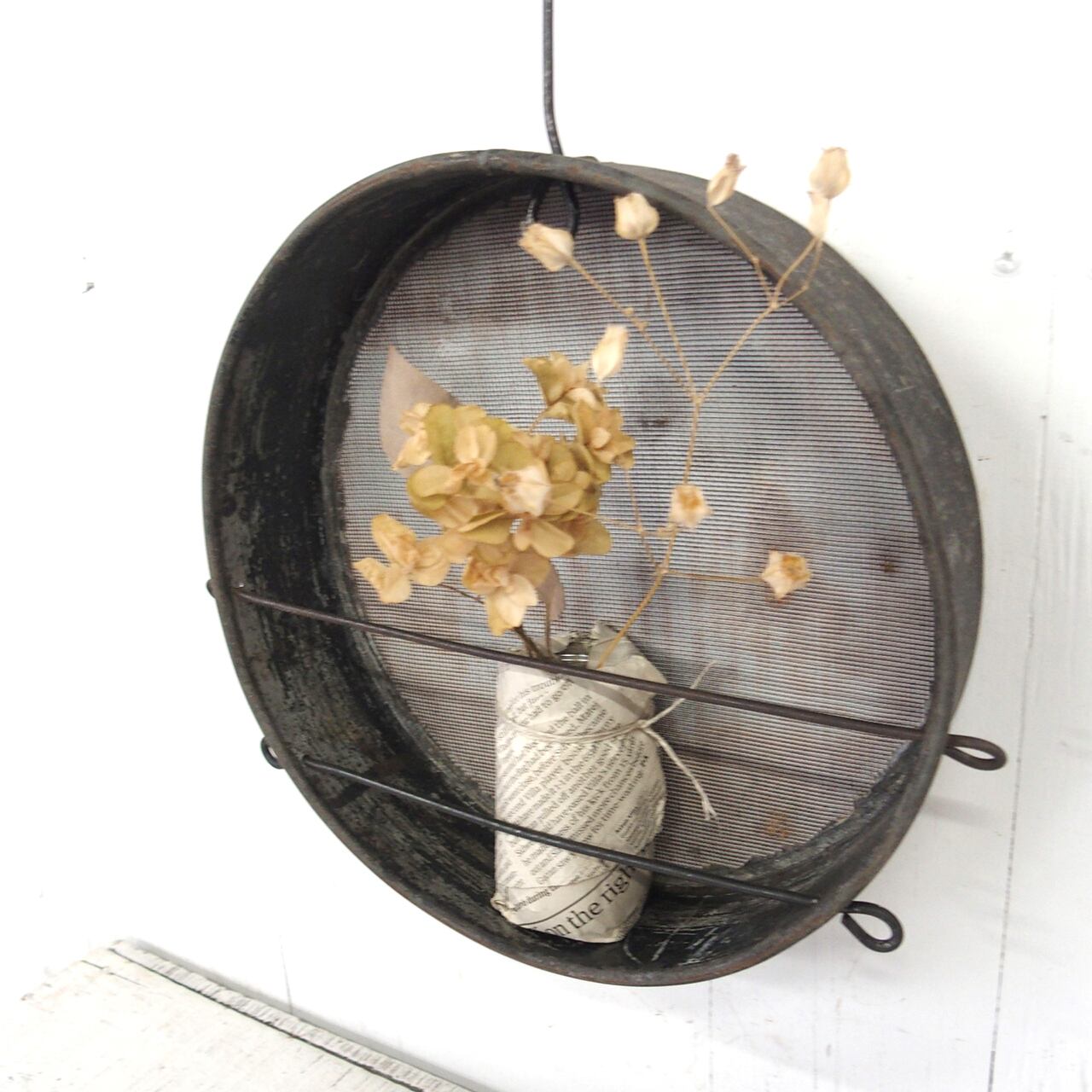 古いフルイに針金を通し小瓶を乗せたフラワーベースです♪