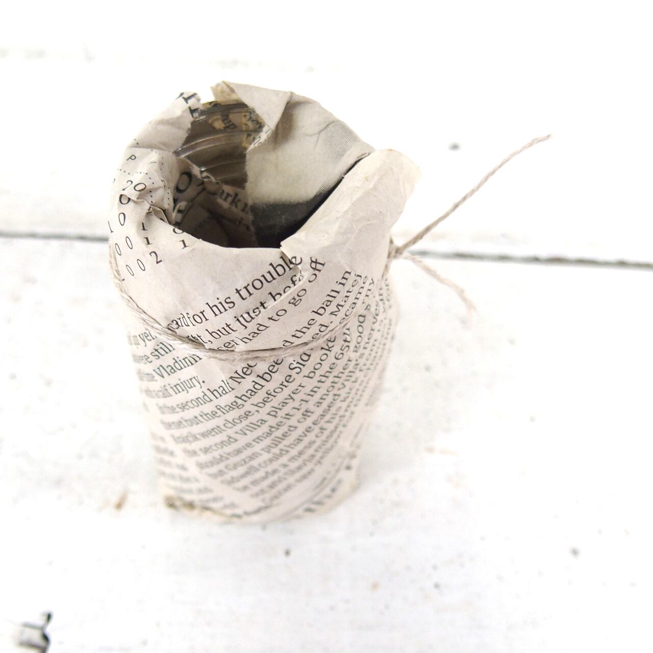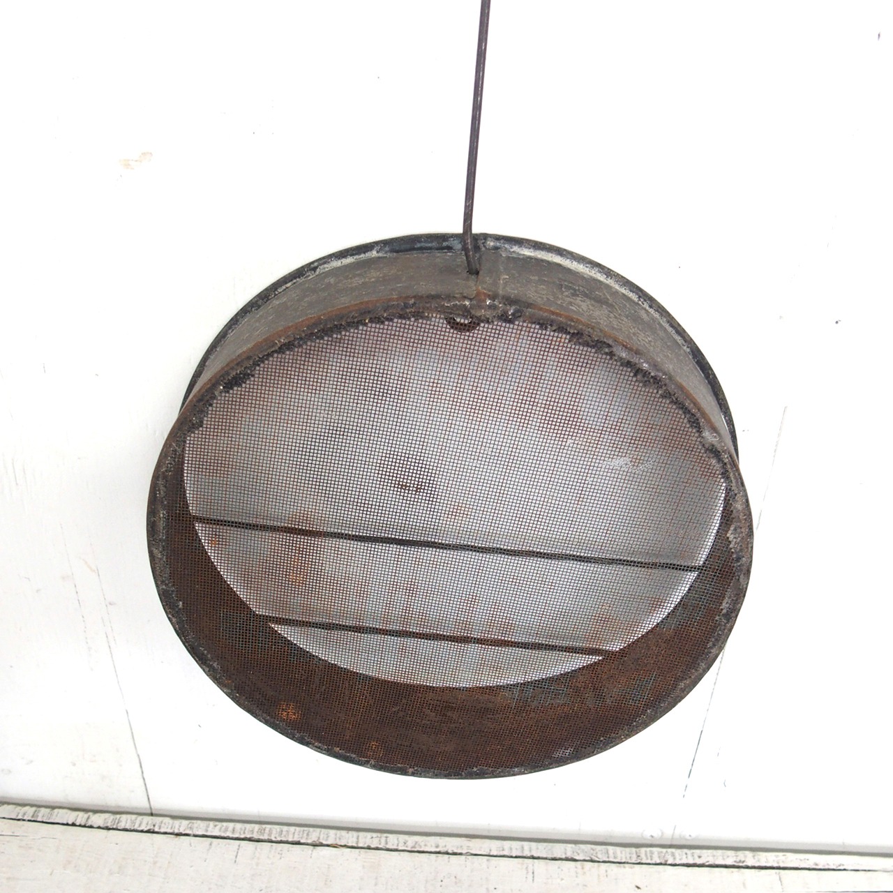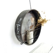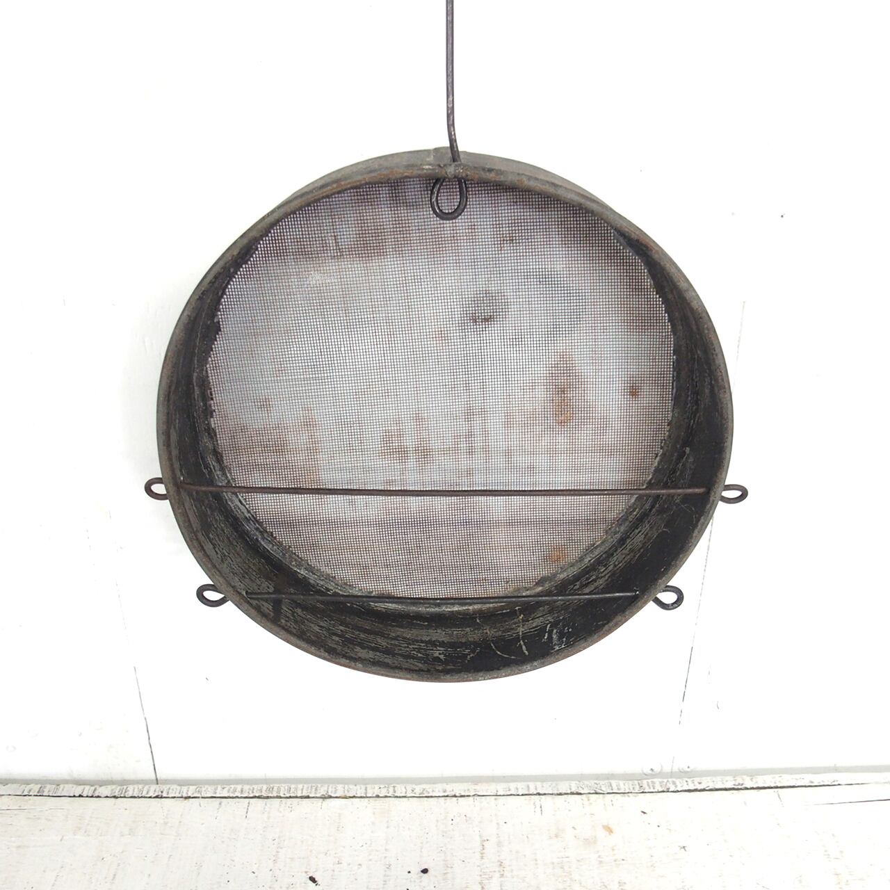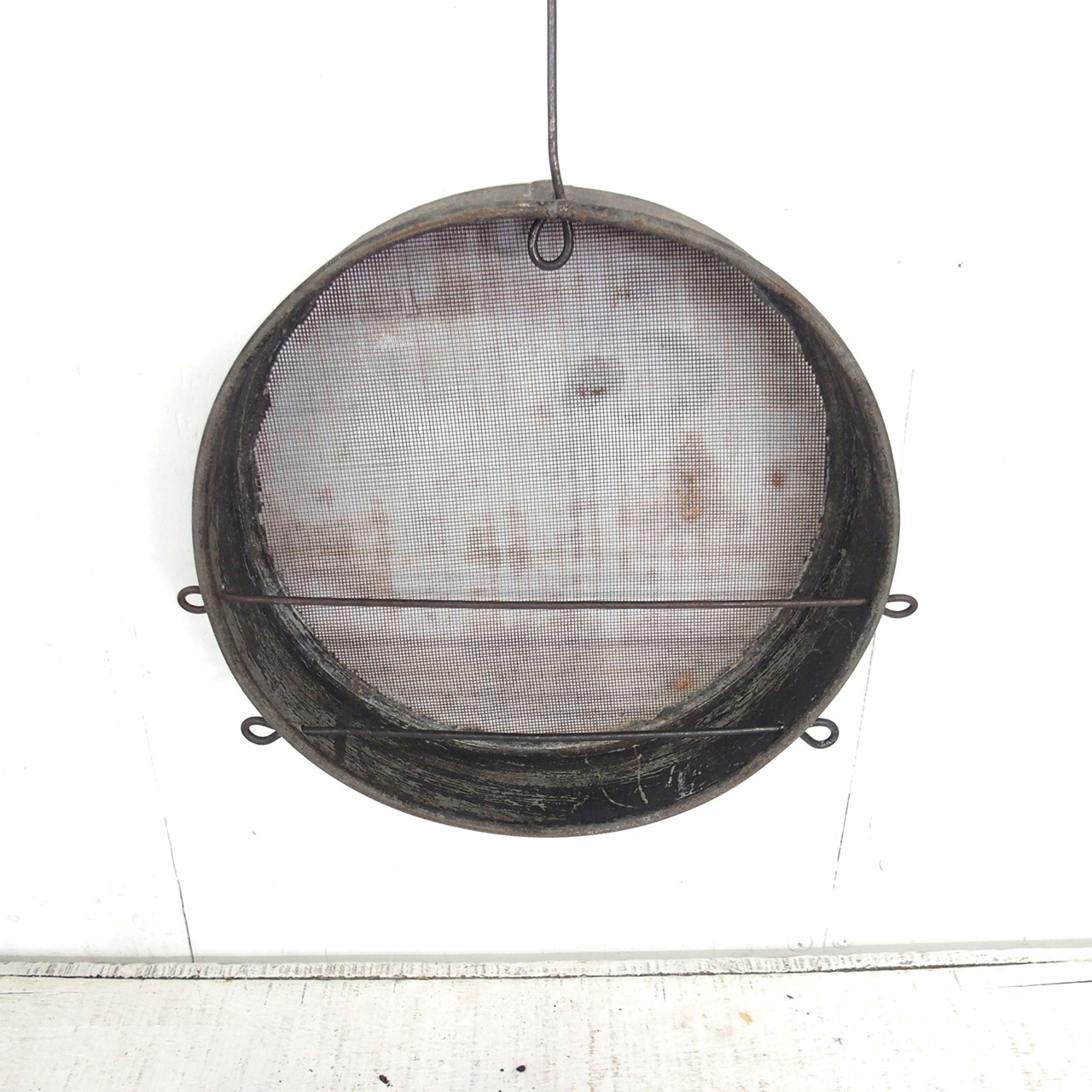 古いフルイに針金を通し小瓶を乗せたフラワーベースです♪