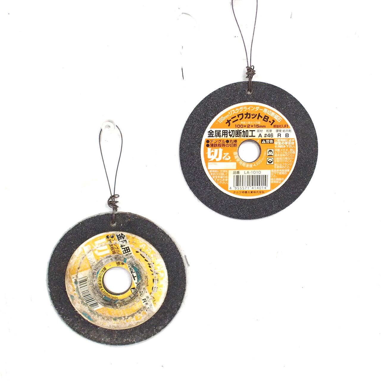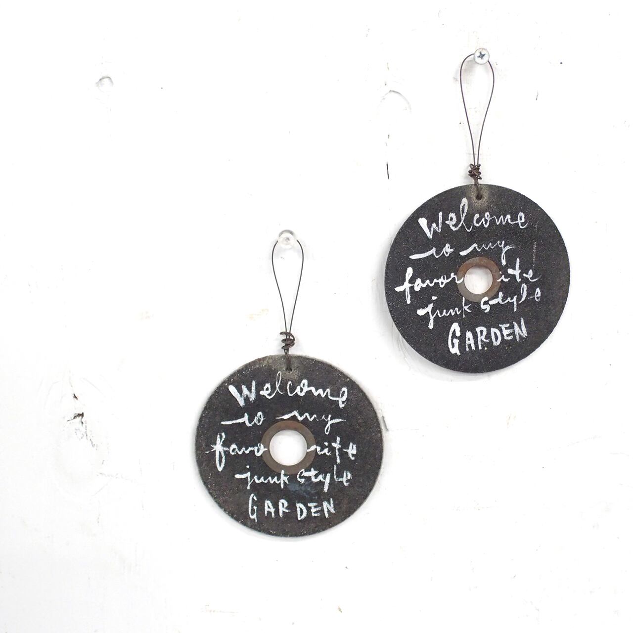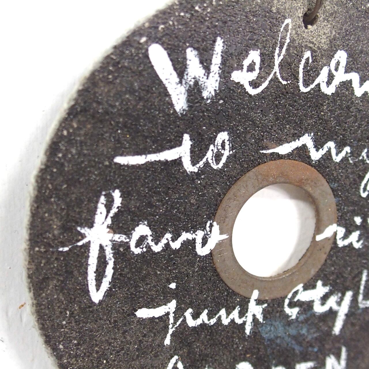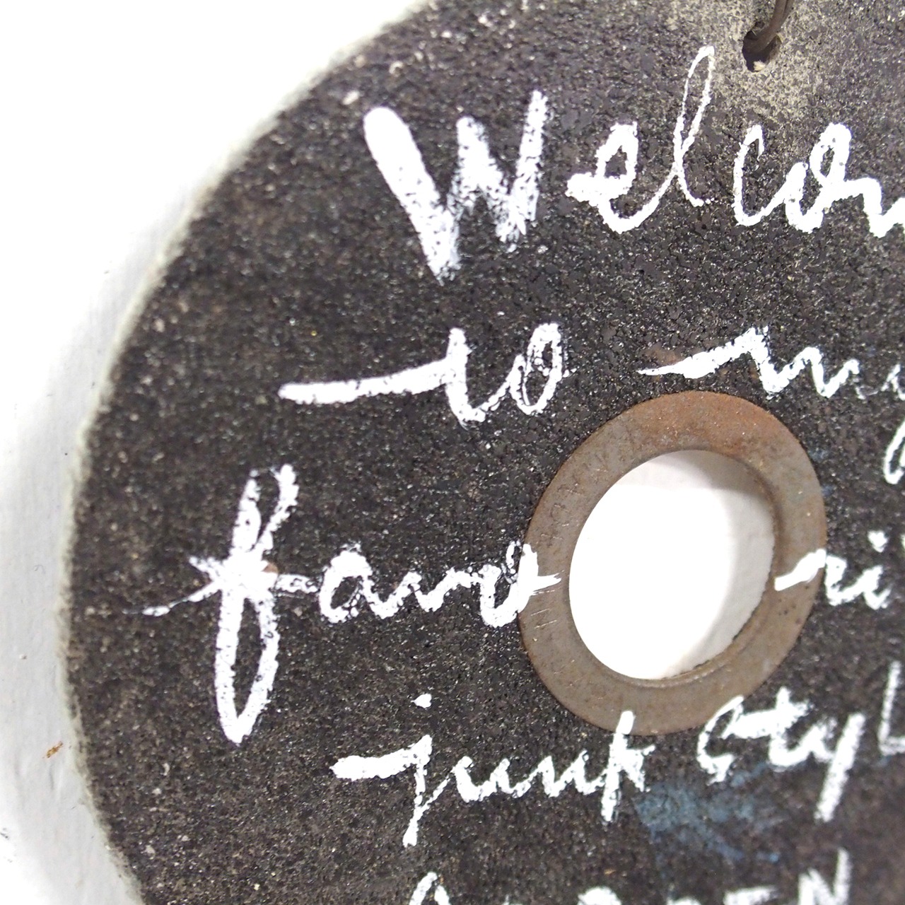 使い古されたディスクグラインダー用の切断砥石に文字を入れたサインです♪