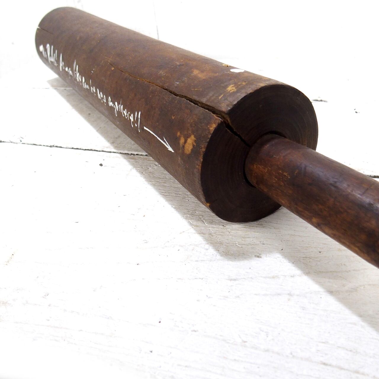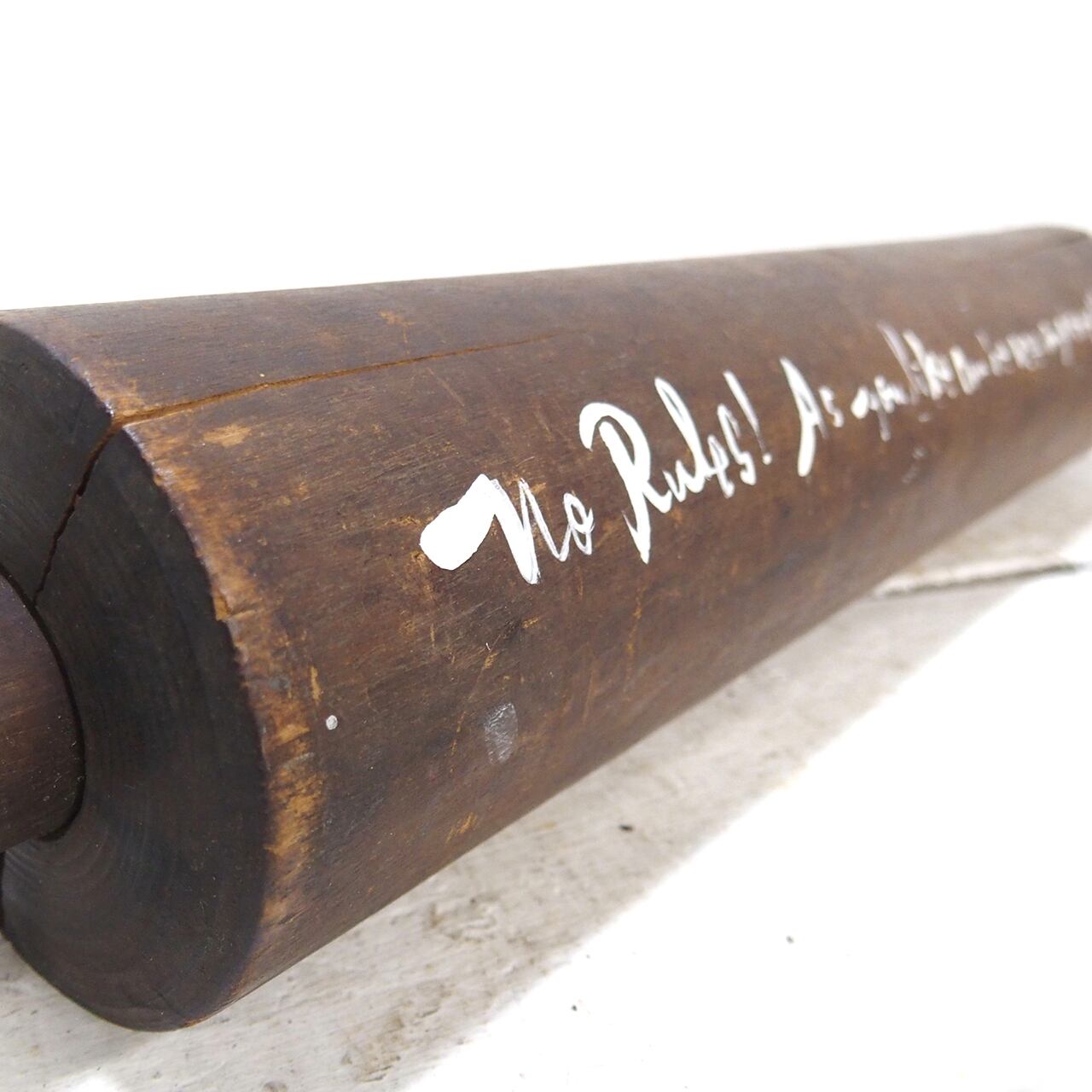古くて良い木味の出た面棒(のし棒)に文字を入れただけの
