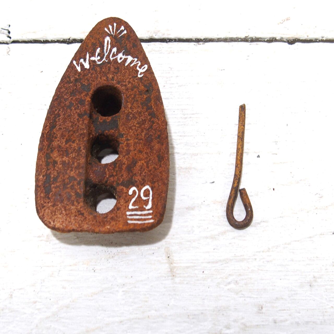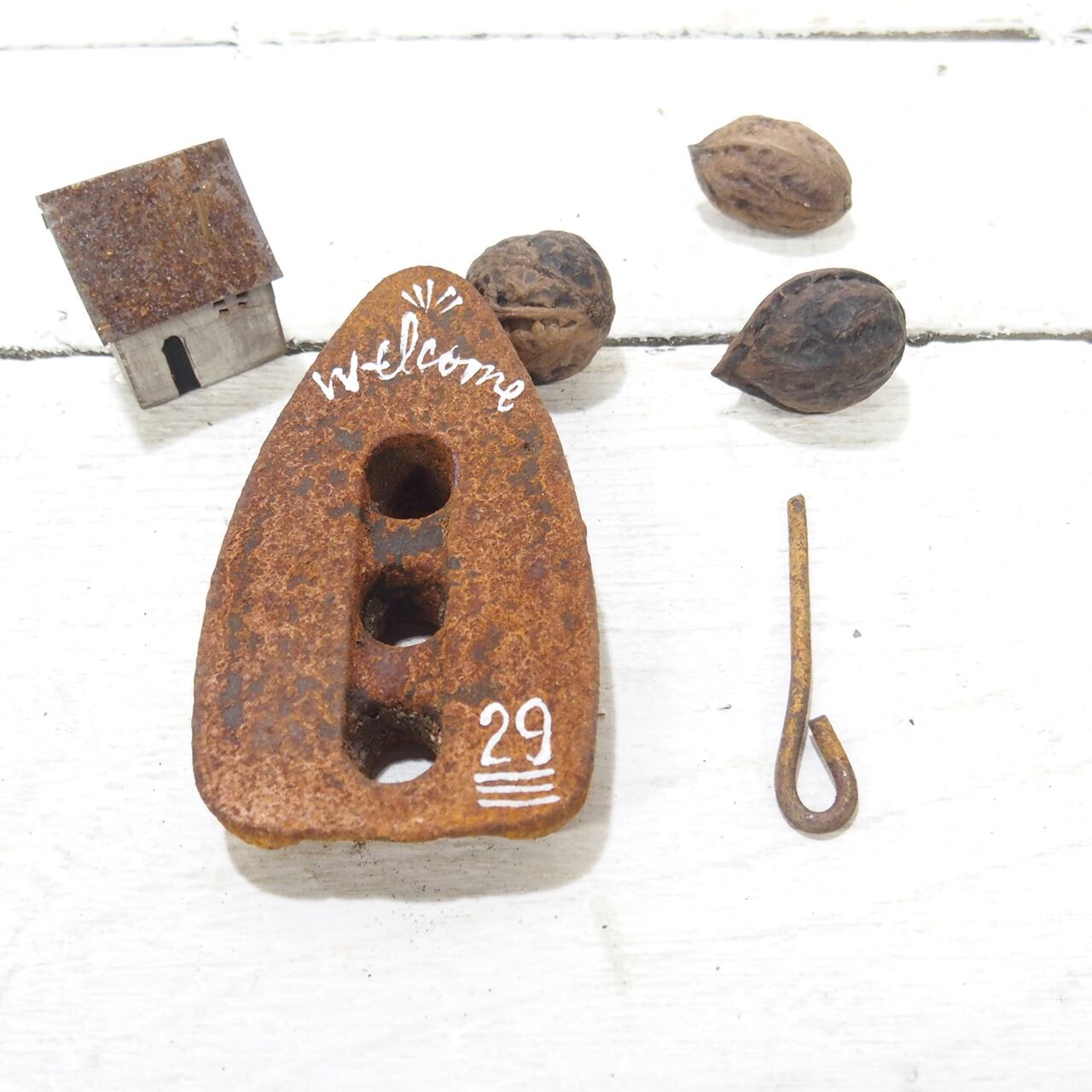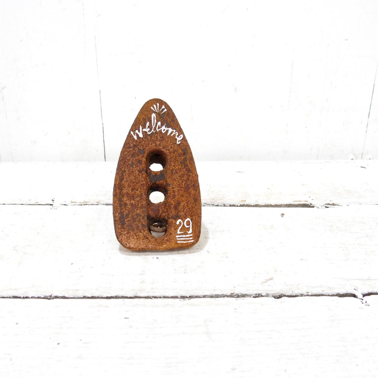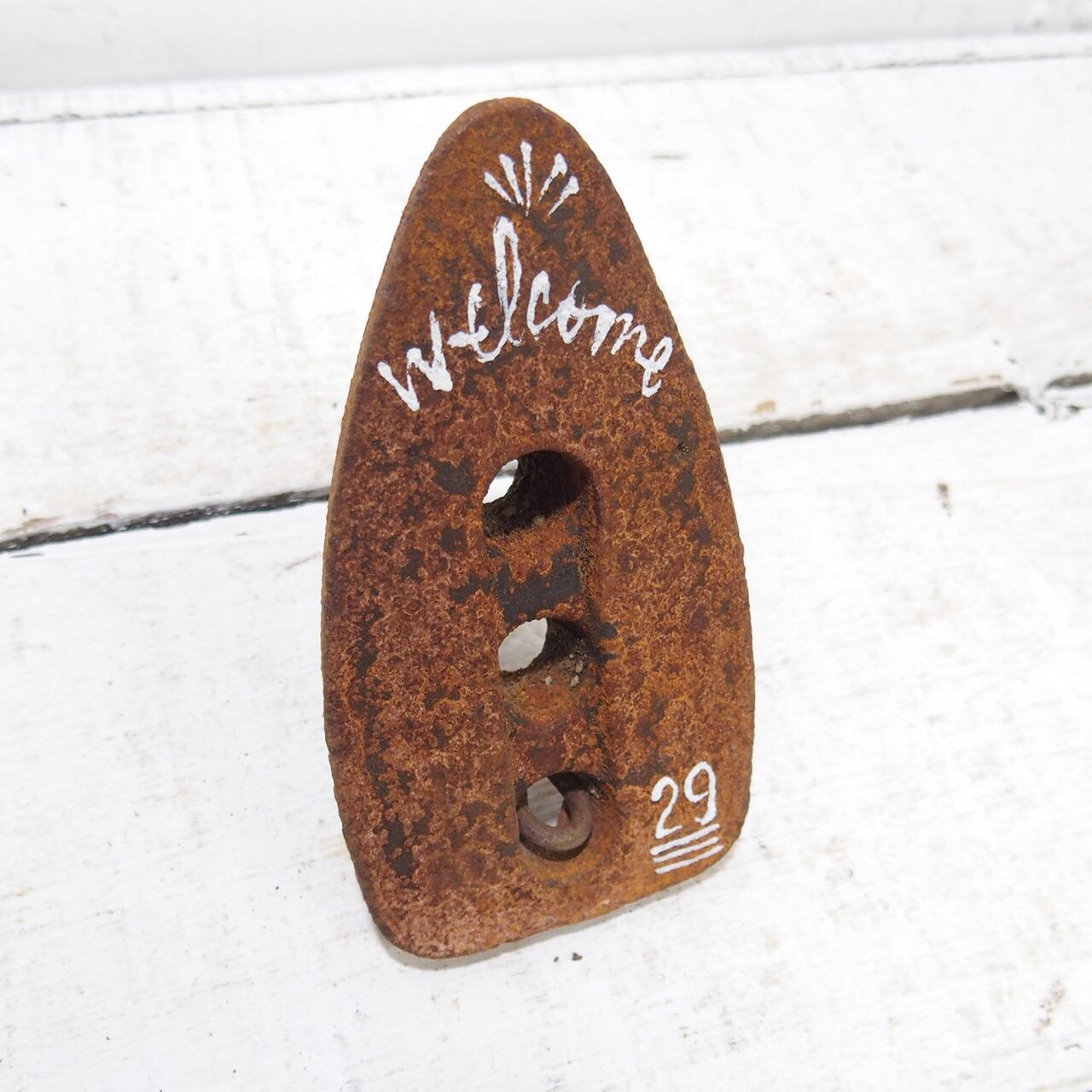 サビサビの古いアイロンに文字を入れたガーデンサインです。