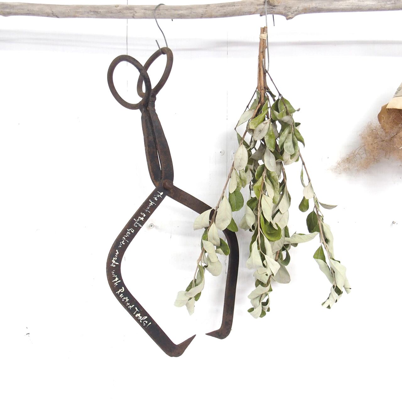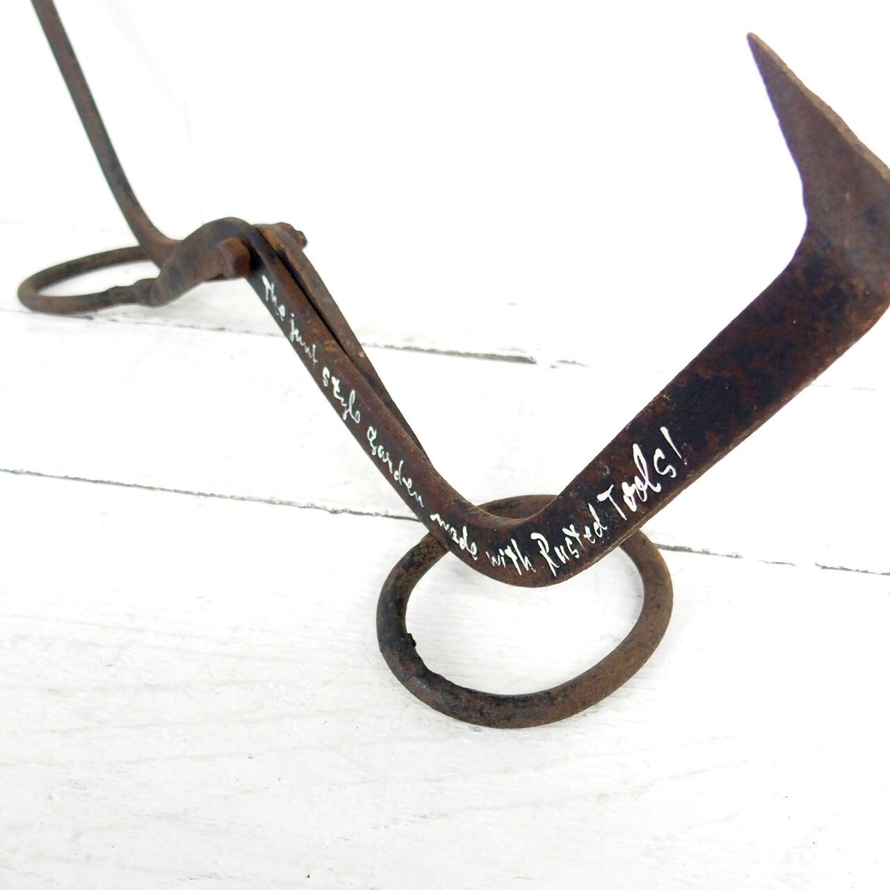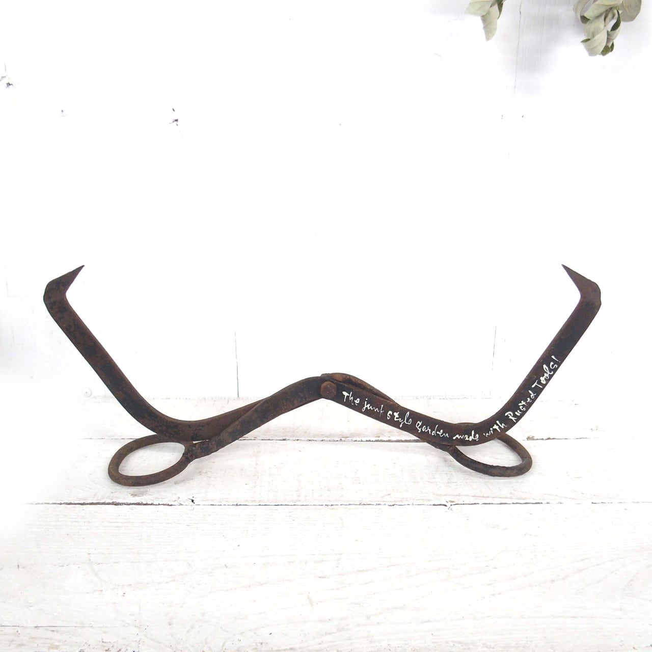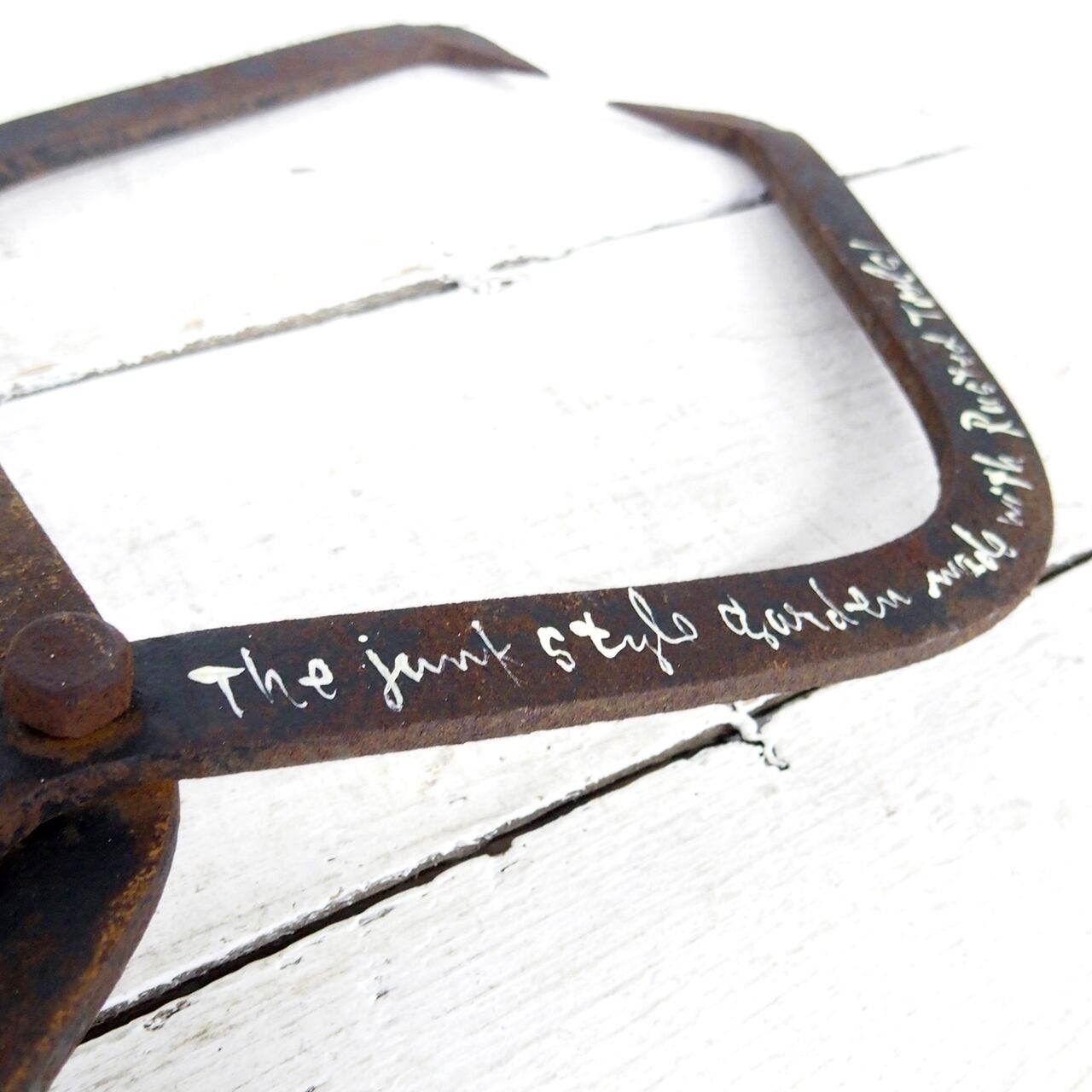 古い丸太を挟む道具に文字を入れたガーデンサインです♪