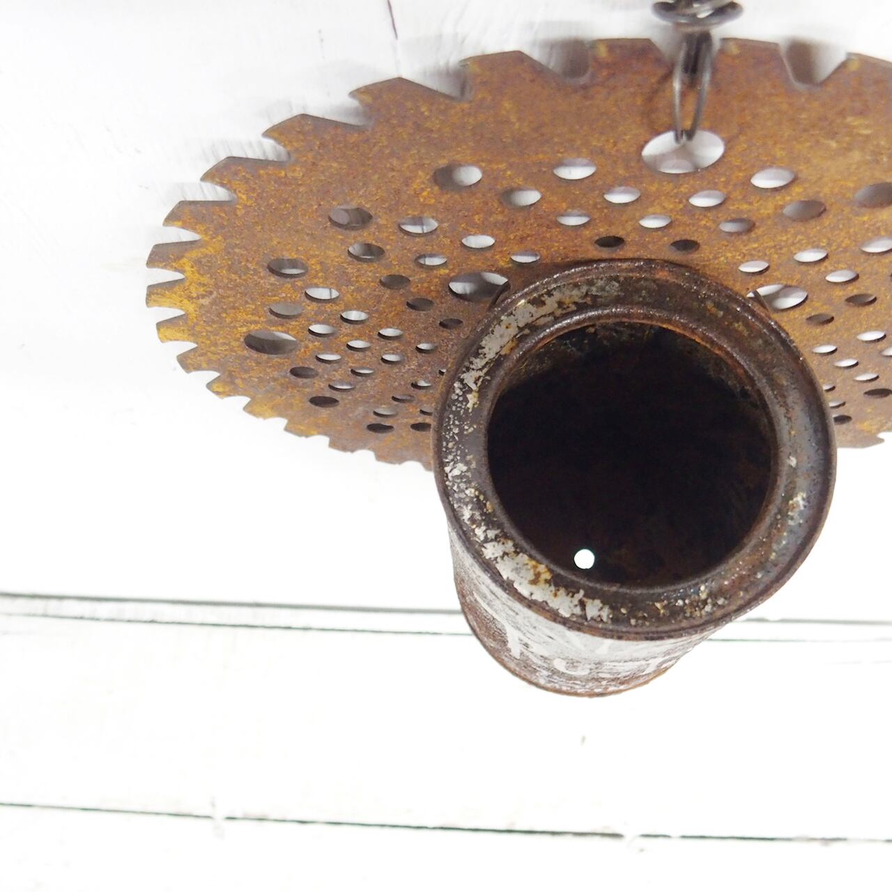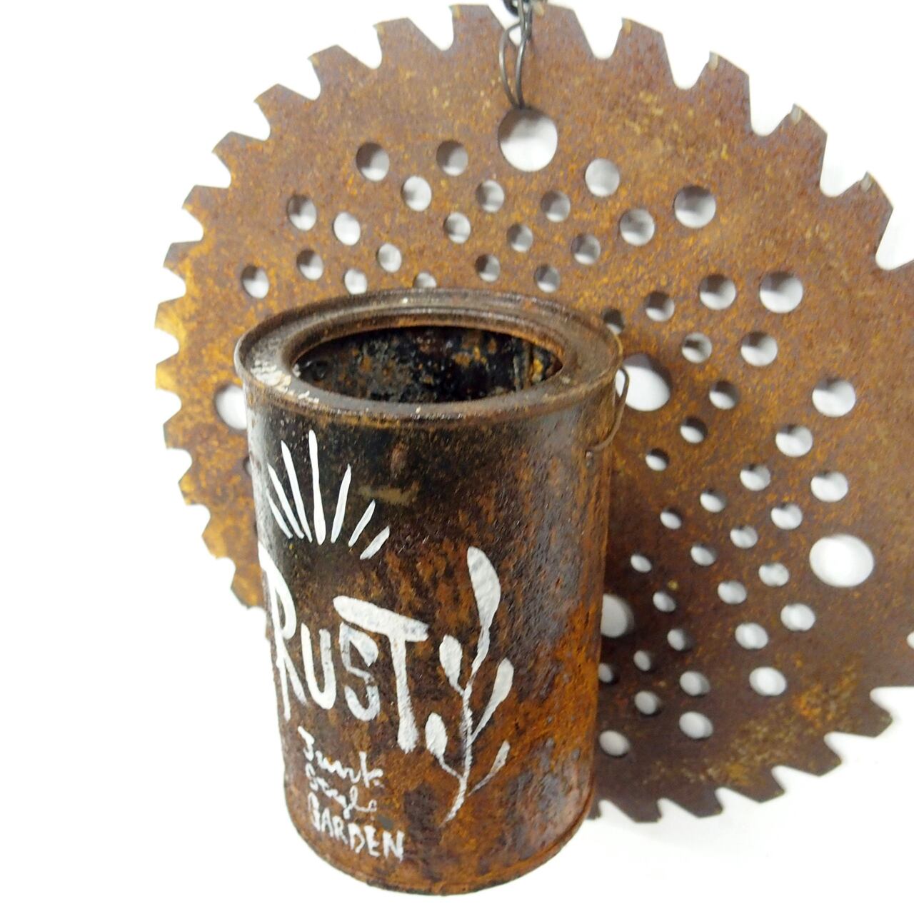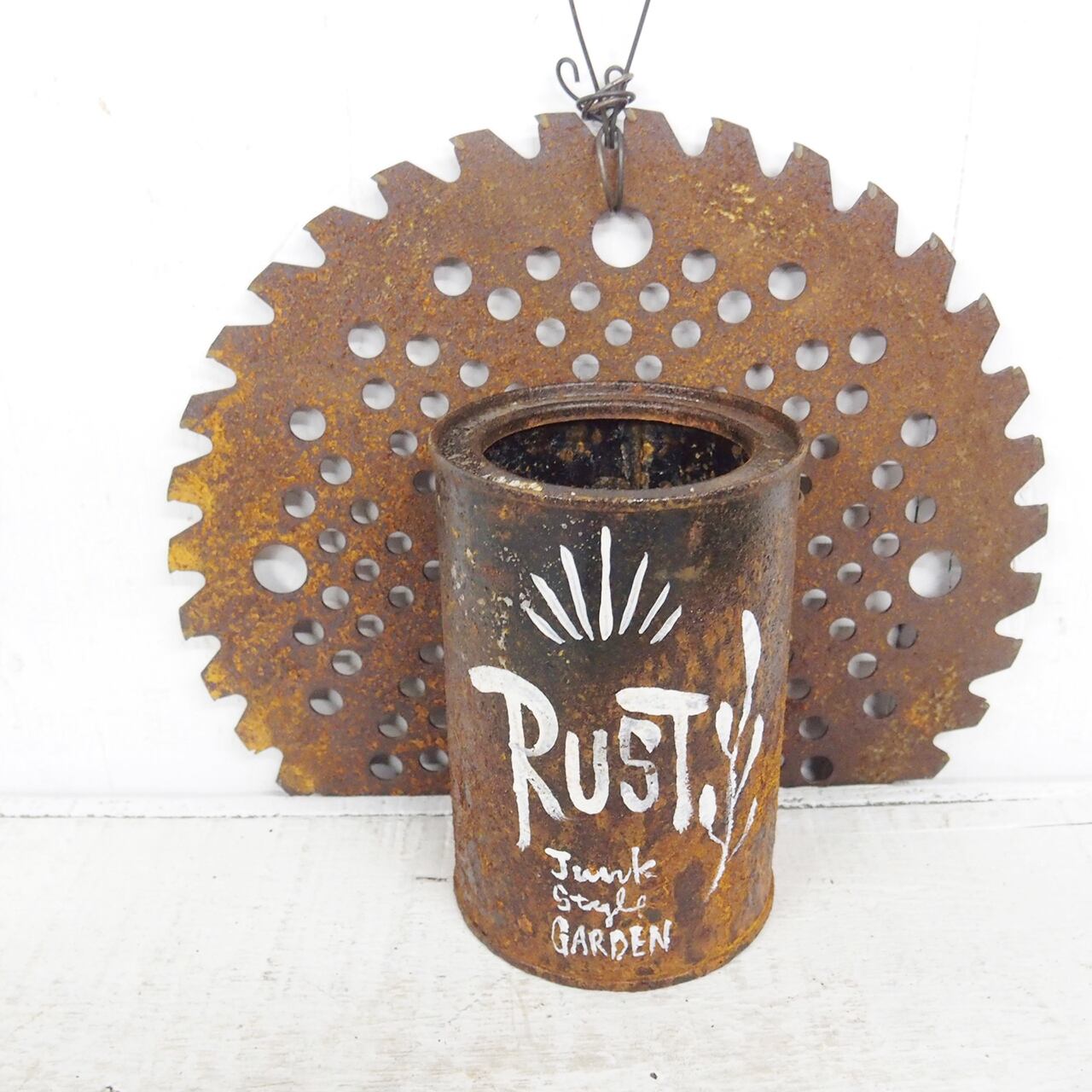 サビサビのブレードにペンキ缶風リメ缶を固定したハンギングプランターです♪