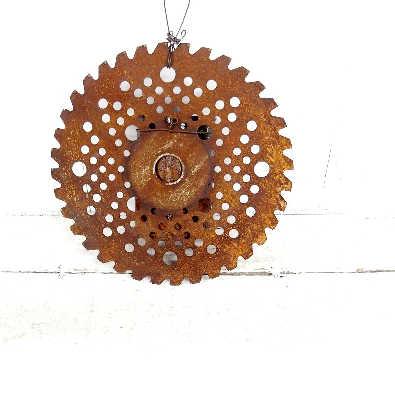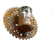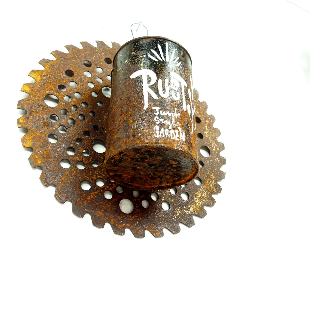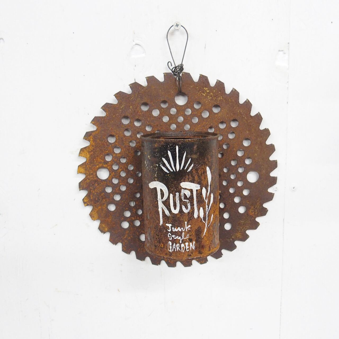 サビサビのブレードにペンキ缶風リメ缶を固定したハンギングプランターです♪