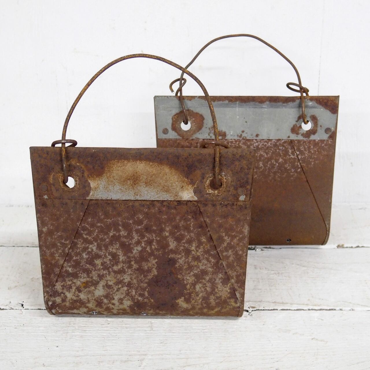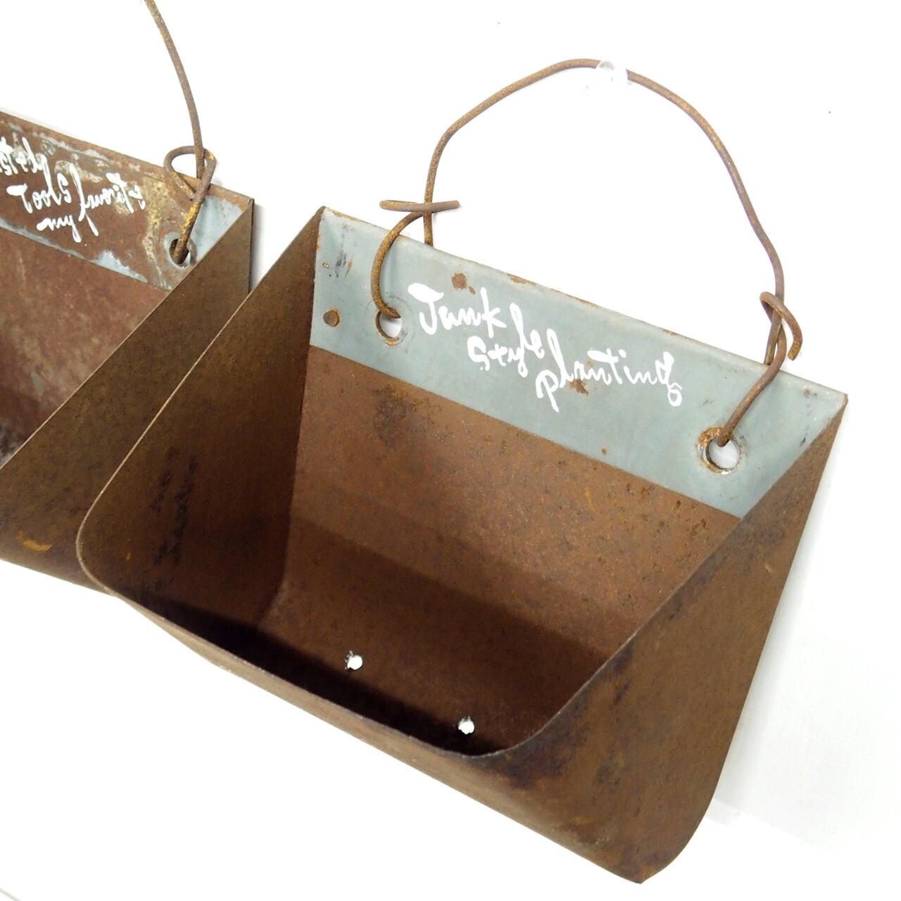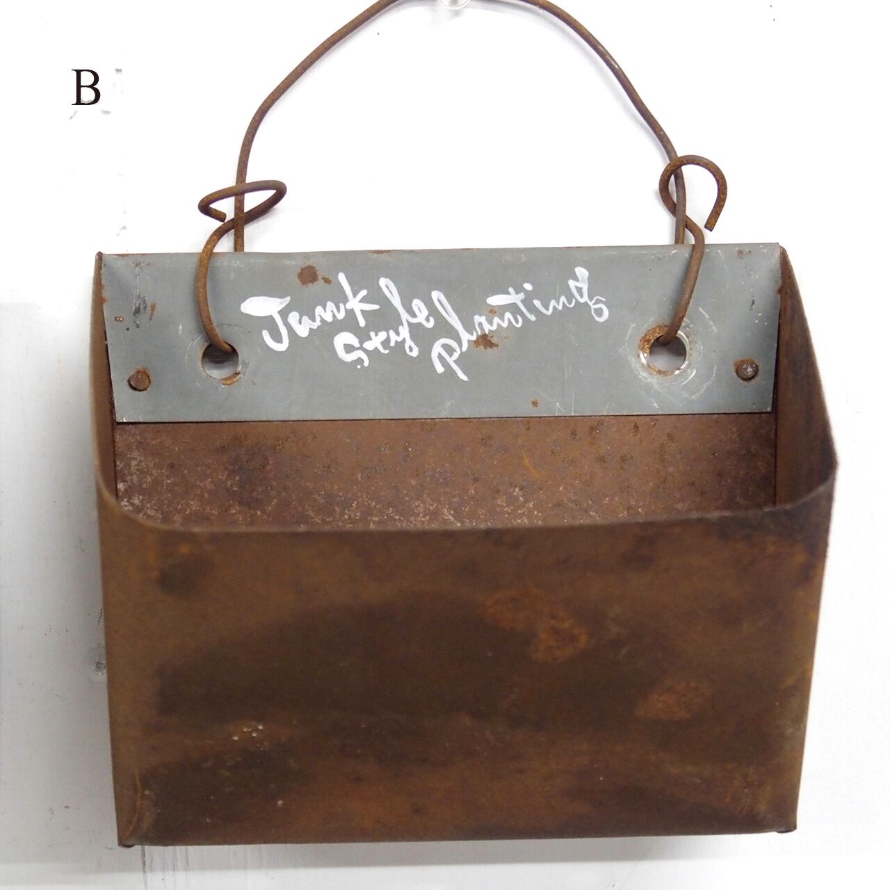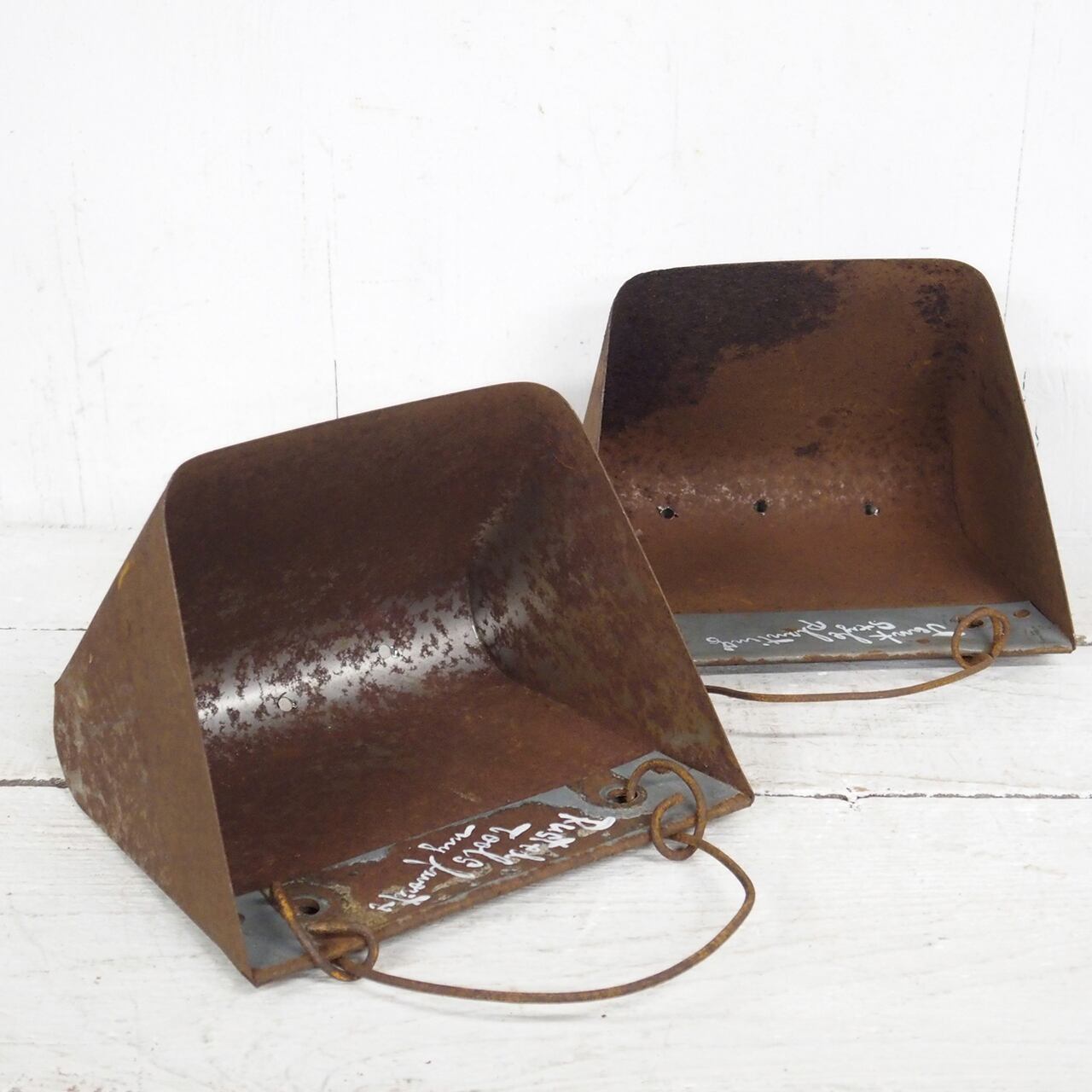 農機具に使われていたバケットベルトのバケット部分だと思われるサビサビの材料にフックを付けて底穴をあけたハンギングプランターです♪