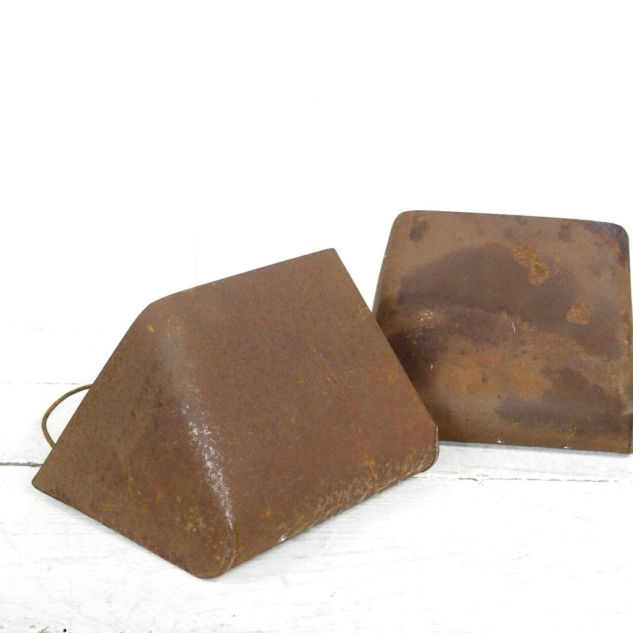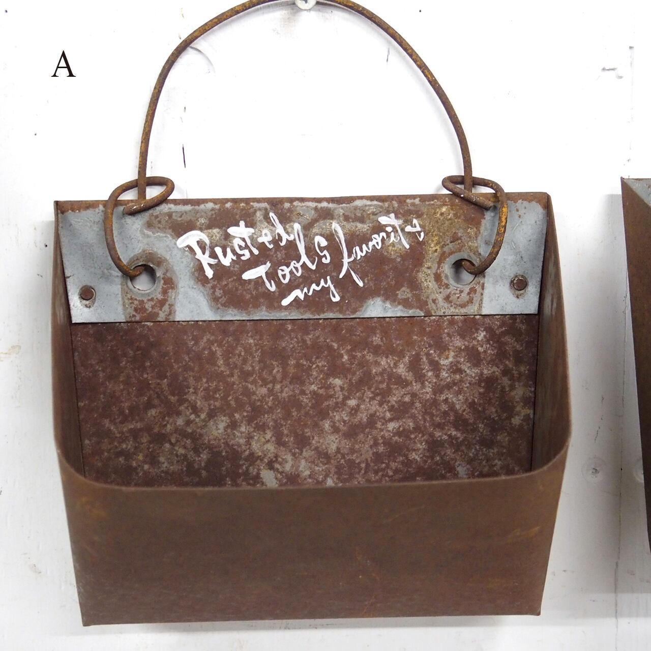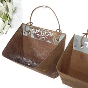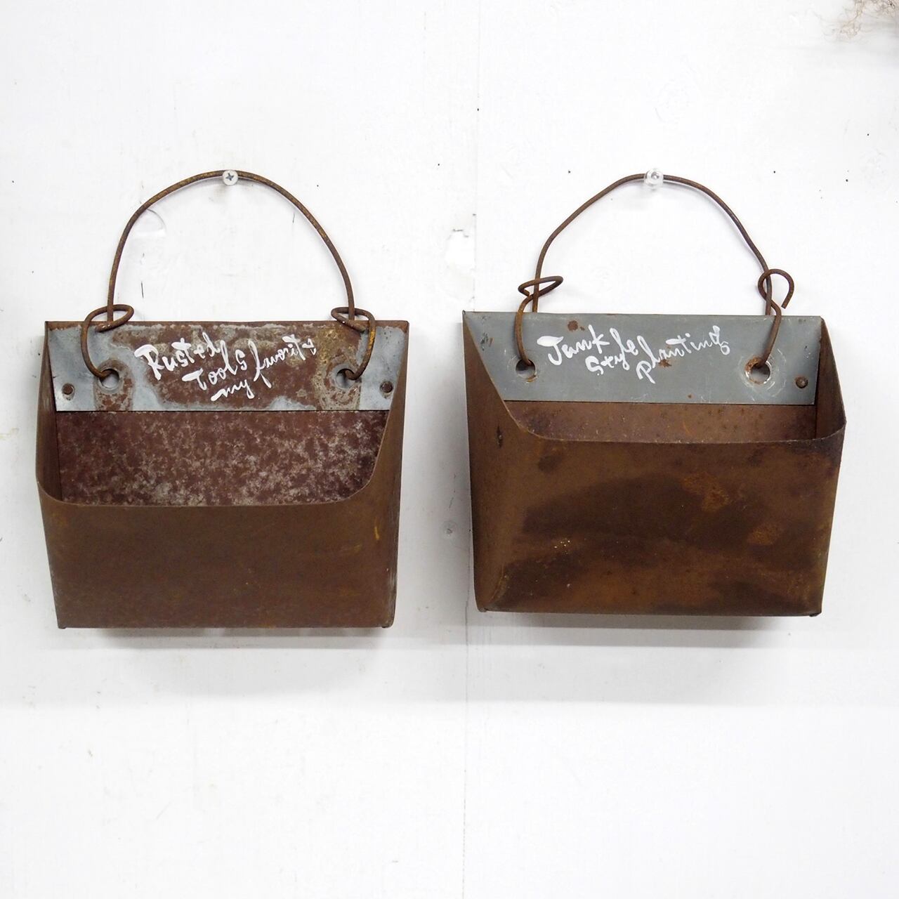 農機具に使われていたバケットベルトのバケット部分だと思われるサビサビの材料にフックを付けて底穴をあけたハンギングプランターです♪