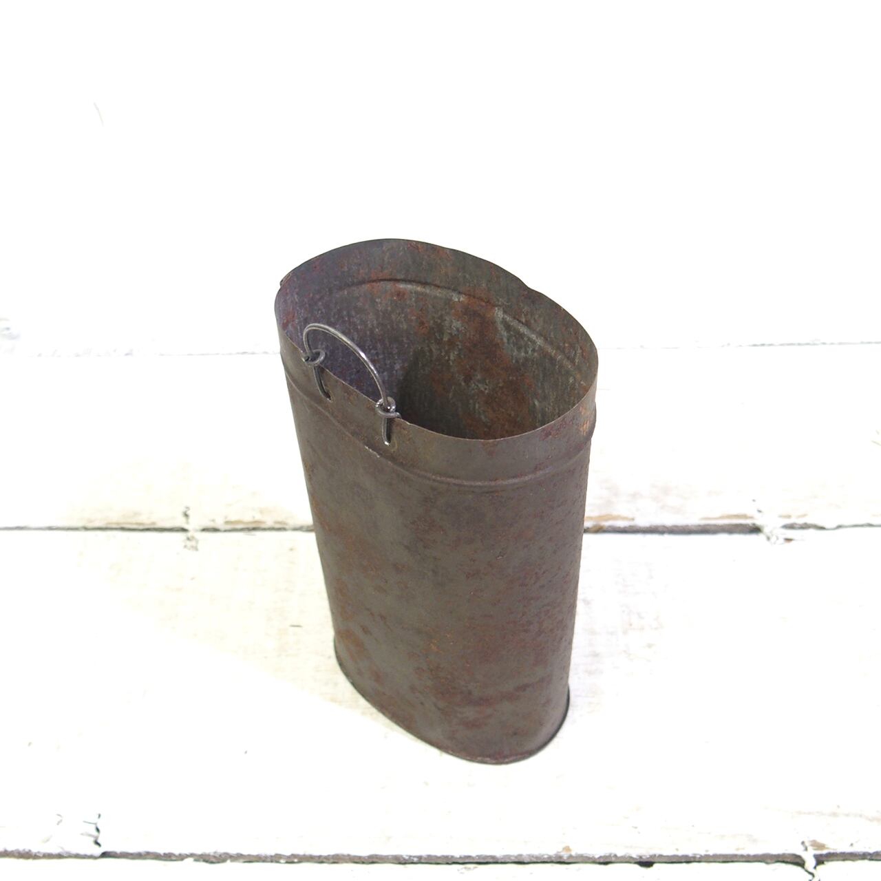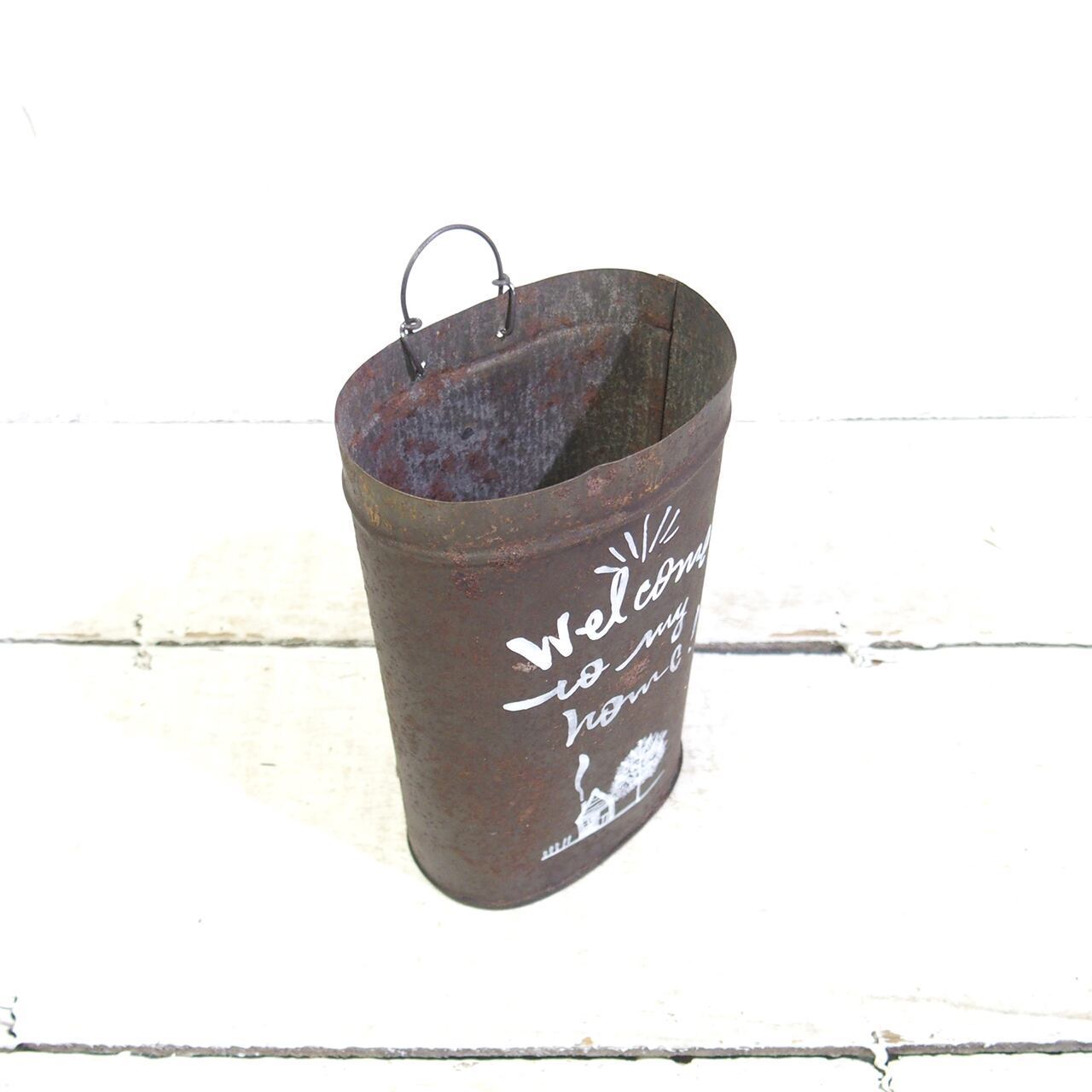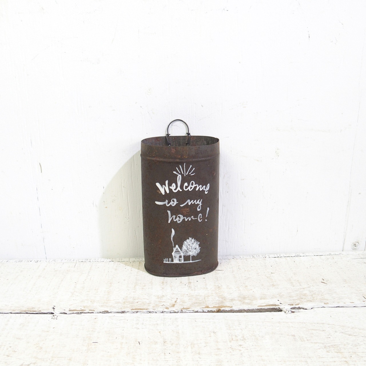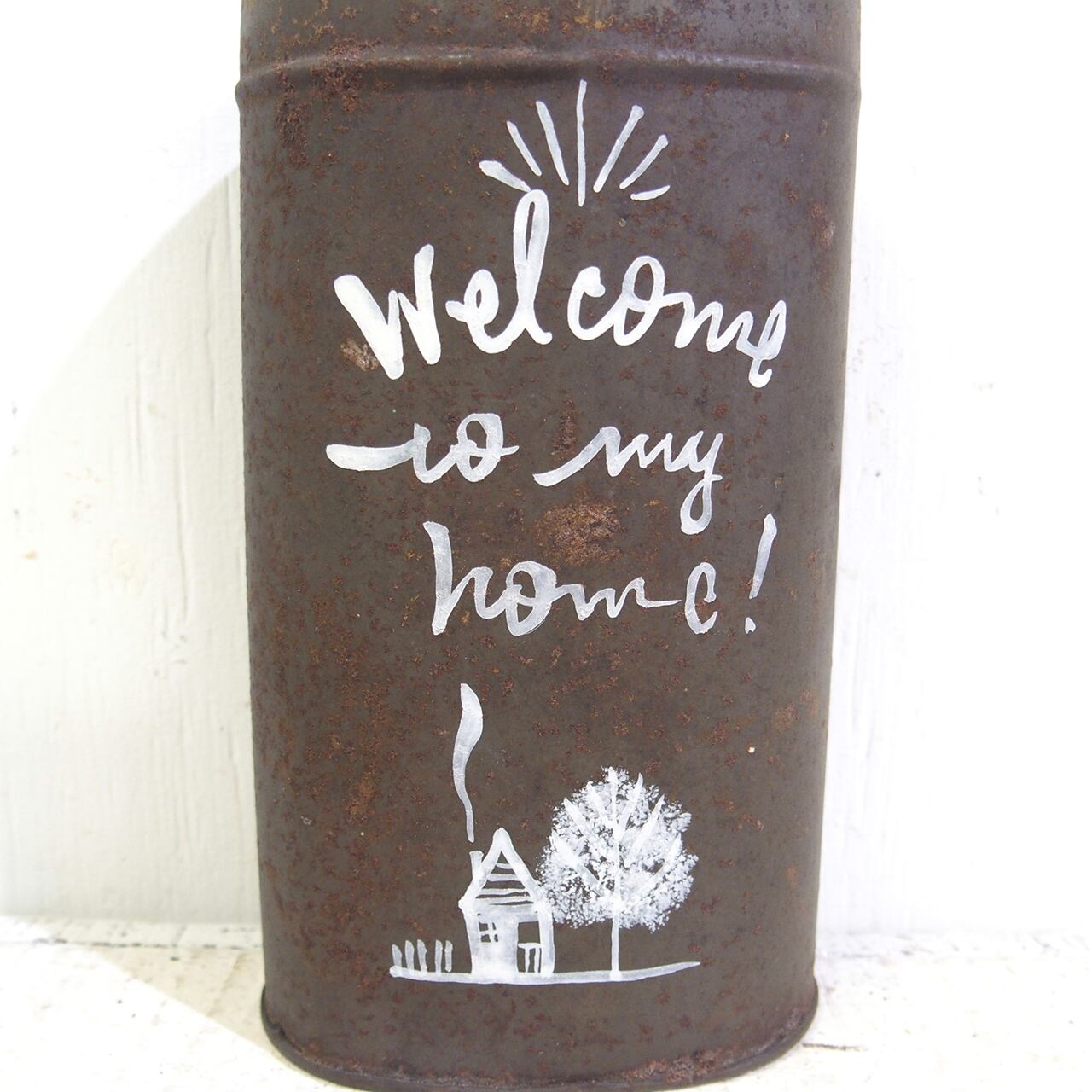 楕円形のサビサビの缶に絵と文字入れたプランターです♪