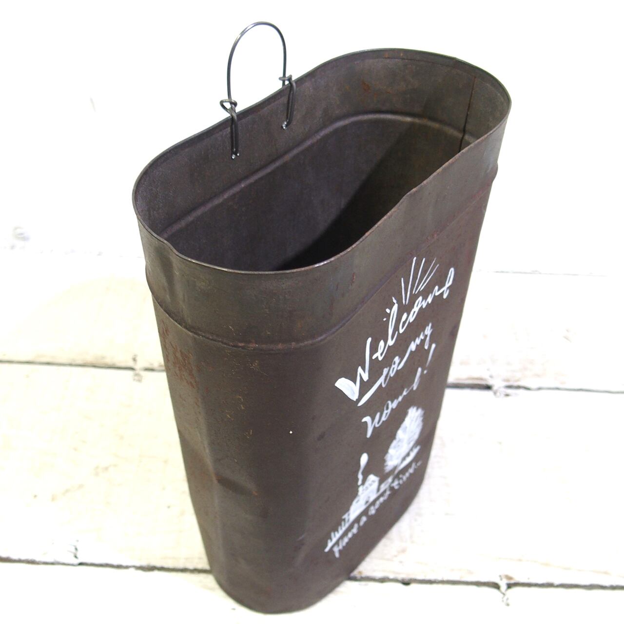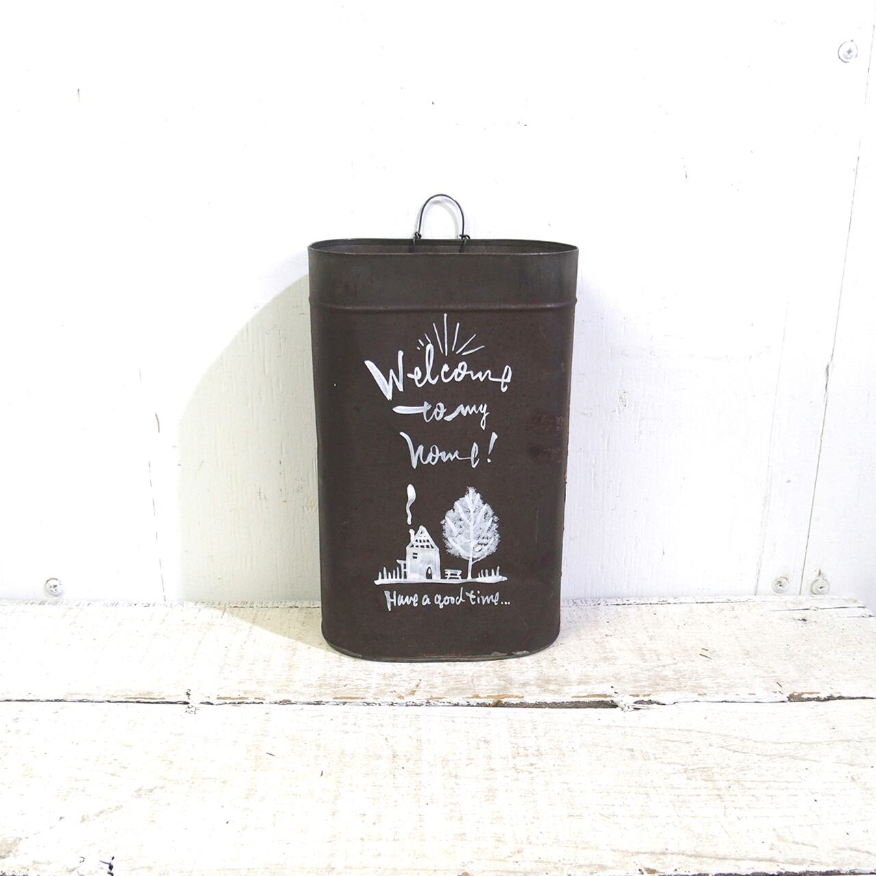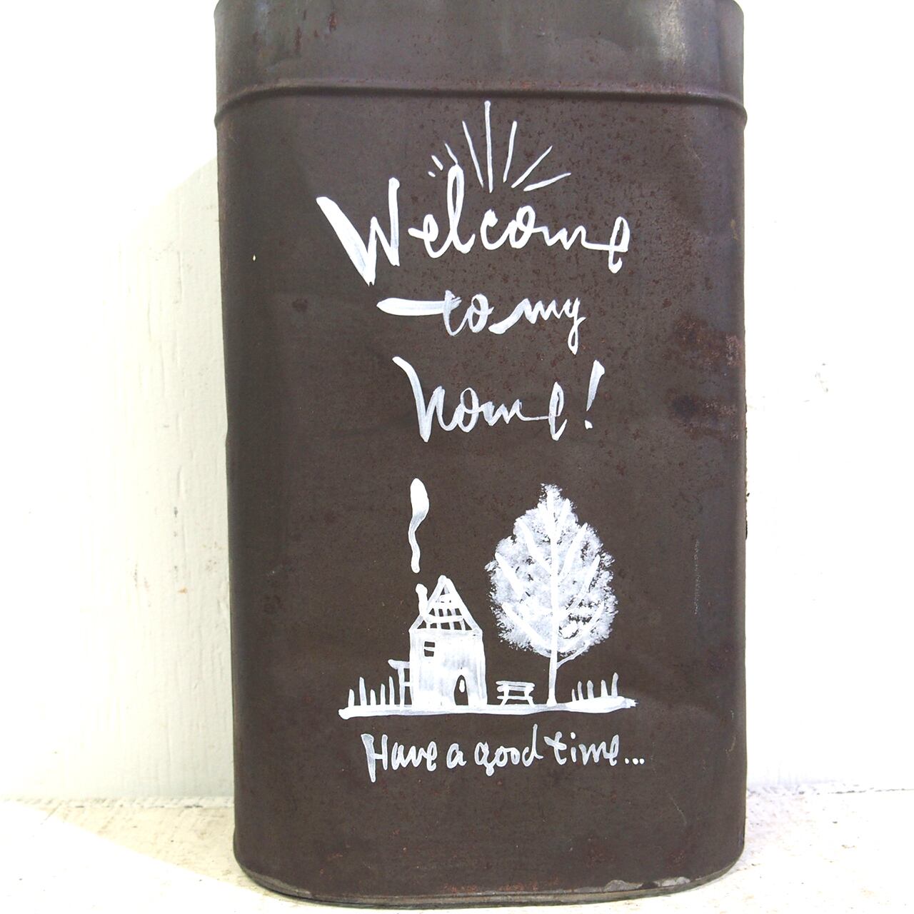 楕円形のサビサビの缶に絵と文字入れたプランターです♪