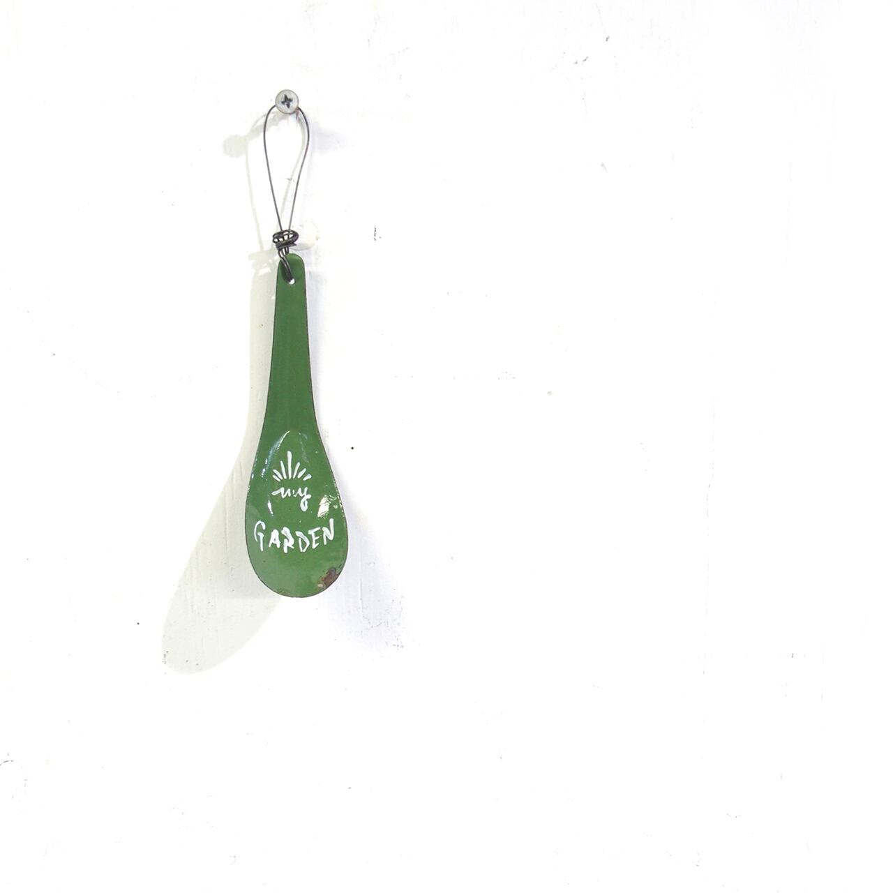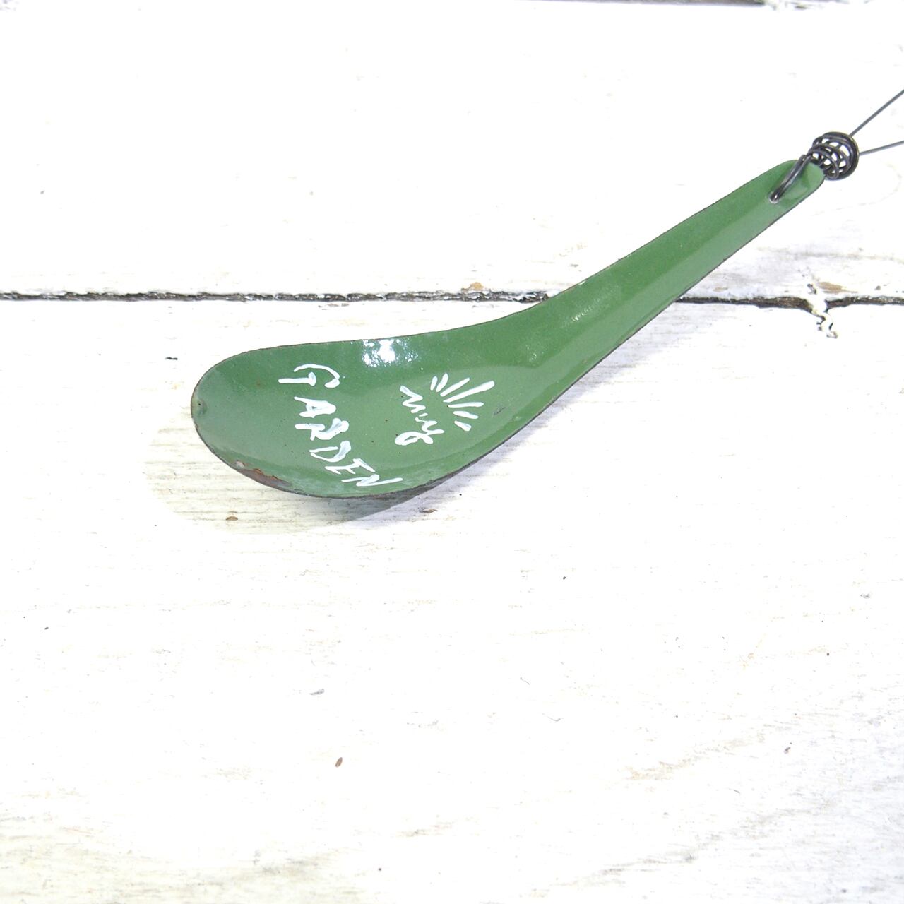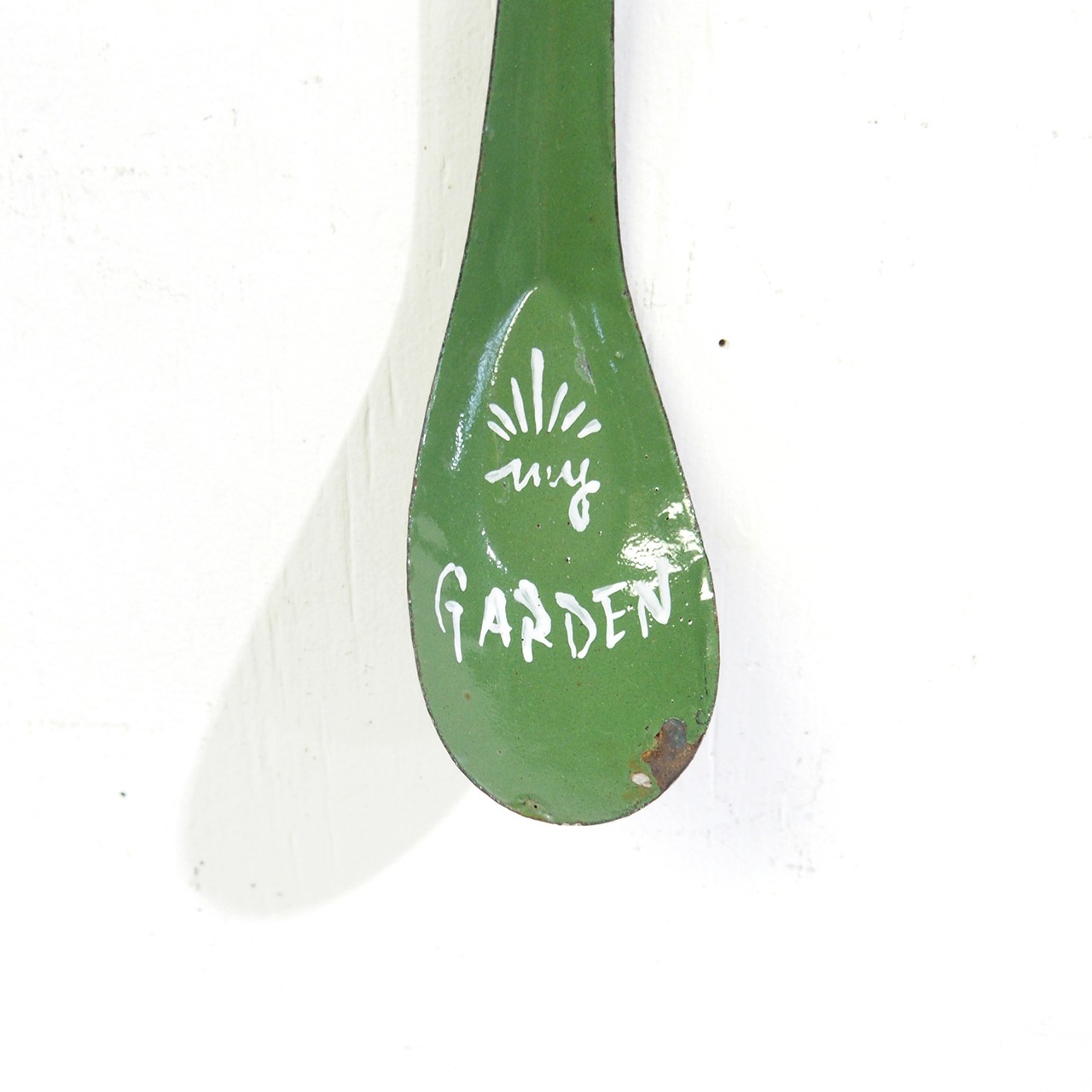 古いホーローのレンゲに文字を入れたガーデンオーナメントです。