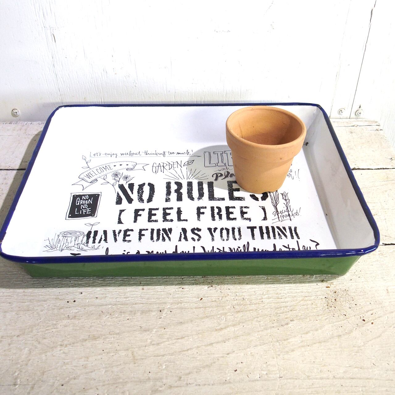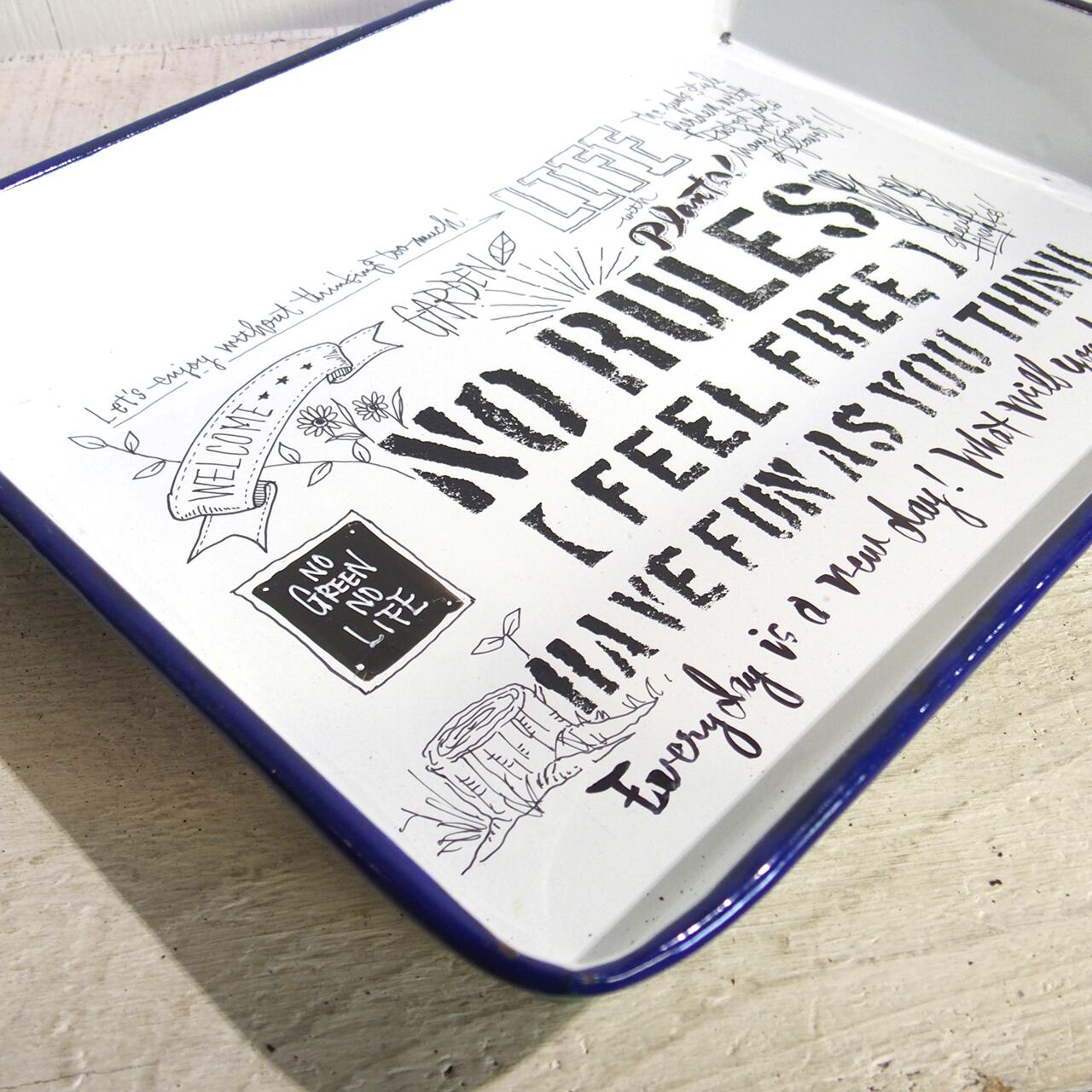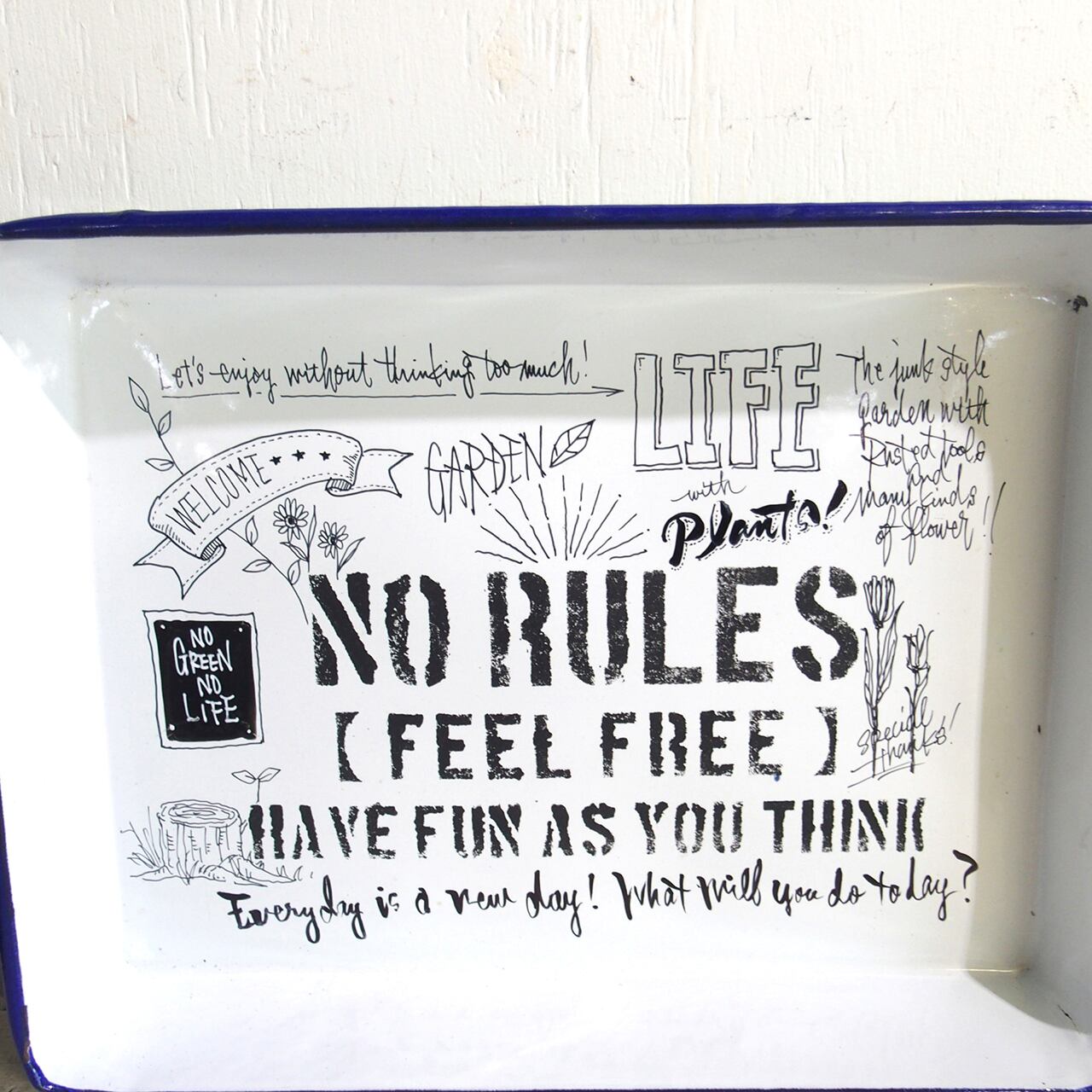 ホーローのバットに文字とイラストを入れたアレンジ作品です♪